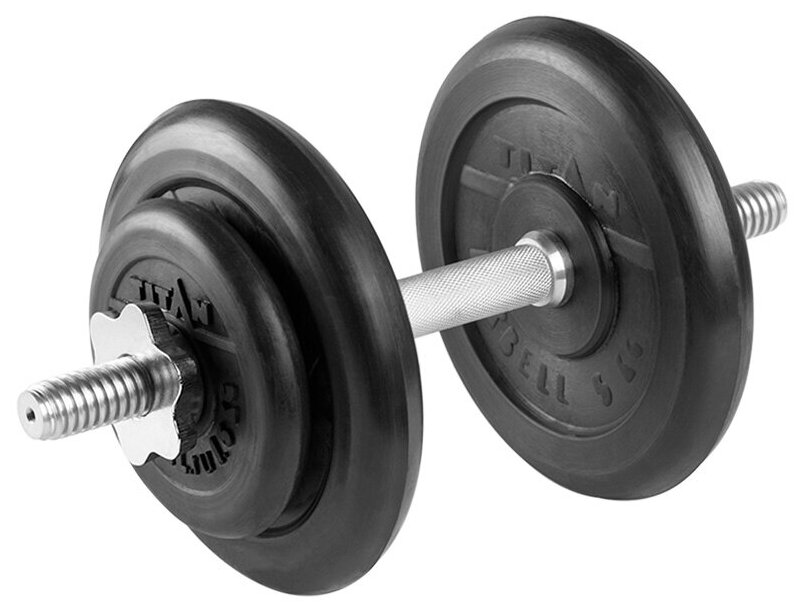 Type: dumbbell, design: collapsible, dumbbell shape: round, neck lock: nut, disc coating: rubber, handle coating: chrome