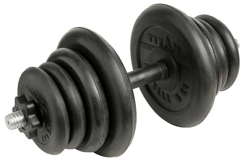 Type: dumbbell, design: collapsible, neck lock: nut, disc coating: rubber, handle coating: rubber
