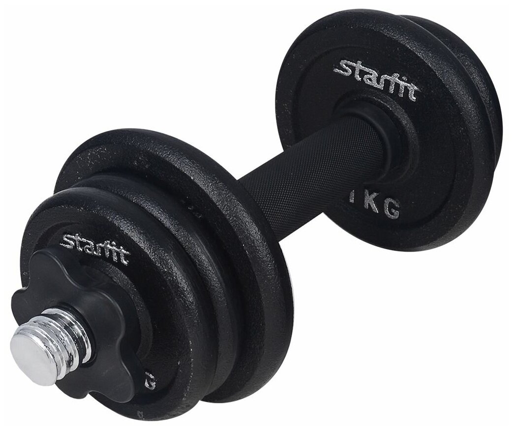 Type: dumbbell, design: collapsible, dumbbell shape: round, neck lock: petal lock, disc coating: cast iron, handle coating: plastic