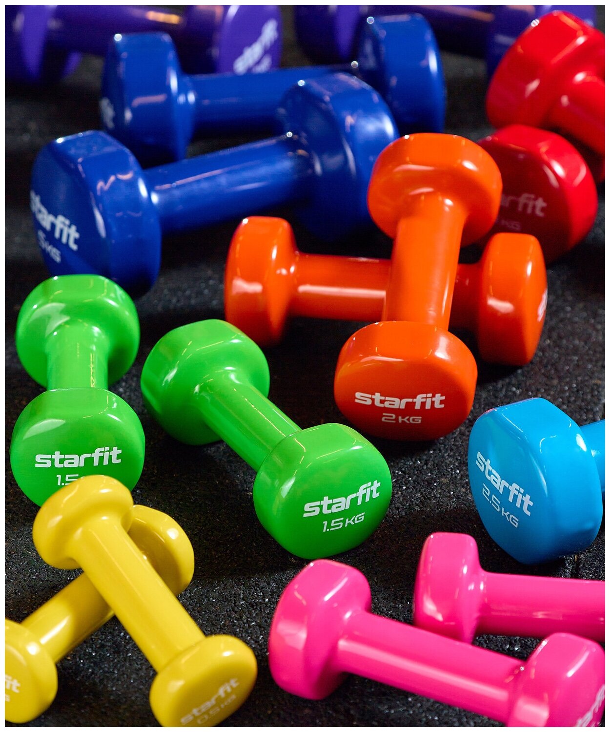 Type: dumbbell, design: fixed, dumbbell shape: round, disc coating: vinyl, handle coating: vinyl