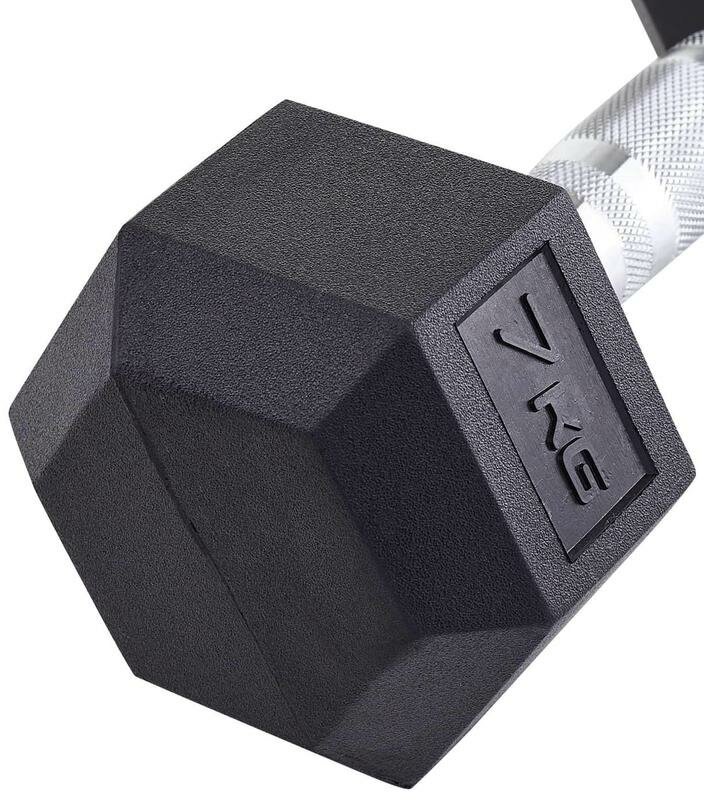 Type: dumbbell, design: non-separable, dumbbell shape: hexagonal, handle coating: rubber
