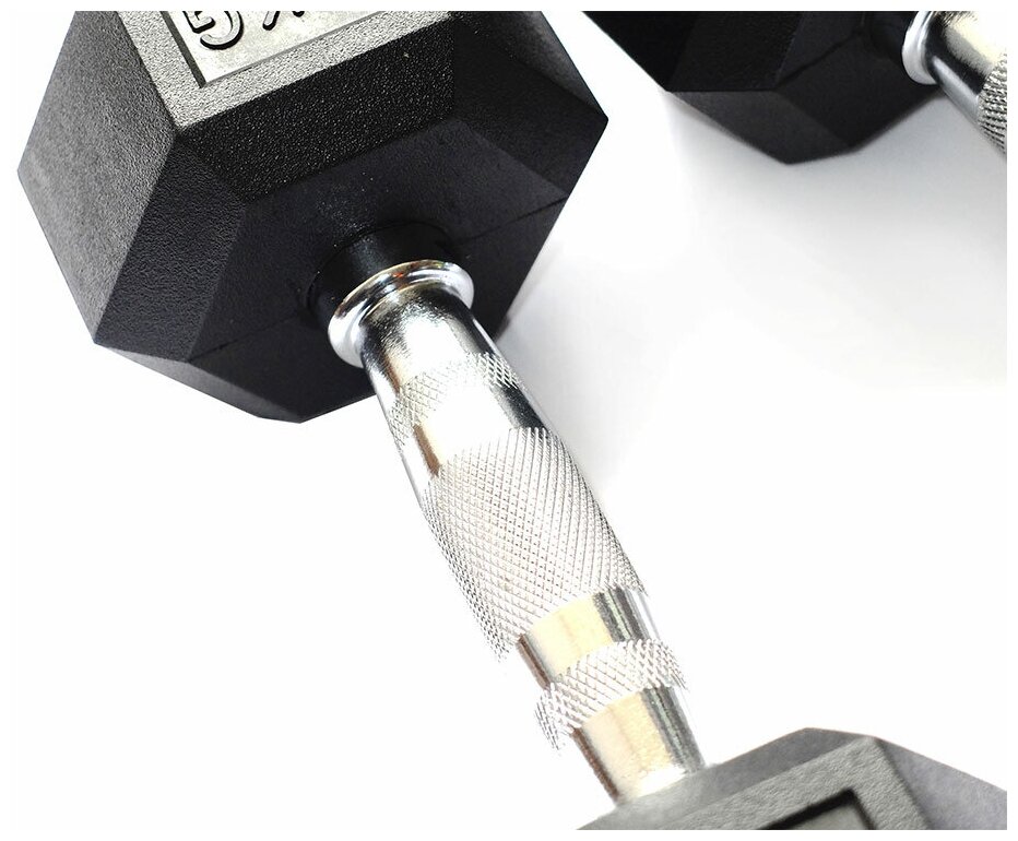 Type: dumbbell, design: non-separable, dumbbell shape: hexagonal, disc coating: rubber, handle coating: chrome