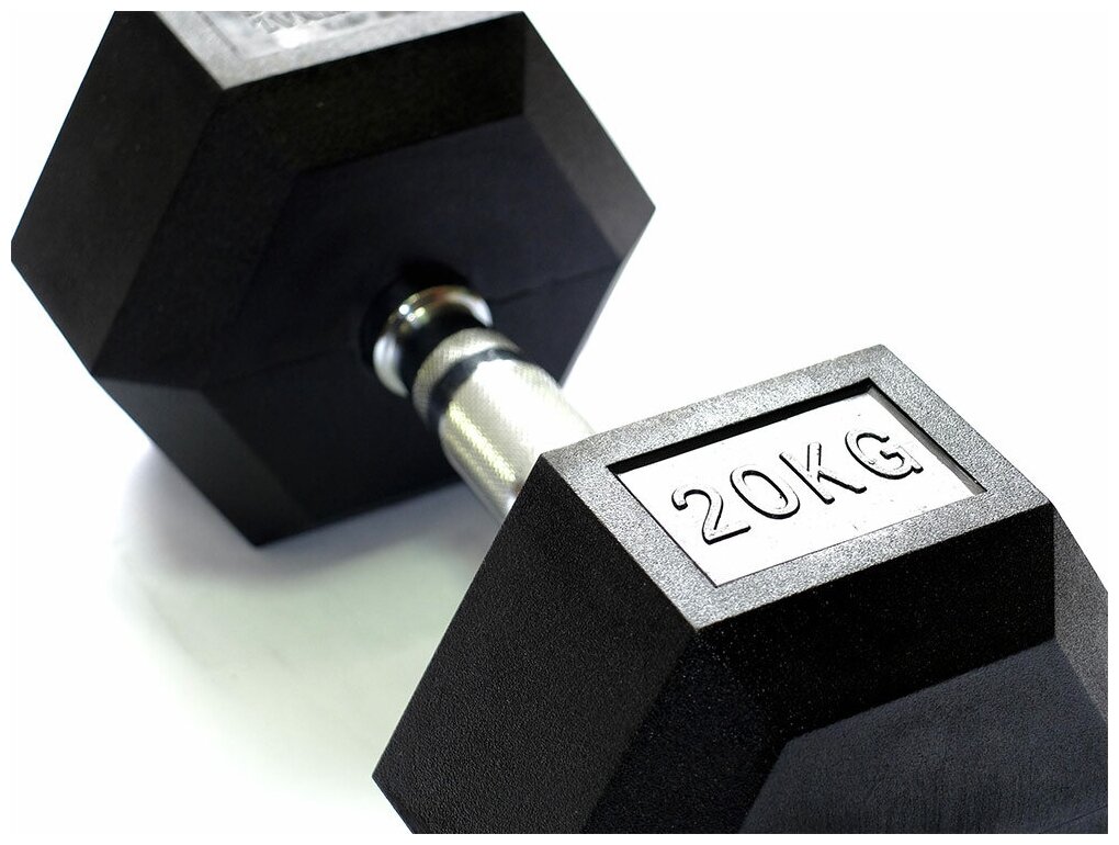 Type: dumbbell, design: non-separable, dumbbell shape: hexagonal, disc coating: rubber, handle coating: chrome