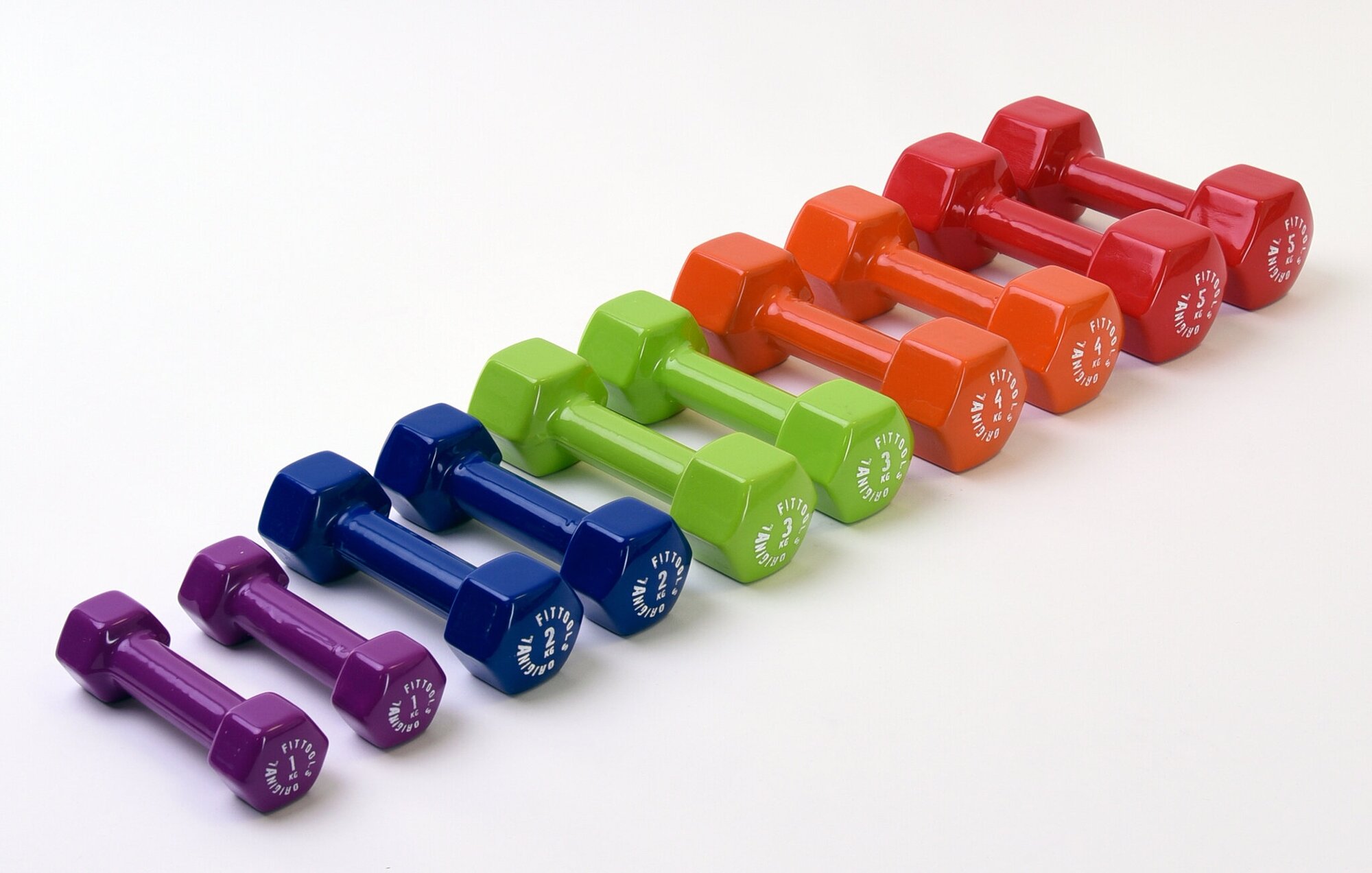 Type: dumbbell, design: fixed, dumbbell shape: hexagonal, disc coating: plastic, handle coating: plastic