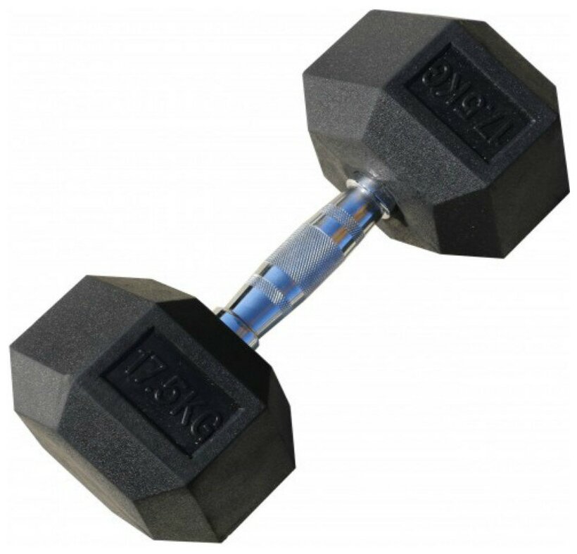 Type: dumbbell, design: non-separable, dumbbell shape: hexagonal, disc coating: rubber, handle coating: chrome