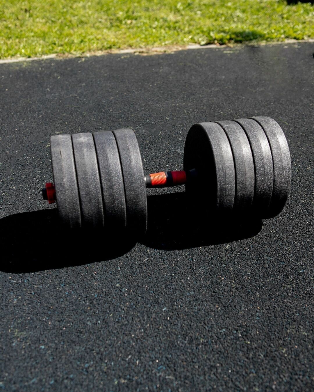 Type: dumbbell, design: collapsible, dumbbell shape: round, features: with soft handles, neck lock: nut, disc coating: plastic, handle coating: neoprene