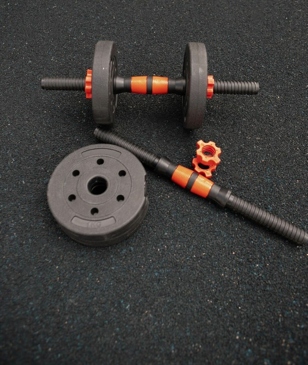 Type: dumbbell set, design: collapsible, dumbbell shape: round, features: with soft grips, neck lock: nut, disc coating: plastic, handle coating: neoprene