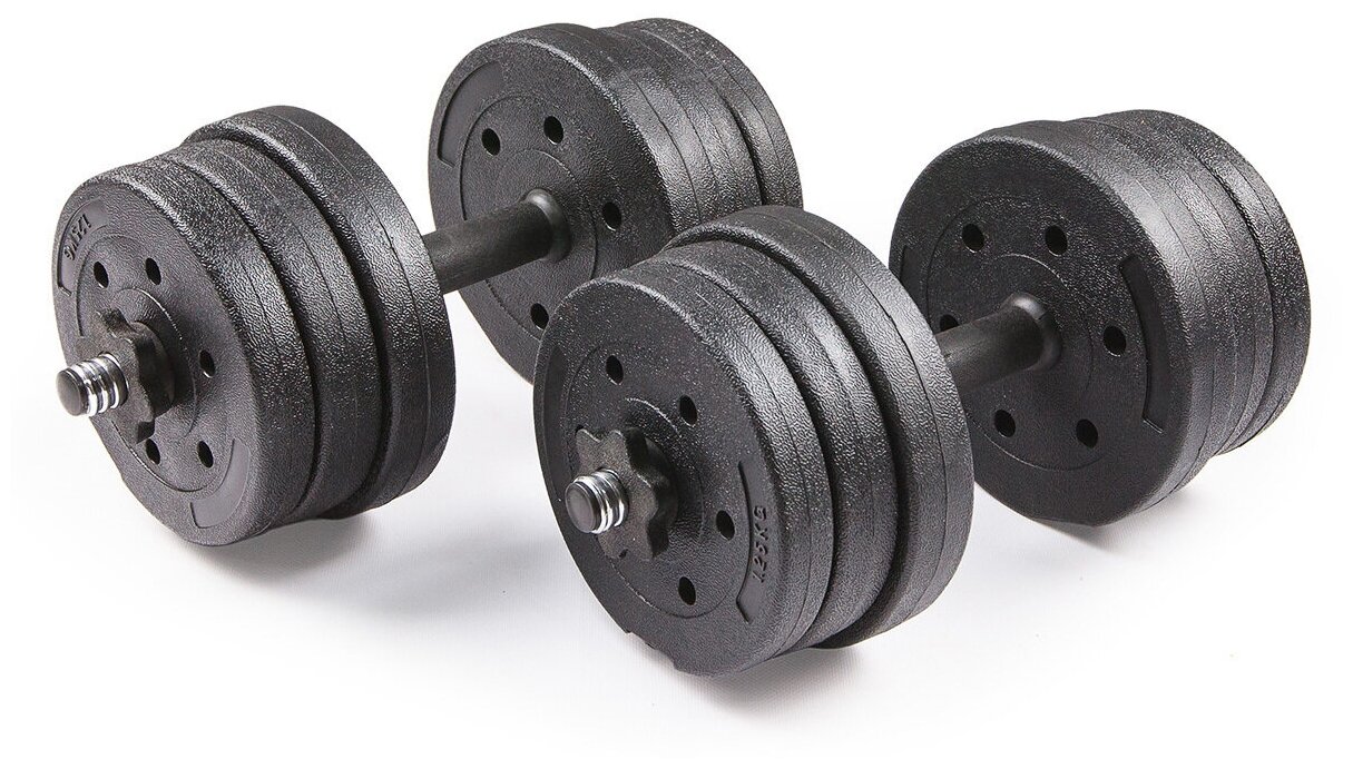 Type: dumbbell set, dumbbell maximum weight: 20 kg, design: collapsible, dumbbell shape: round, features: adjustable dumbbell, neck lock: nut, disc coating: plastic, handle coating: plastic