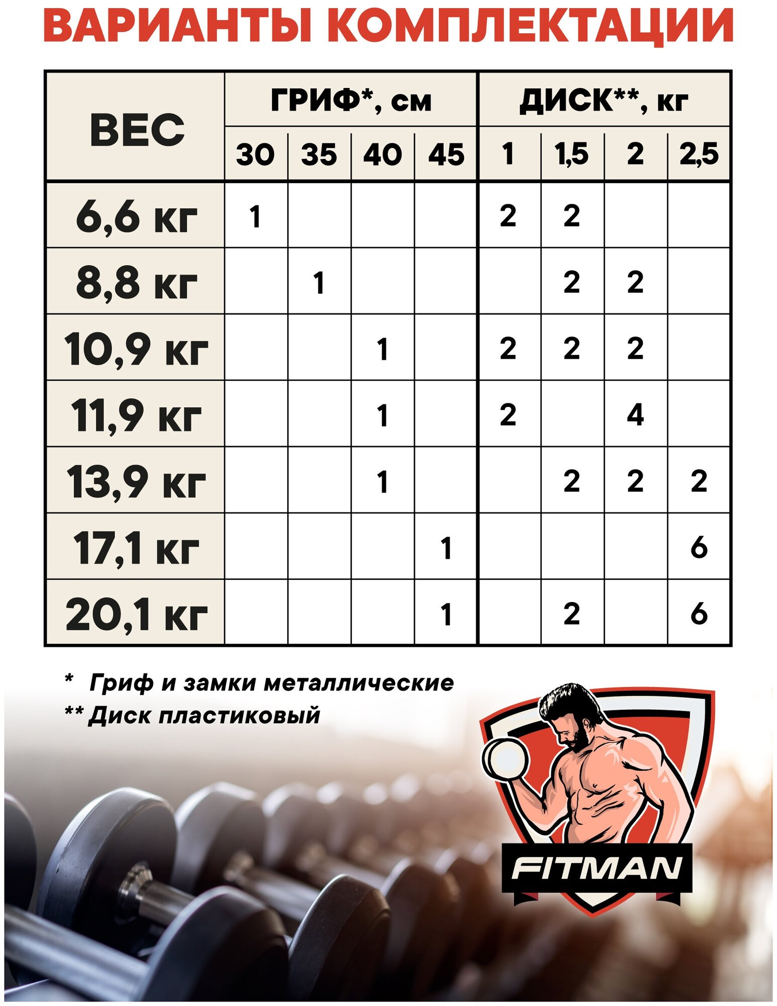 Type: dumbbell, design: collapsible, dumbbell shape: round, disc coating: plastic, handle coating: rubber
