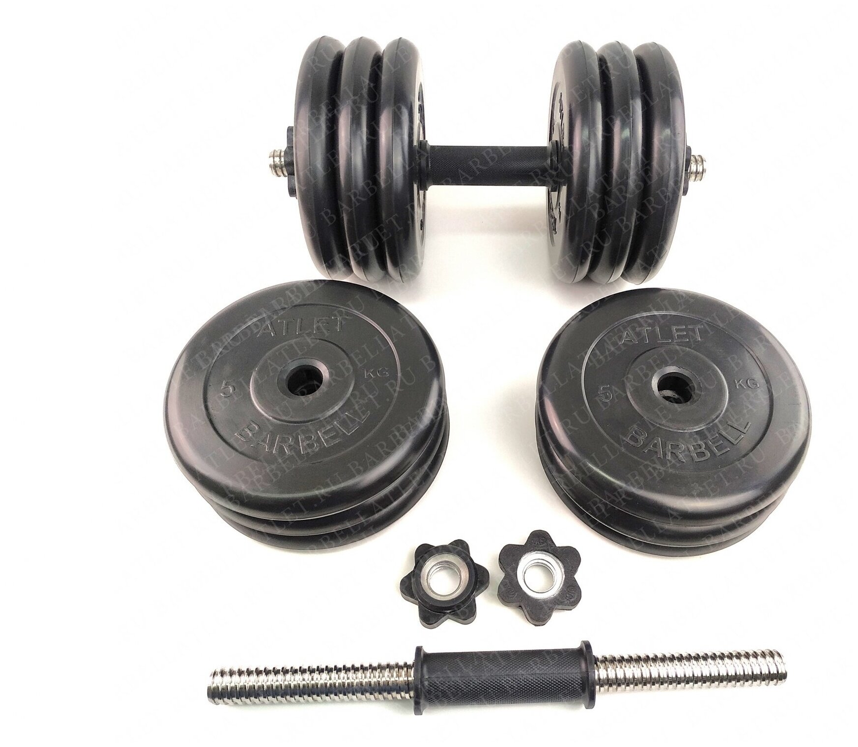 Type: dumbbell, design: collapsible, dumbbell shape: round, features: with stand, neck lock: nut, disc coating: rubber, handle coating: vinyl