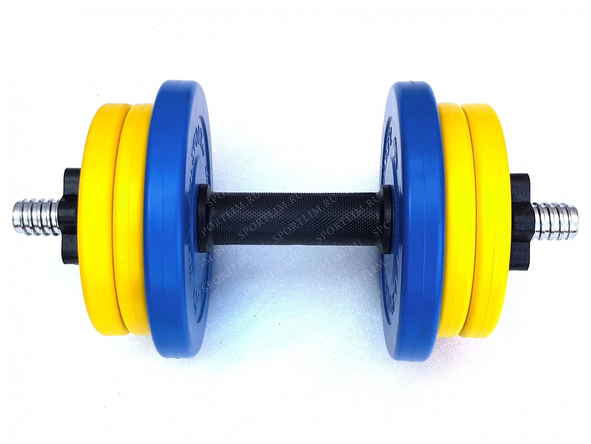 Type: dumbbell set, design: collapsible, dumbbell shape: round, features: The most technological lock-nuts will tightly fix the discs on the neck., neck lock: nut, disc coating: rubber, handle coating: rubber