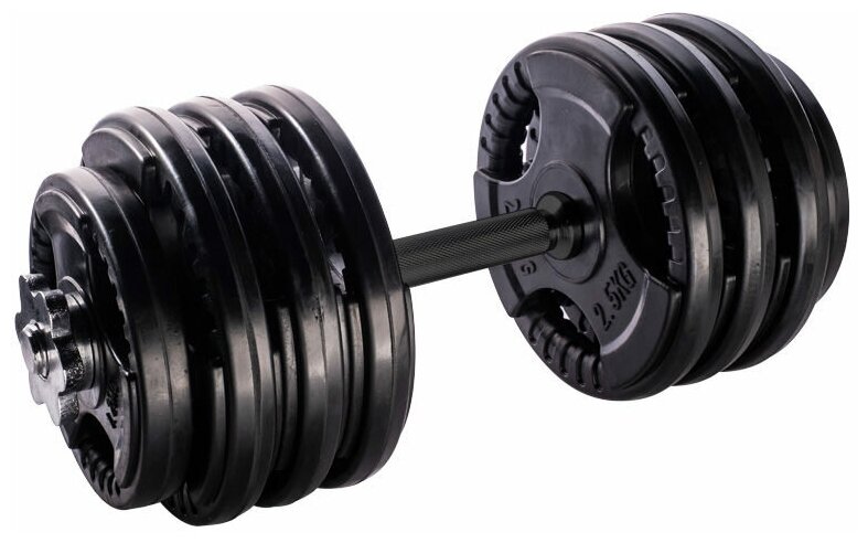 Type: dumbbell, design: collapsible, dumbbell shape: round, neck lock: nut, disc coating: rubber, handle coating: rubber