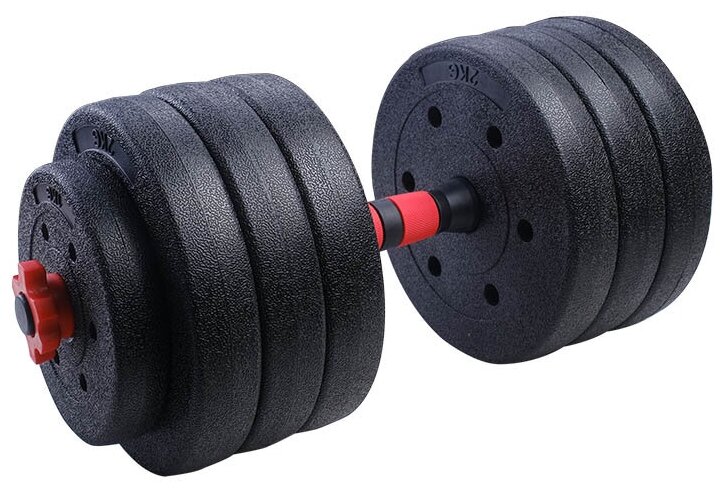 Type: dumbbell, design: collapsible, dumbbell shape: round, neck lock: nut, disc coating: plastic, handle coating: plastic