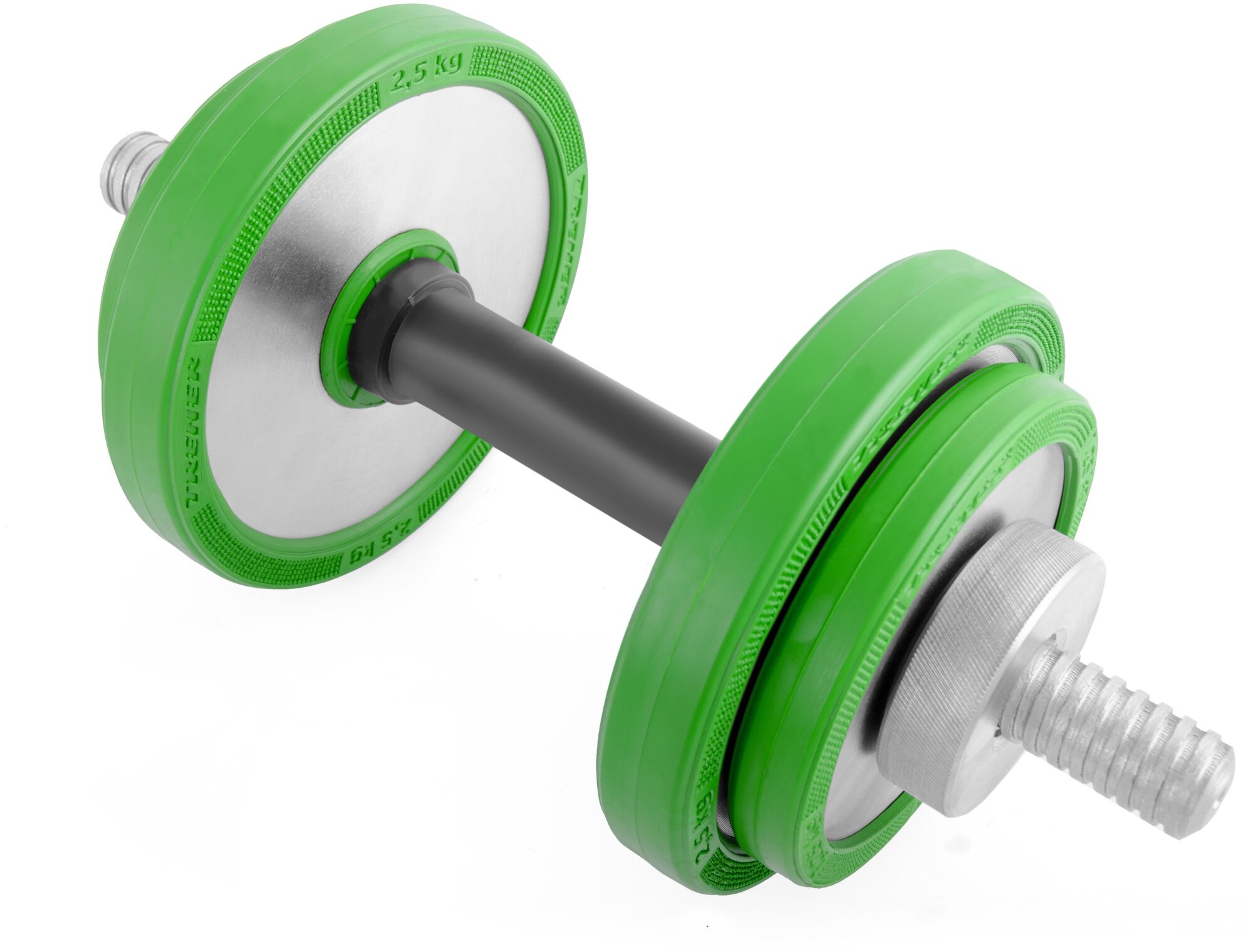 Type: dumbbell, design: collapsible, dumbbell shape: round, disc coating: rubber, handle coating: rubber