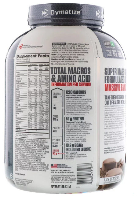 Additional Information: Serving Size: 334 g; serving calorie content: 1280 kcal; Suggested Use: Add one serving of Super Mass Gainer to 450-500 ml of cold water or milk. Take immediately after training and on rest day 1-2 servings between