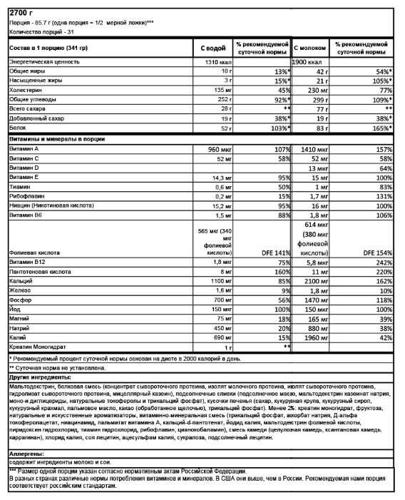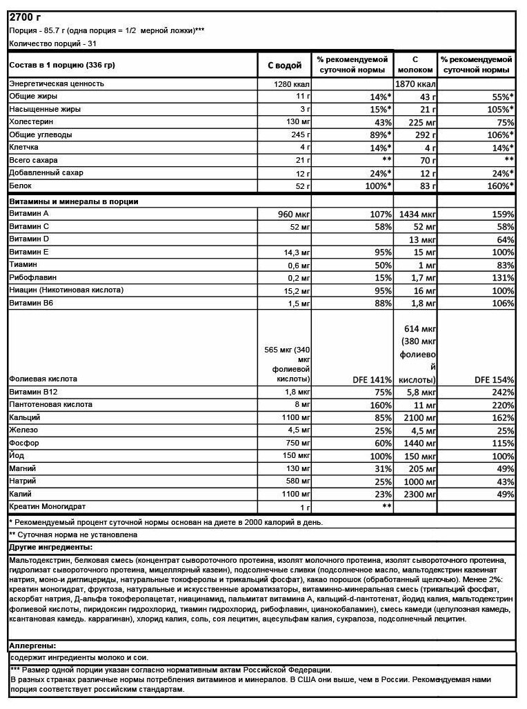 Description: Type: high-carbohydrate, type of protein: multicomponent, 100 g calories: 383 kcal, dietary features: no aspartame, contains maltodextrin
