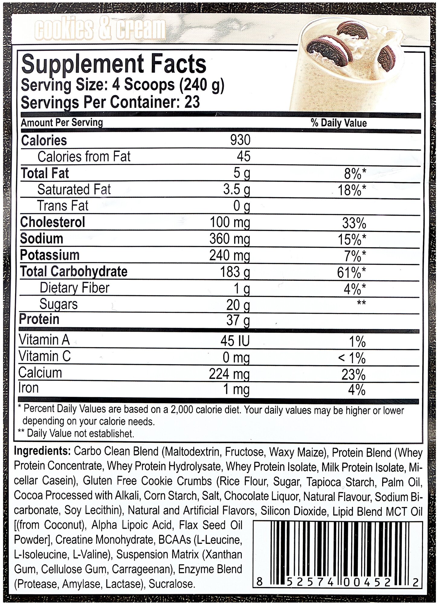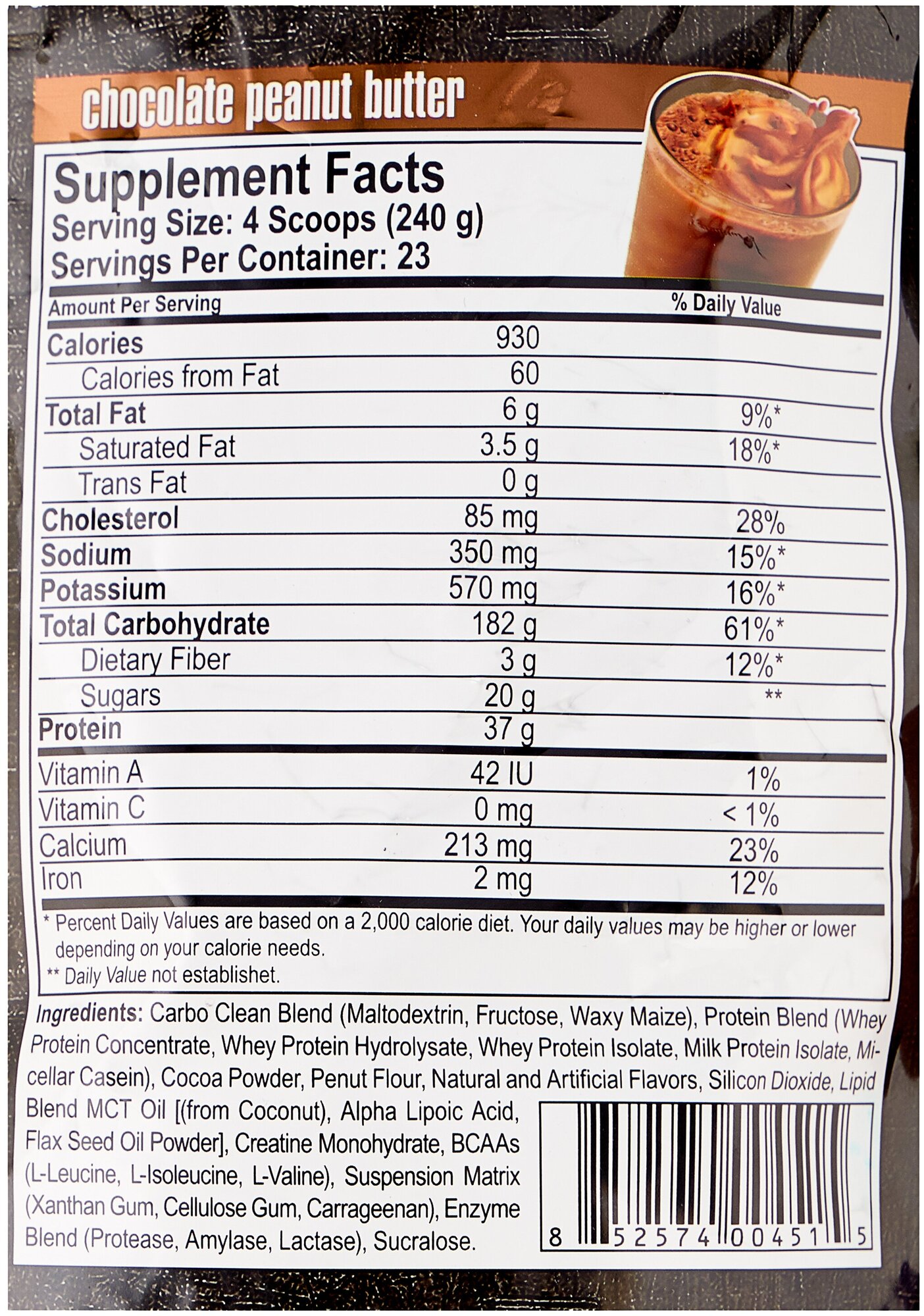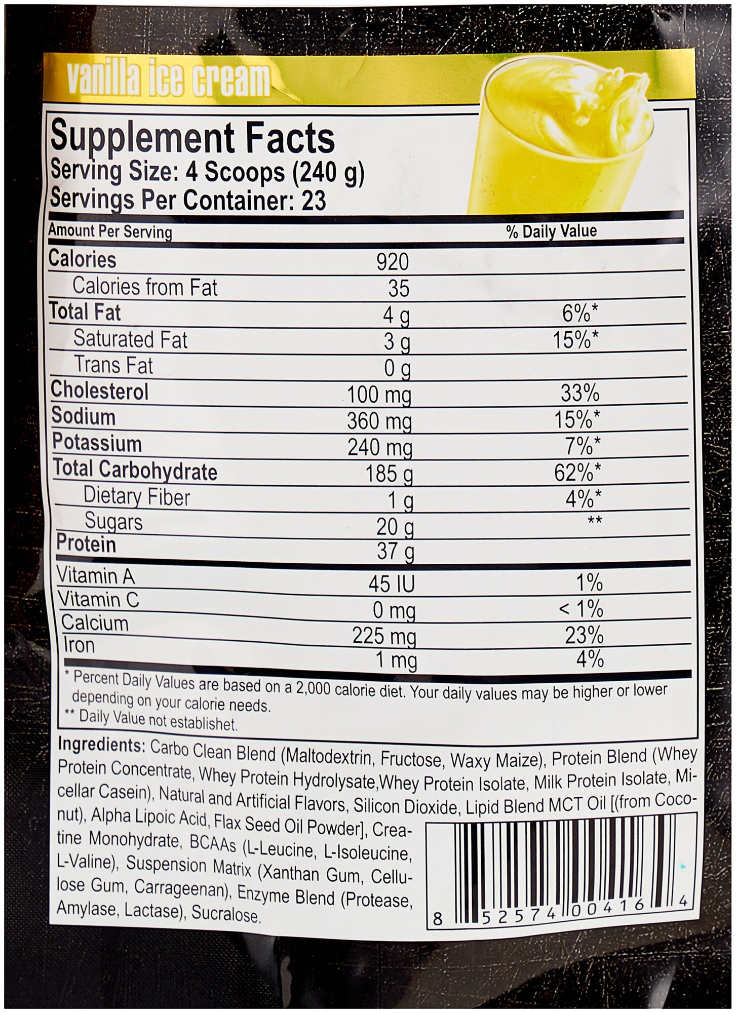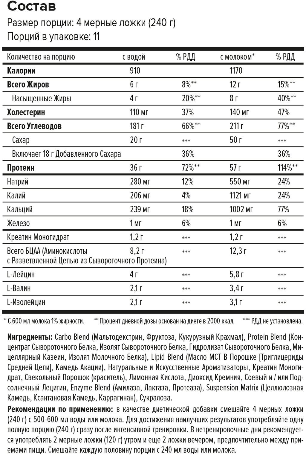 Description: Type: high carbohydrate, type of protein: multicomponent, 100 g calories: 383 kcal, formulation: powder, dietary features: no aspartame, no saccharin, contains sucralose