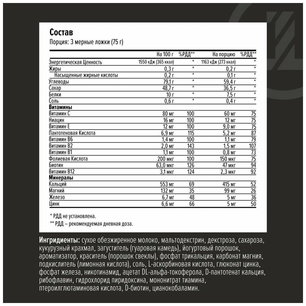 Additional Information: Serving Size: 240 g; serving calorie content: 920 kcal; saturated fat: 1.4 g; energy value per 100 g: 920; Directions for use: Mix 4 measuring spoons of 240 g with 550-600 ml of water or milk. For best results use