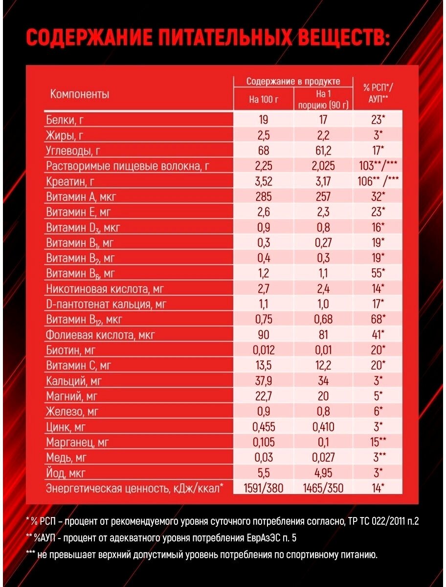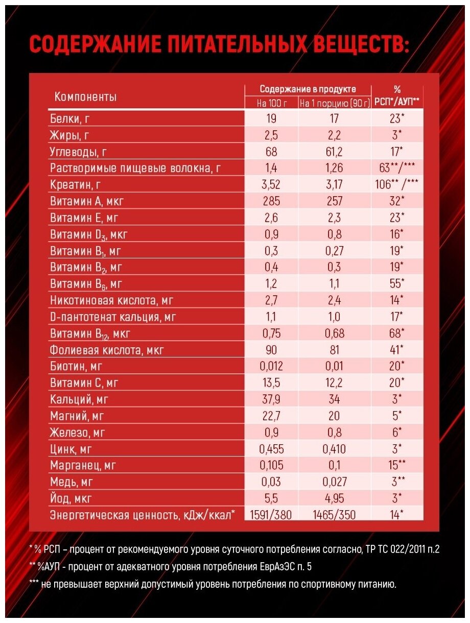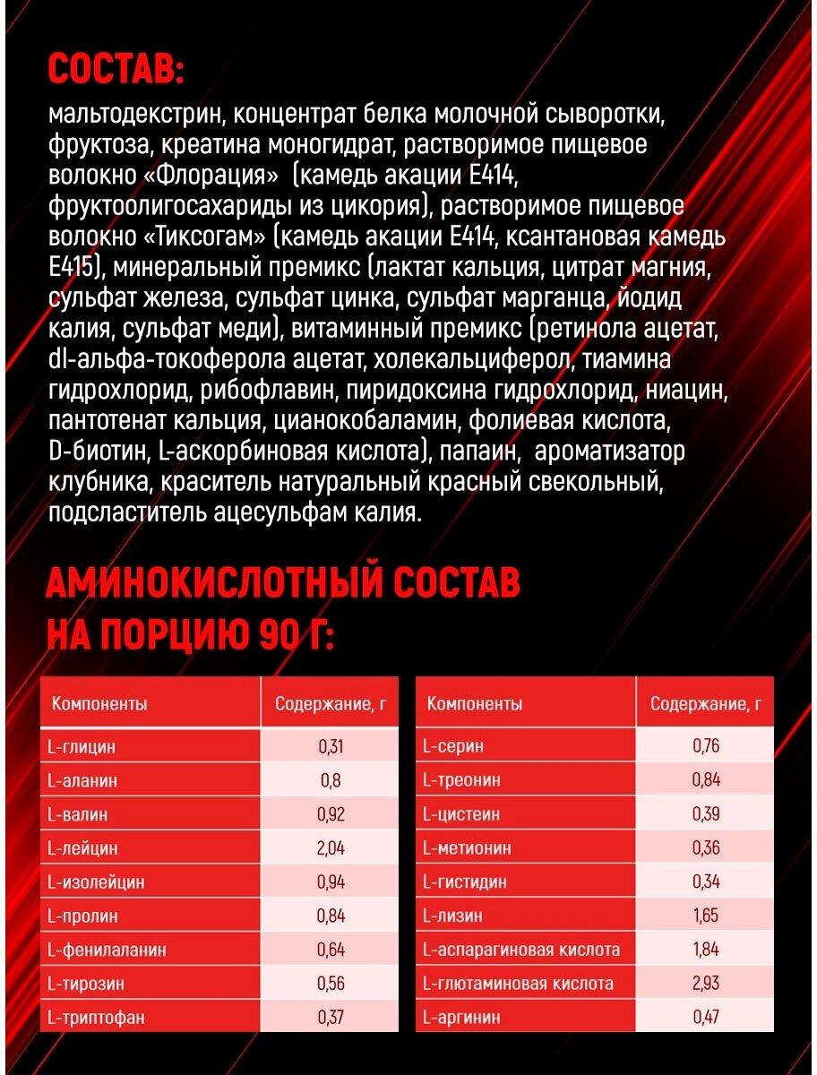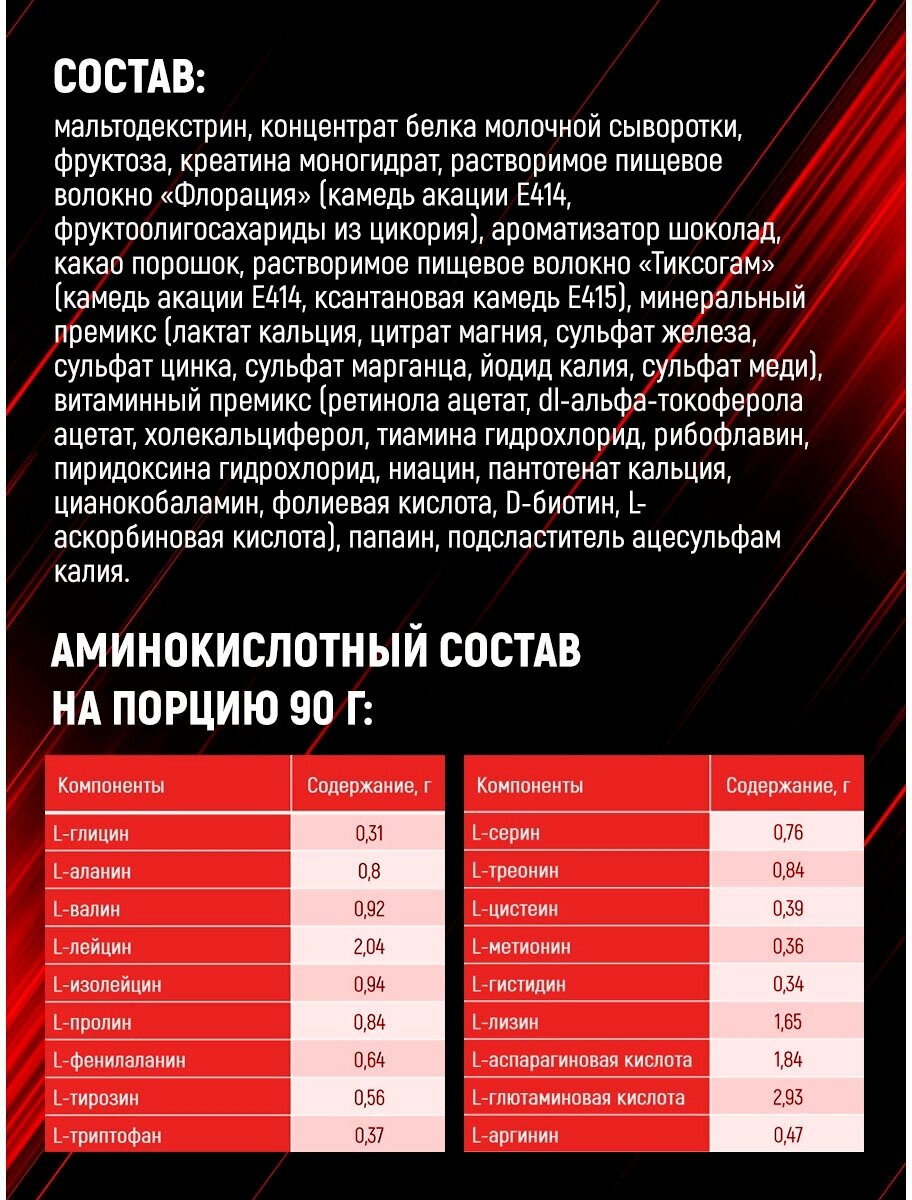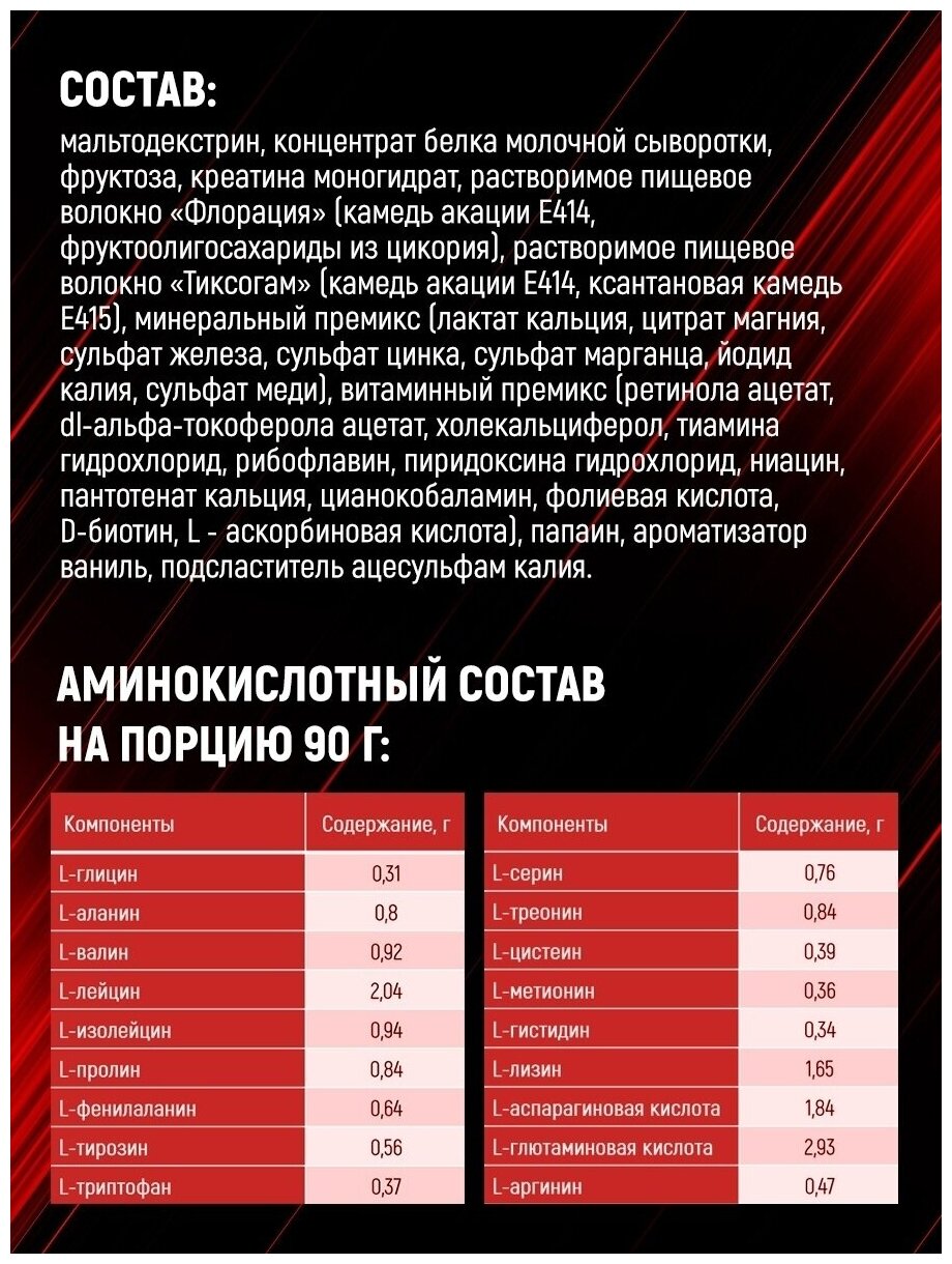 Type: high carbohydrate, type of protein: whey concentrate, calories per 100 g: 380 kcal