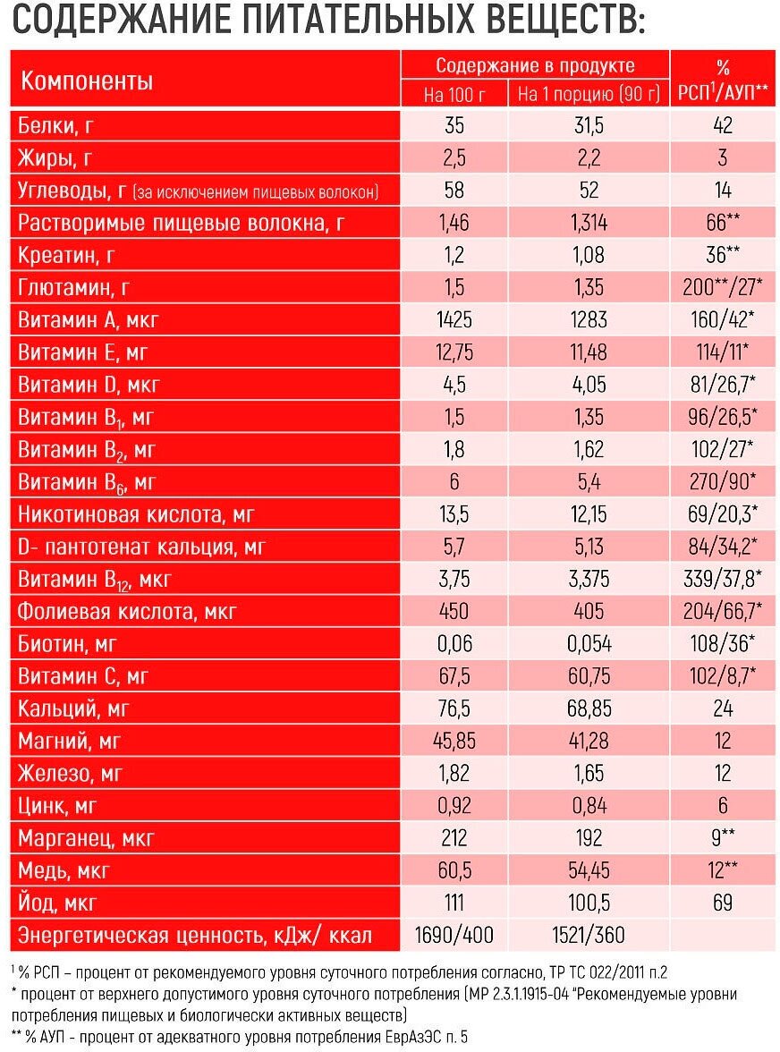 Type: high carbohydrate, type of protein: milk, calories per 100 g: 396 kcal