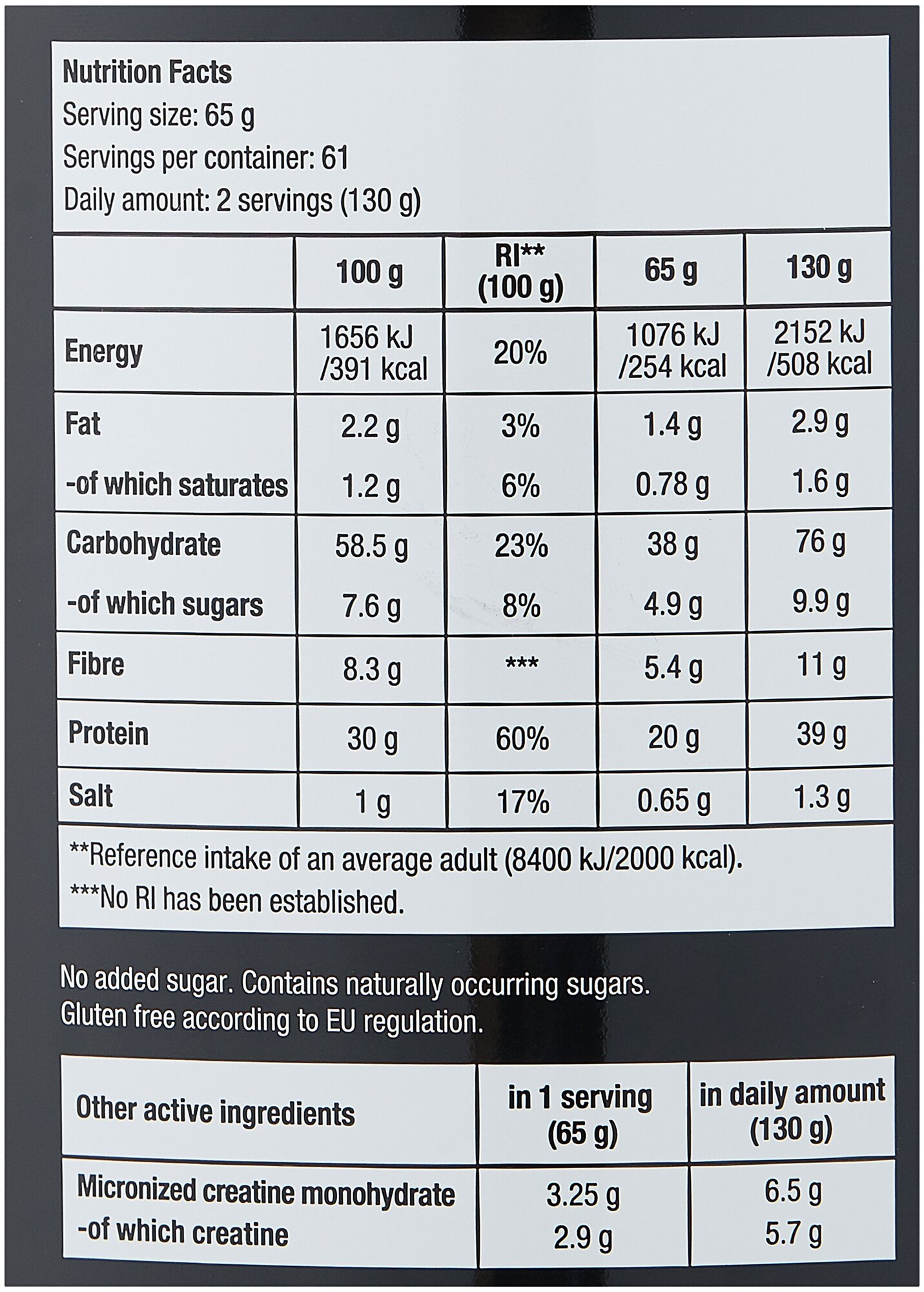 Description: Type: high-protein, type of protein: whey concentrate, calories per 100 g: 381 kcal, dietary features: contains maltodextrin, contains sucralose