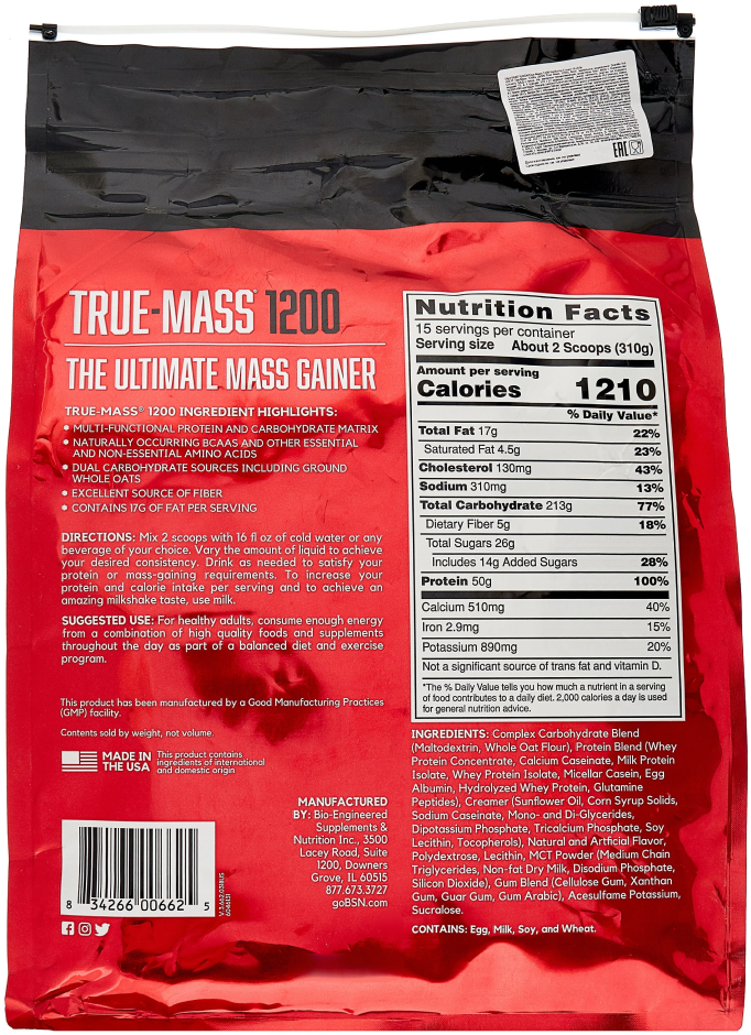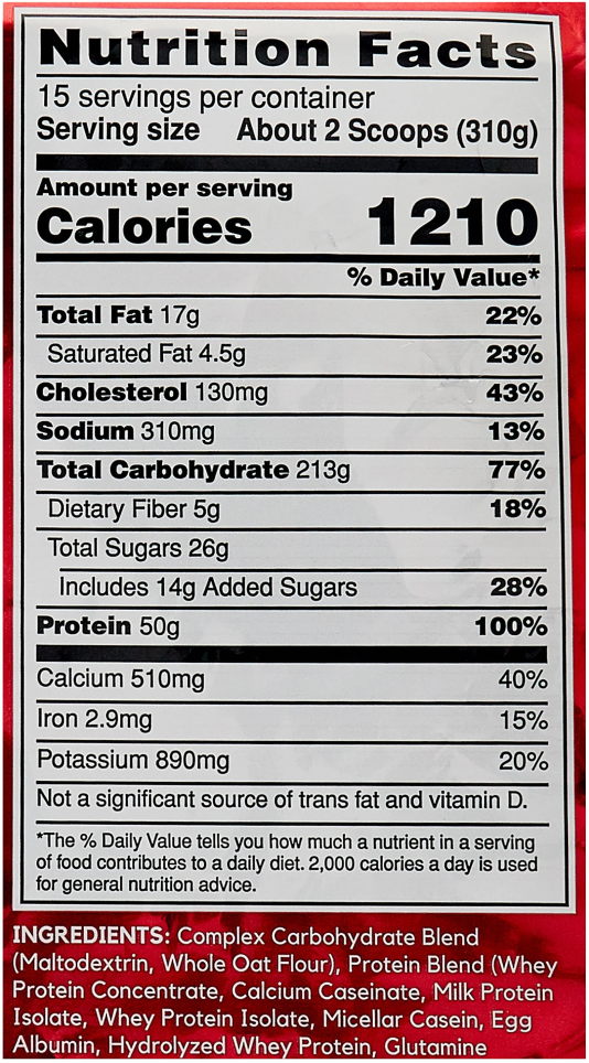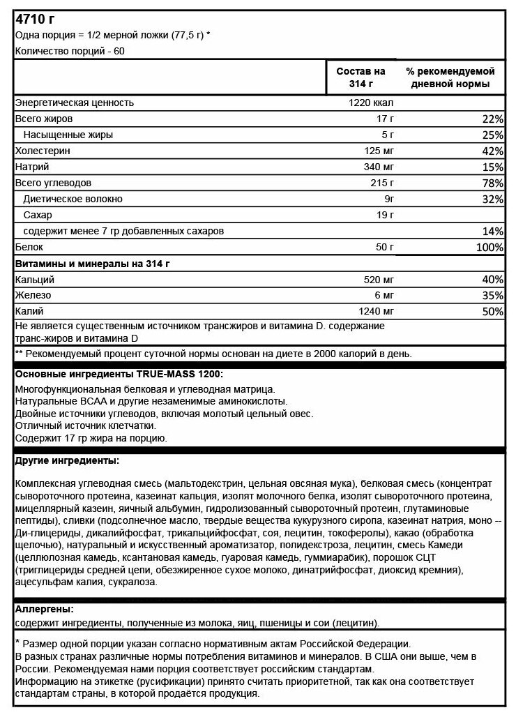 Type: high-carbohydrate, type of protein: multicomponent, 100 g calories: 391 kcal, formulation: powder, dietary features: no aspartame, contains maltodextrin, contains sucralose