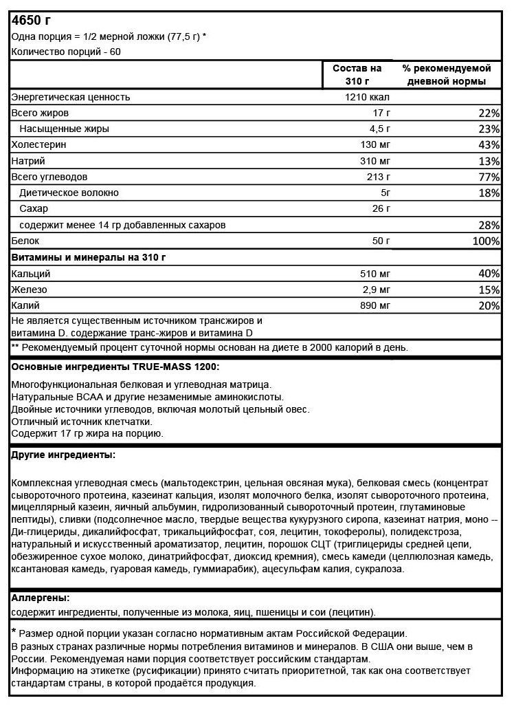 Contains ingredients derived from milk, eggs, wheat and soy lecithin; Serving Size: 310 g; calorie serving: 1230 kcal; saturated fat: 5 g; Directions for use: dilute the contents of 2 scoops in 480 ml cold