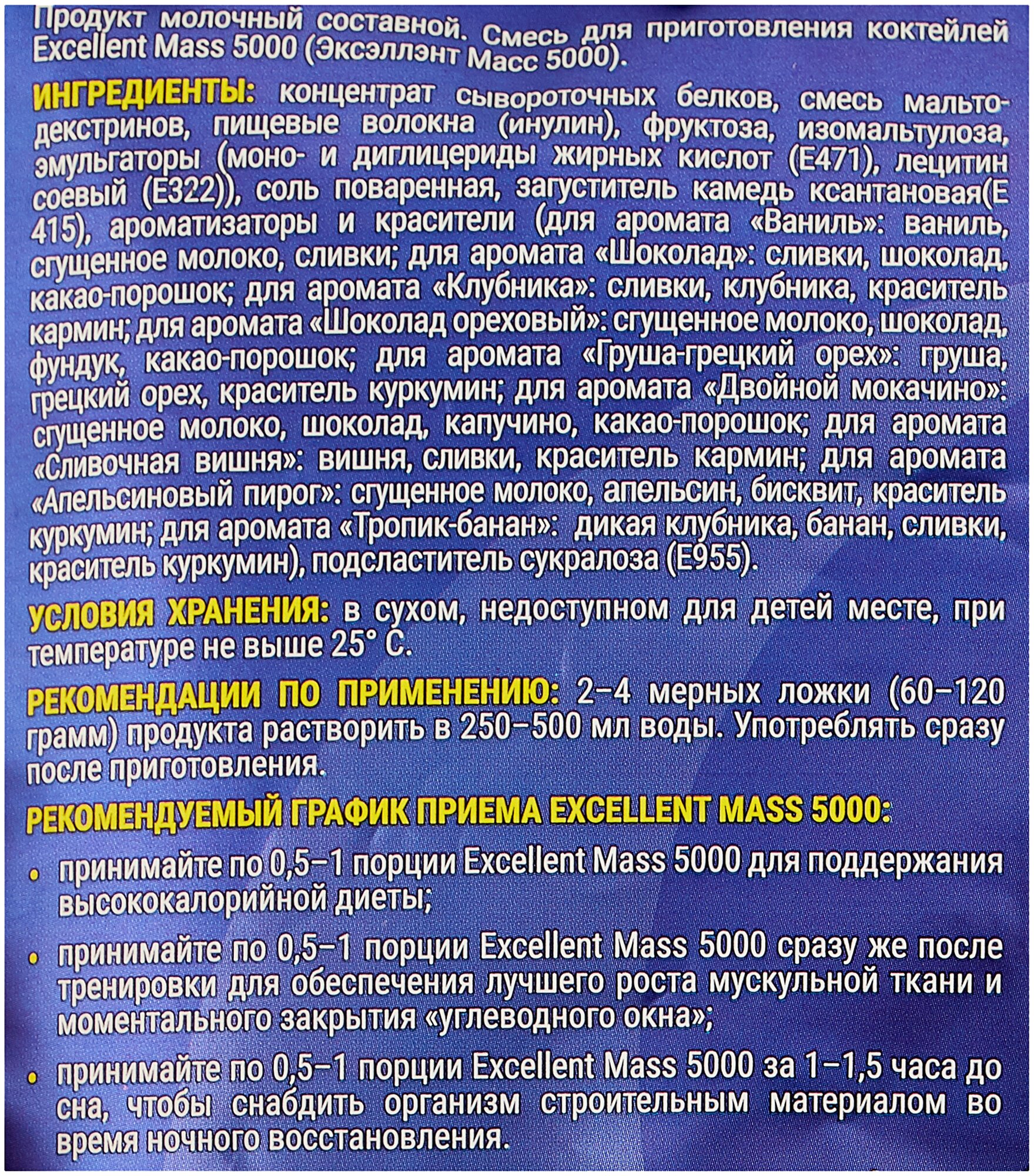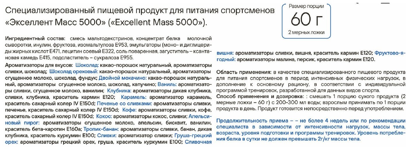 Description: Calorie serving: 2050 kcal; Ingredients: Multi-Phase Carbohydrate Complex Glucose Polymers, Oat Bran [as Avena sativa], Isomaltulose, Multi-Phase Protein System Whey Protein Concentrate, Whey Protein Isolate