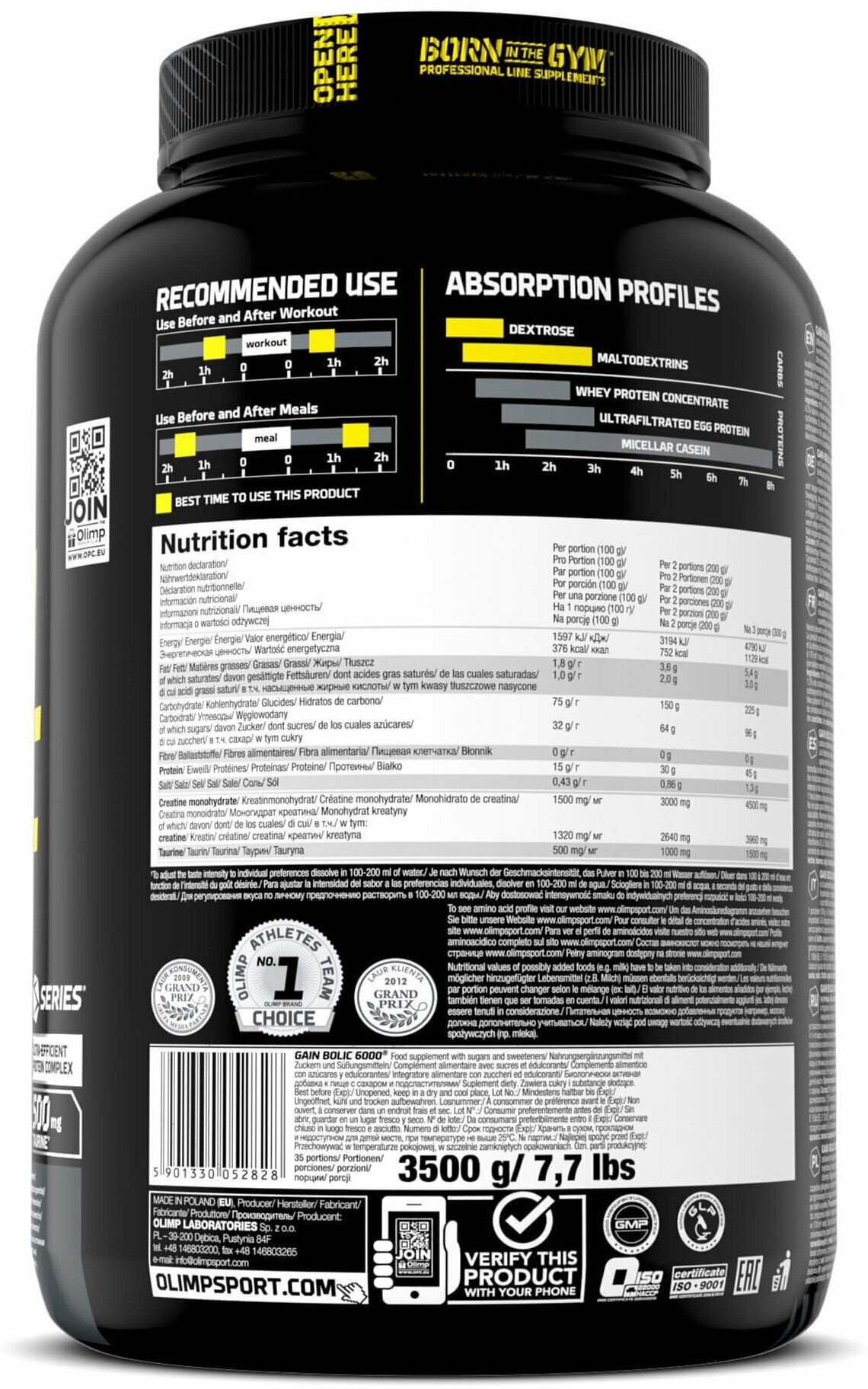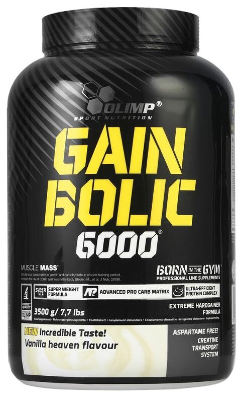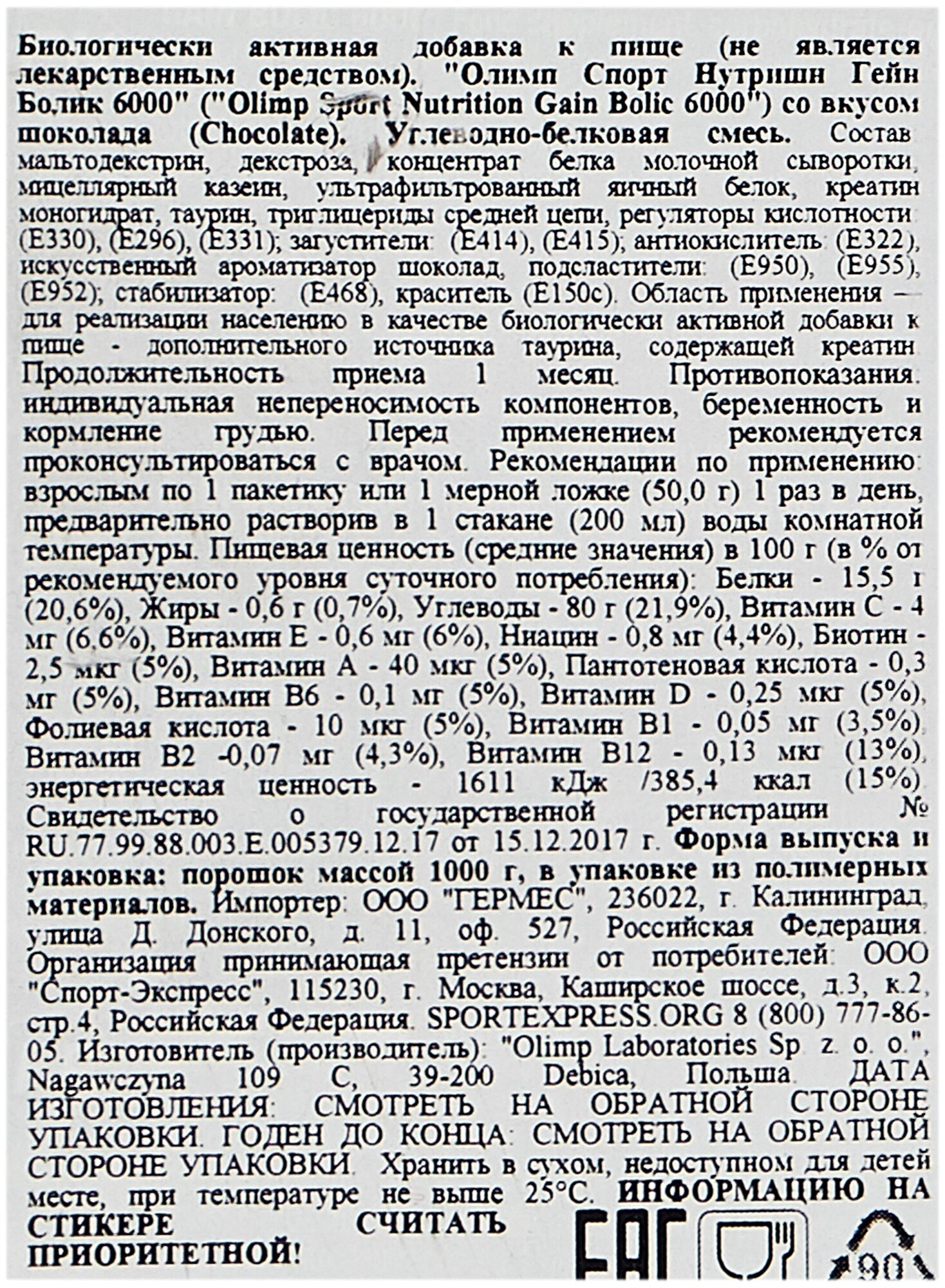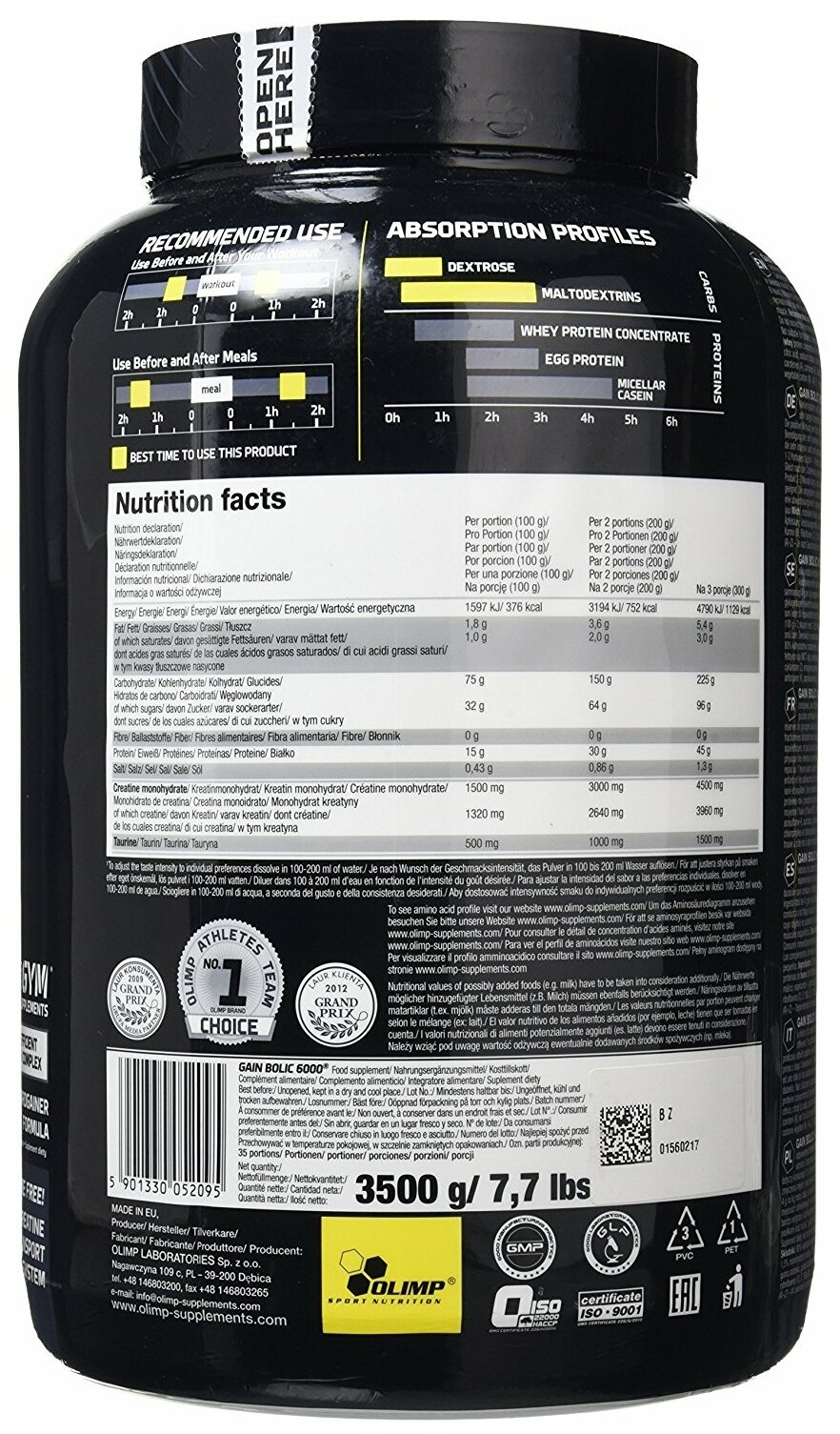 Description: Type: high-carbohydrate, type of protein: multicomponent, 100 g calories: 384 kcal, formulation: powder, dietary features: no aspartame, no saccharin, contains sucralose, antibiotics, chlorine