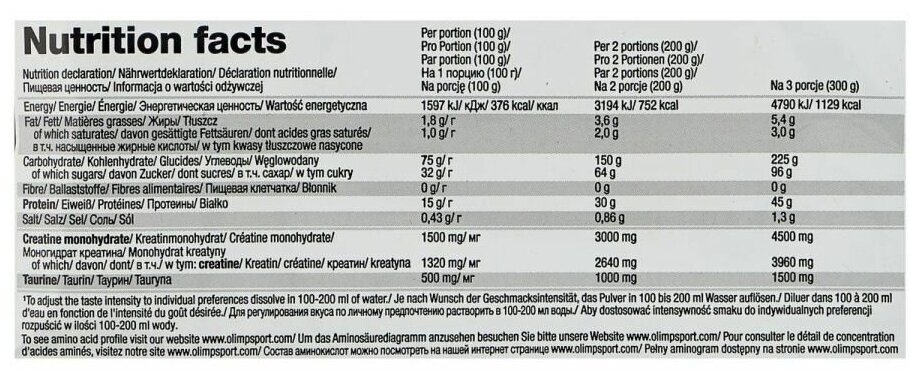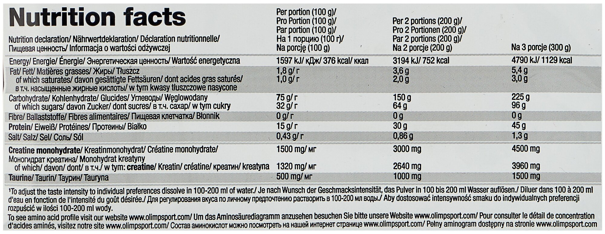 Additional Information: Dissolve 100 g of powder in 120 ml of drinking water. Beginners are advised to mix 50 g of the product with the same amount of water; Serving Size: 100 g; calorie serving: 384 kcal; saturated fat: 1 g; recommendations for use: 100