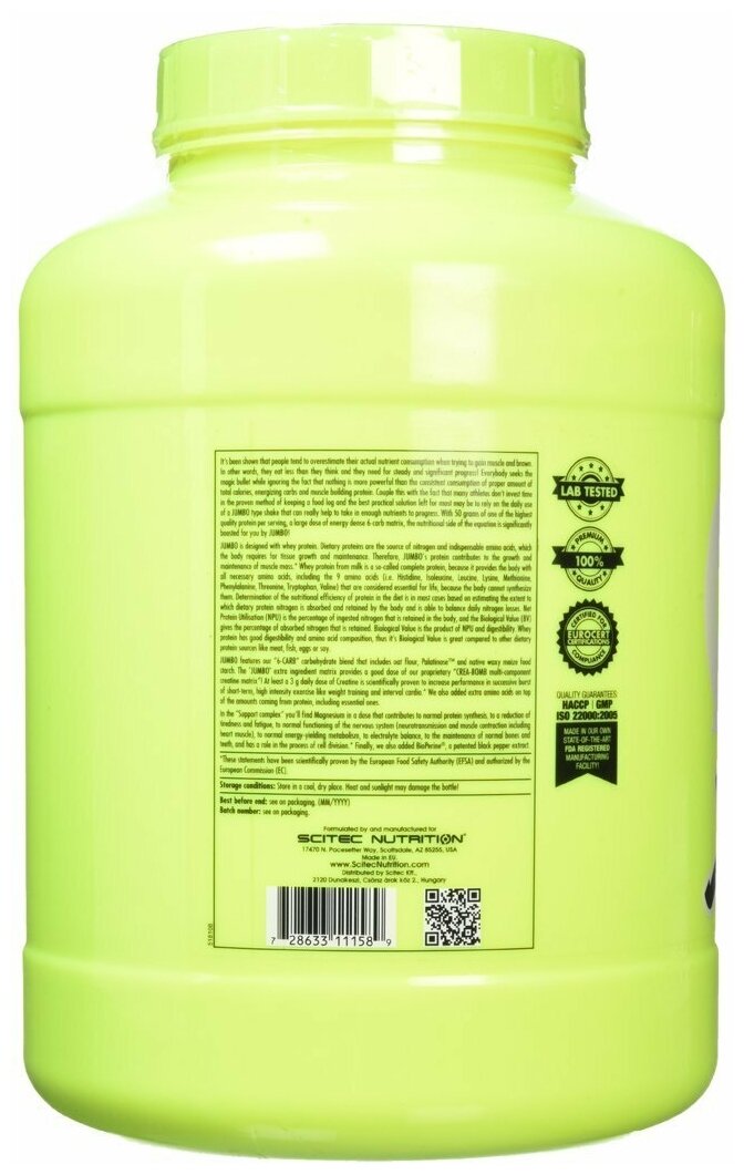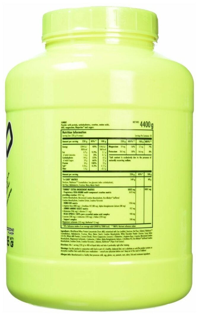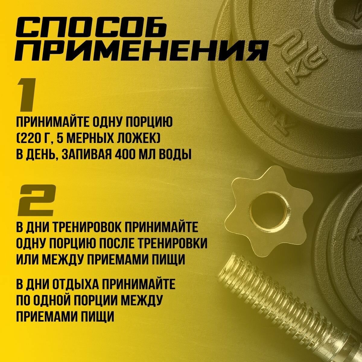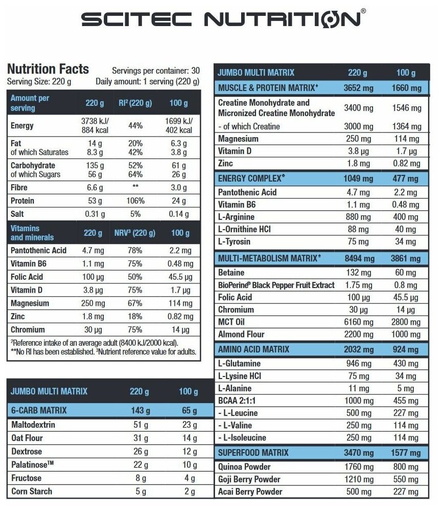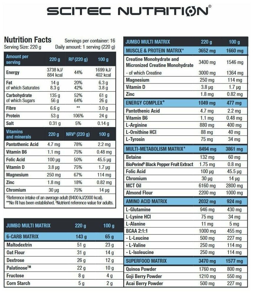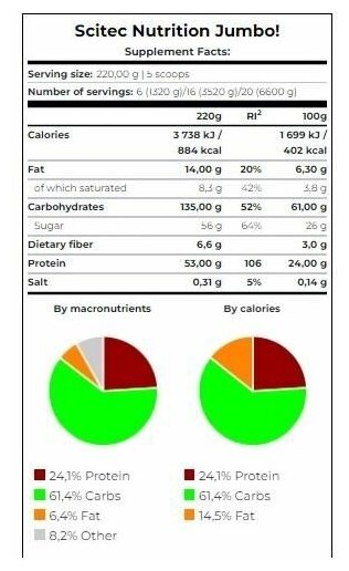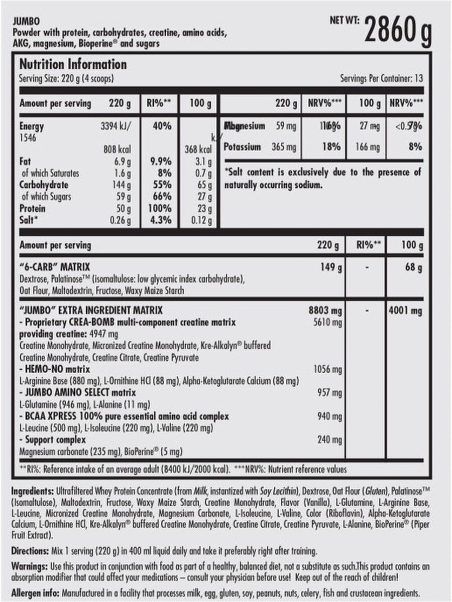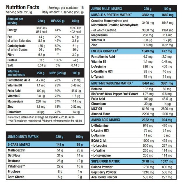 Additional Information: 1-2 servings per day, preferably after training or 2 hours before training; Serving Size: 220 g; energy value per 100 g: 402; Directions for use: Mix 4 heaping scoops with 300 ml skim milk