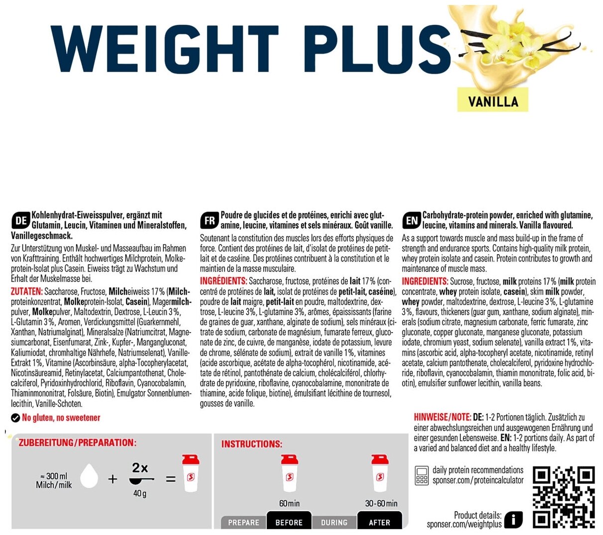 Serving Size: 40 g; serving calorie content: 260 kcal; Directions for use: Mix 1 serving of 40 g two scoops with 300 ml of skimmed milk 1.5% fat. To ensure the construction and build-up of muscle mass, take