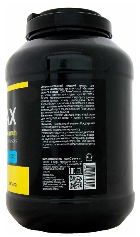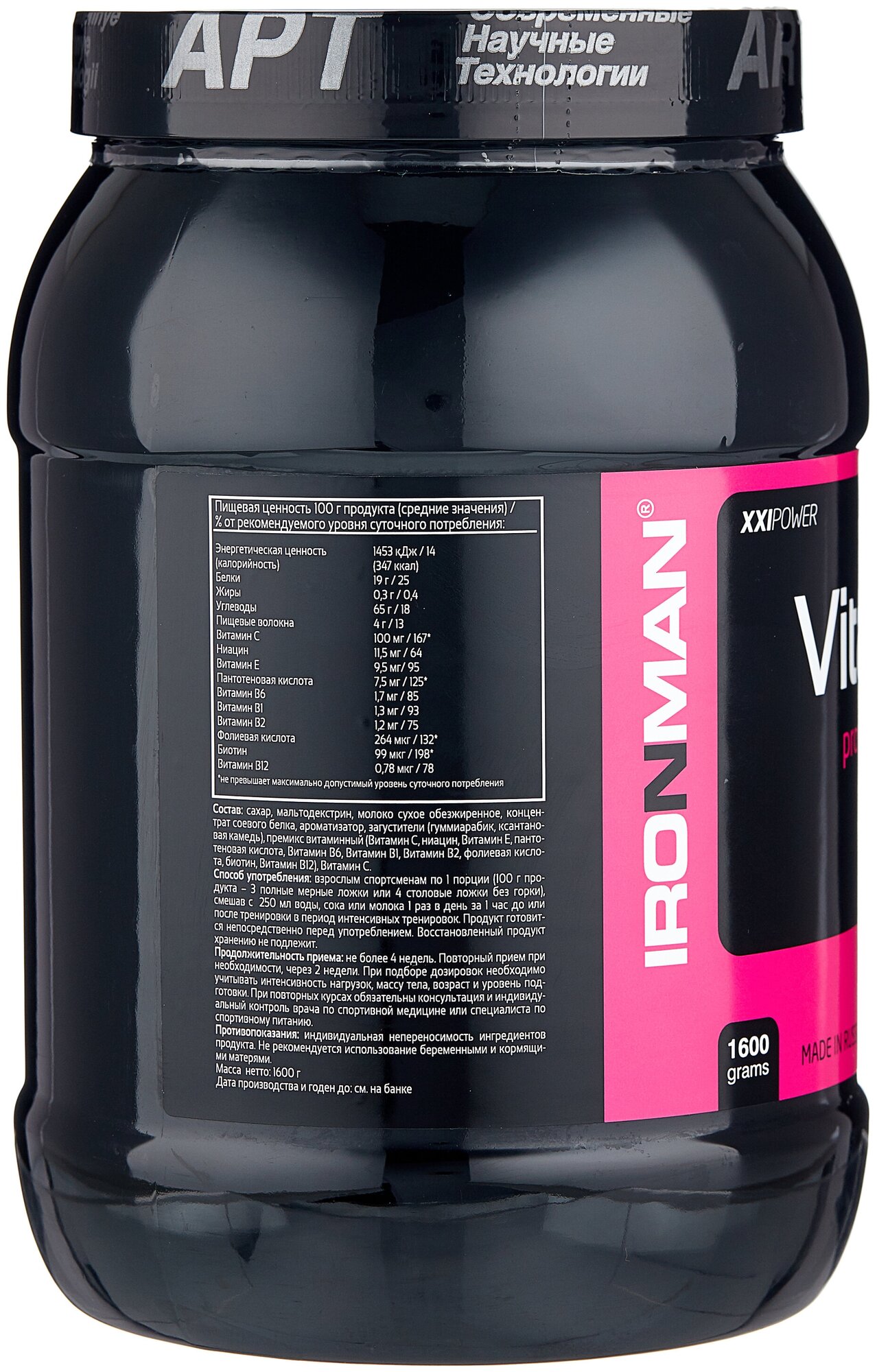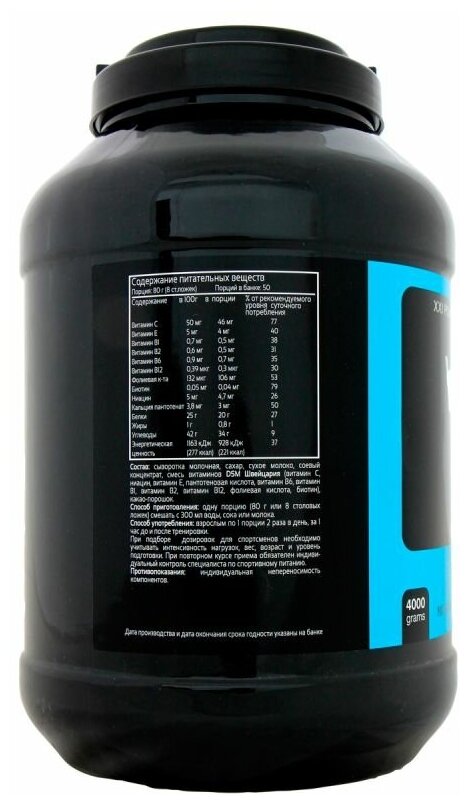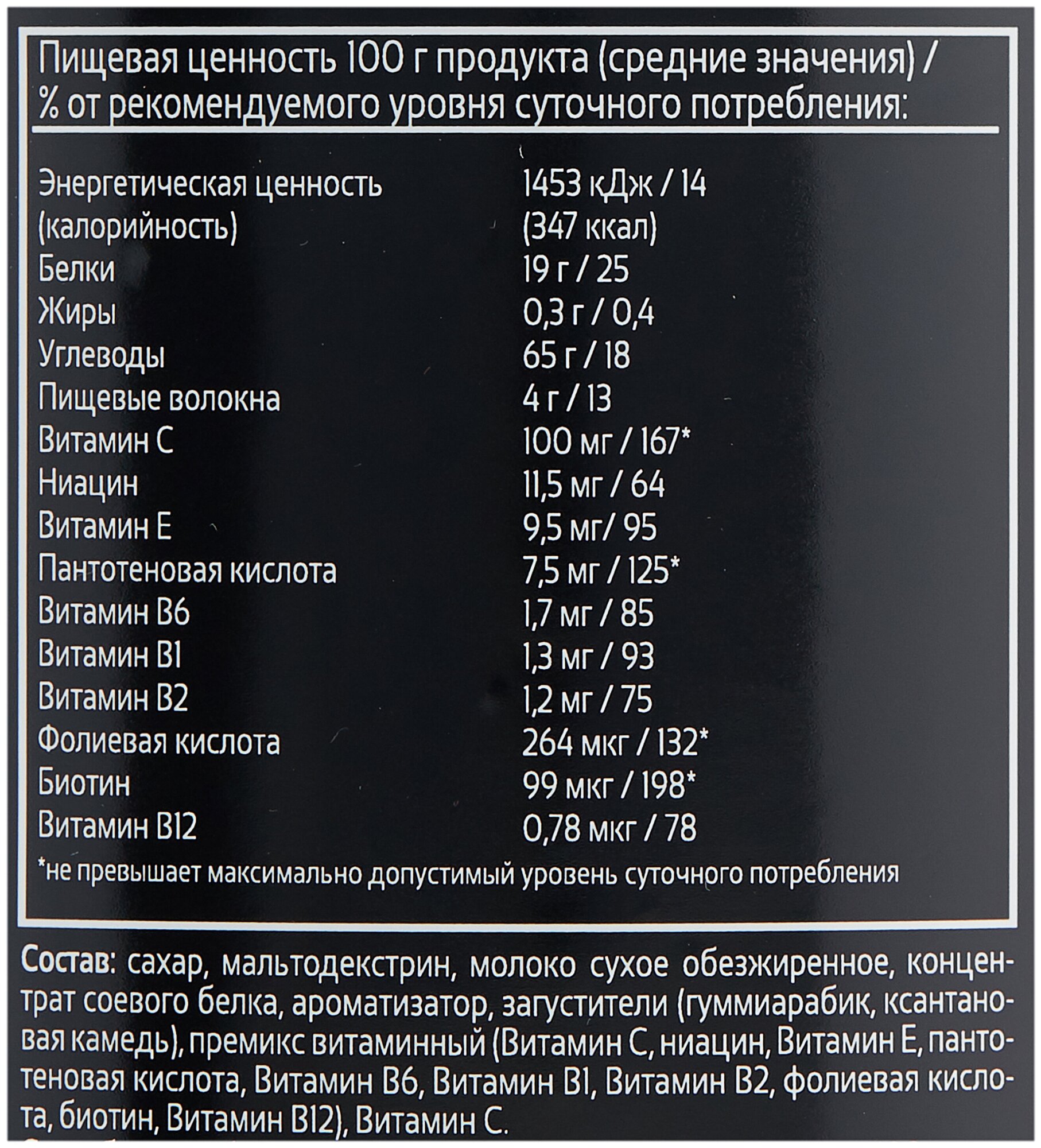 Type: high carbohydrate, protein type: multicomponent, 100 g calories: 304 kcal, dietary features: lactose free, maltodextrin free, saccharin free, contains aspartame