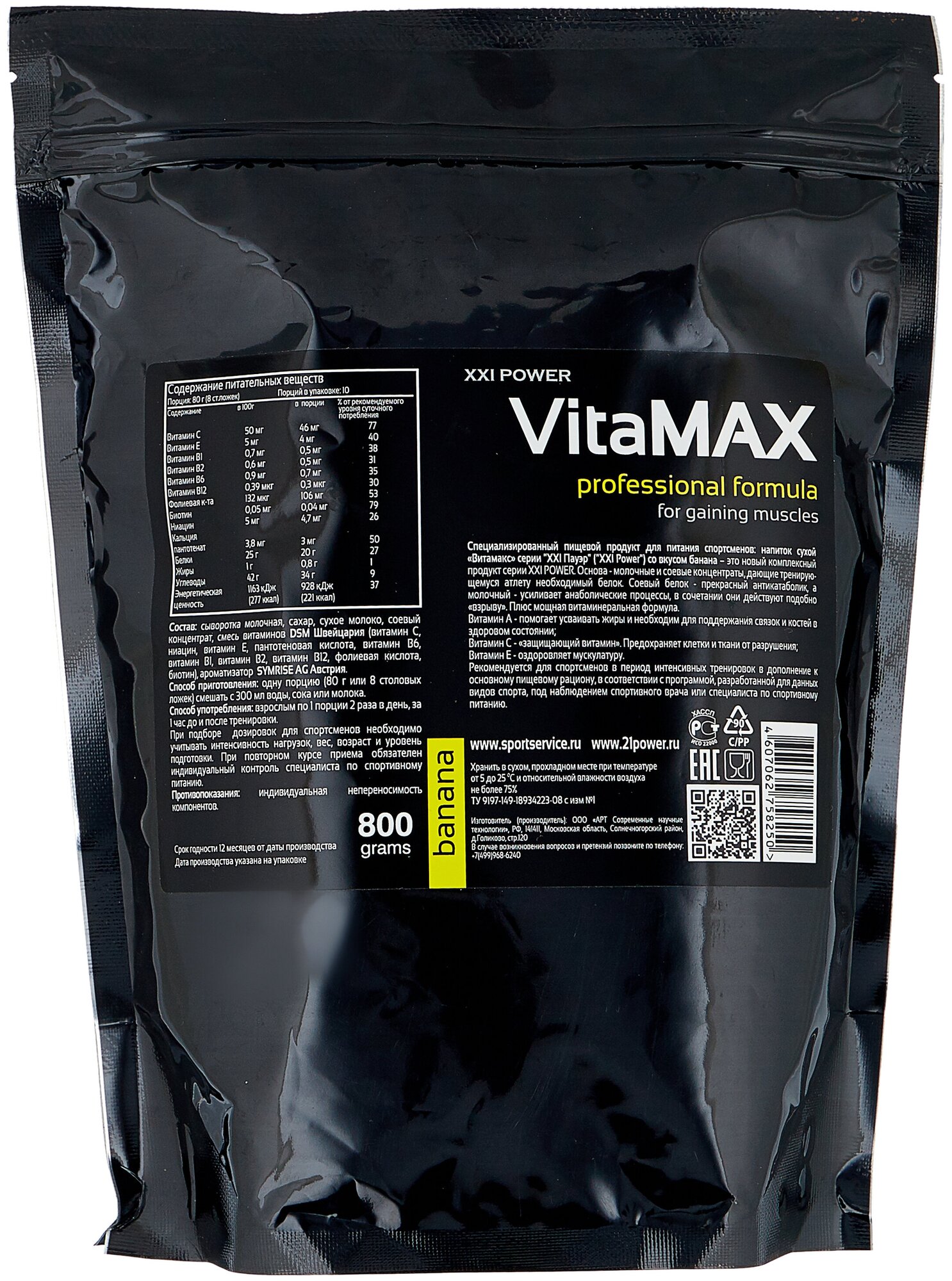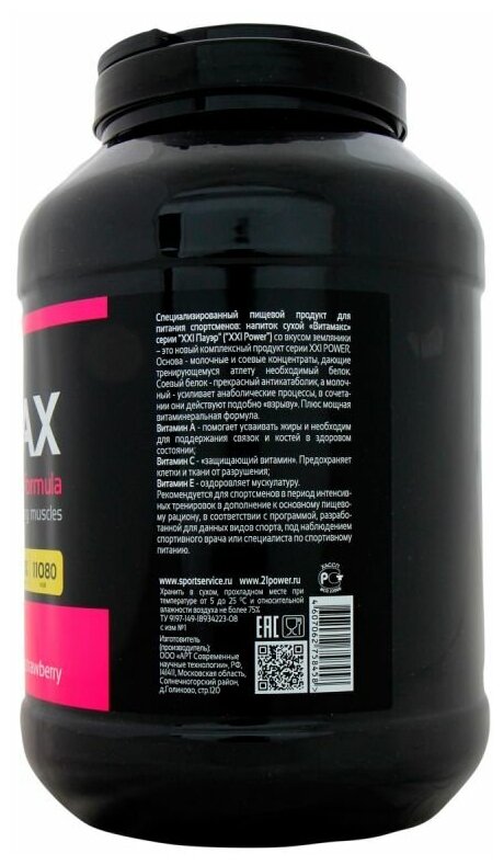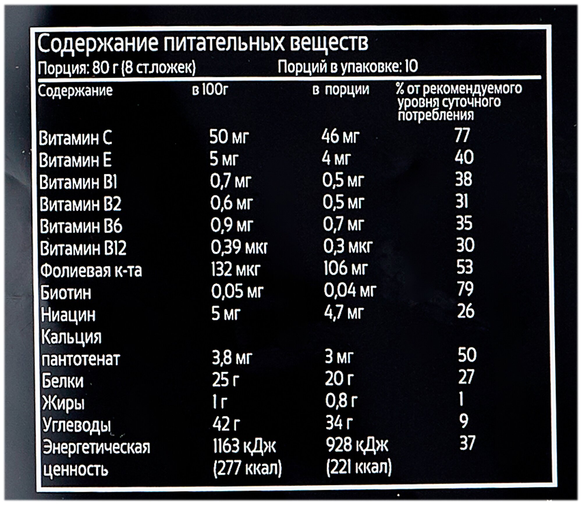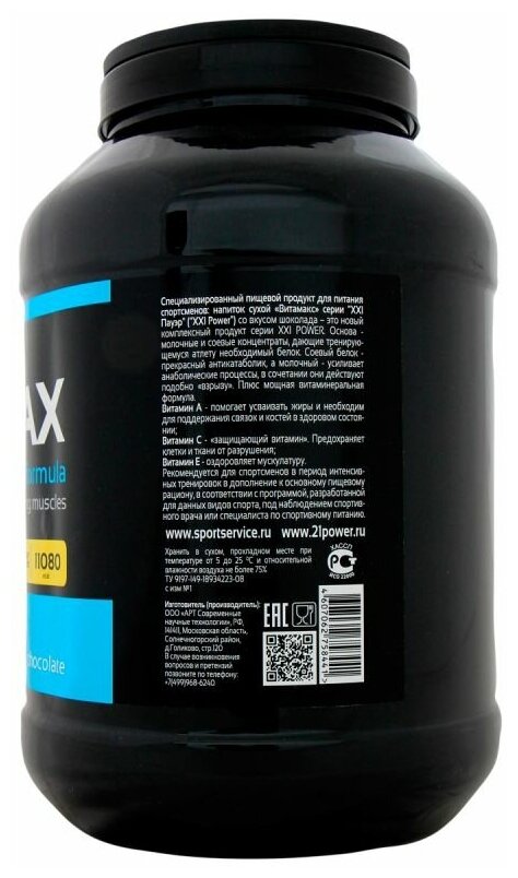 Type: high carbohydrate, protein type: multicomponent, 100 g calories: 304 kcal, dietary features: lactose free, maltodextrin free, saccharin free, contains aspartame