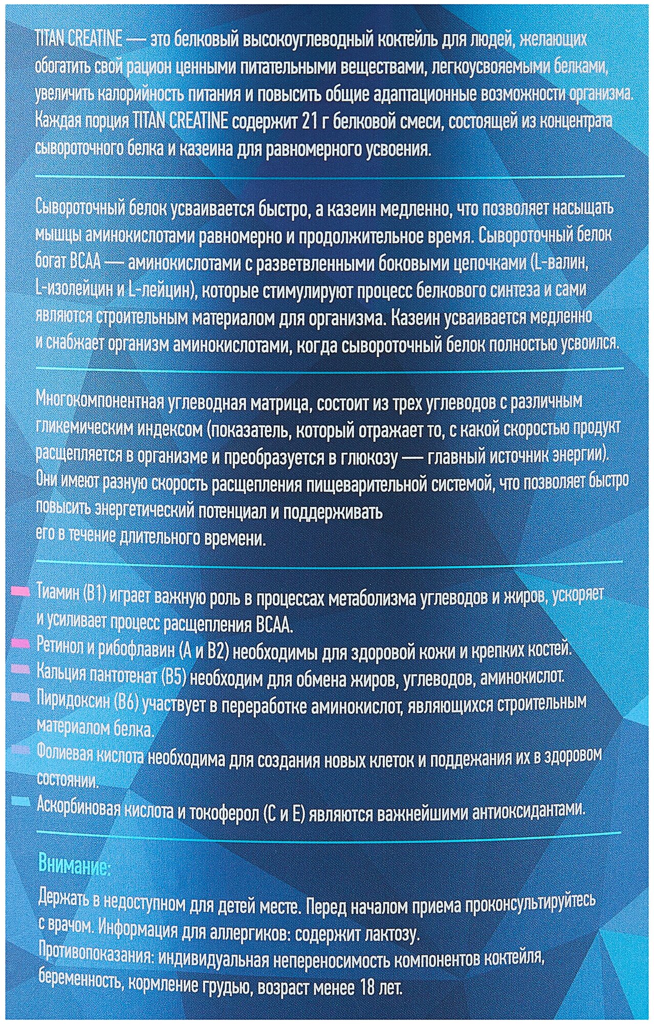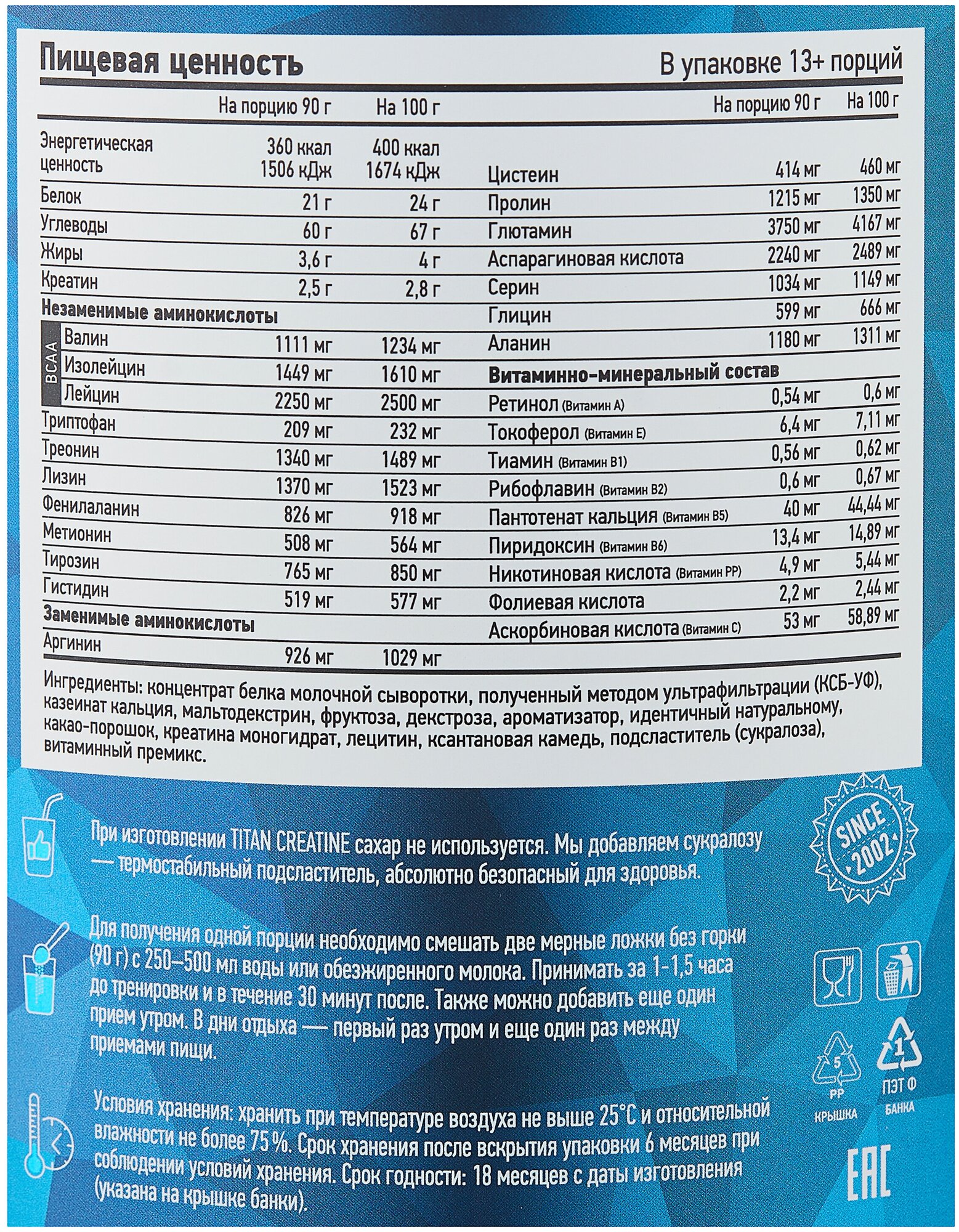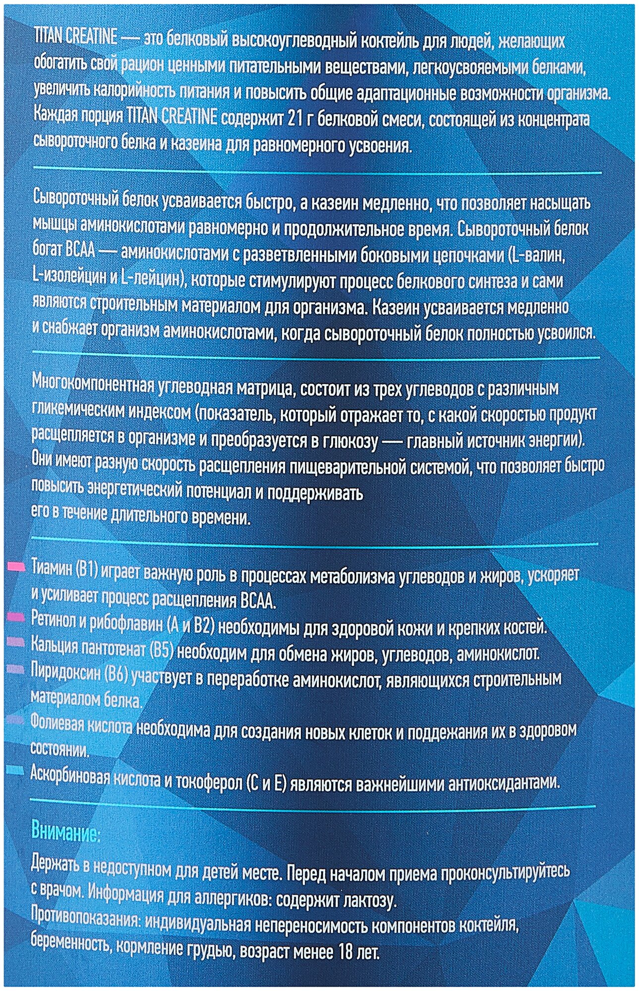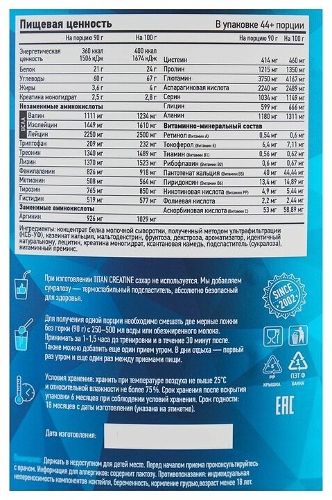 Description: Type: high-carbohydrate, type of protein: multicomponent, 100 g calories: 400 kcal, product form: powder, dietary features: non-GMO, no aspartame, no saccharin, contains maltodextrin, contains sucralose