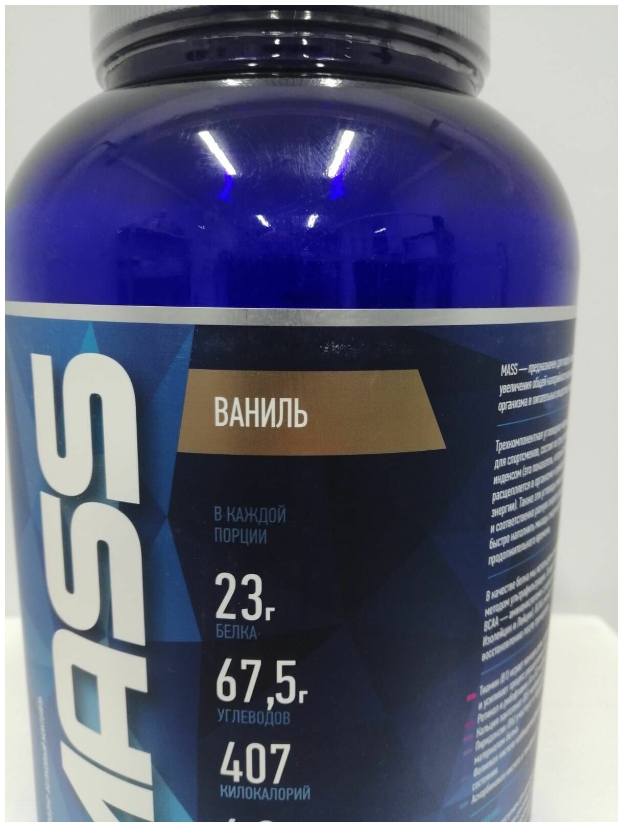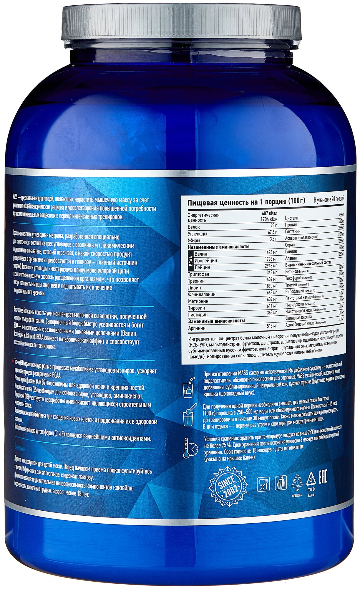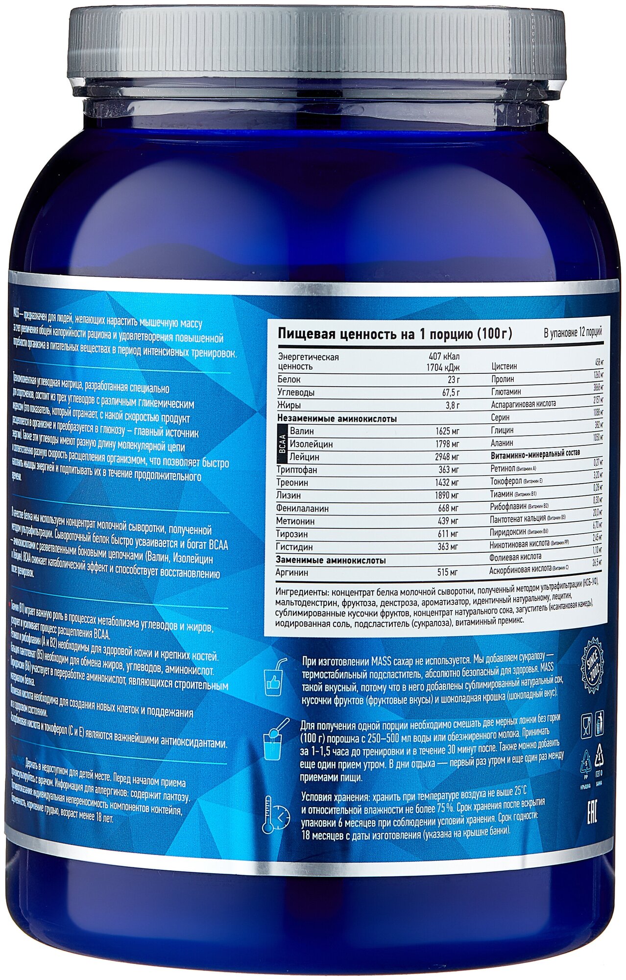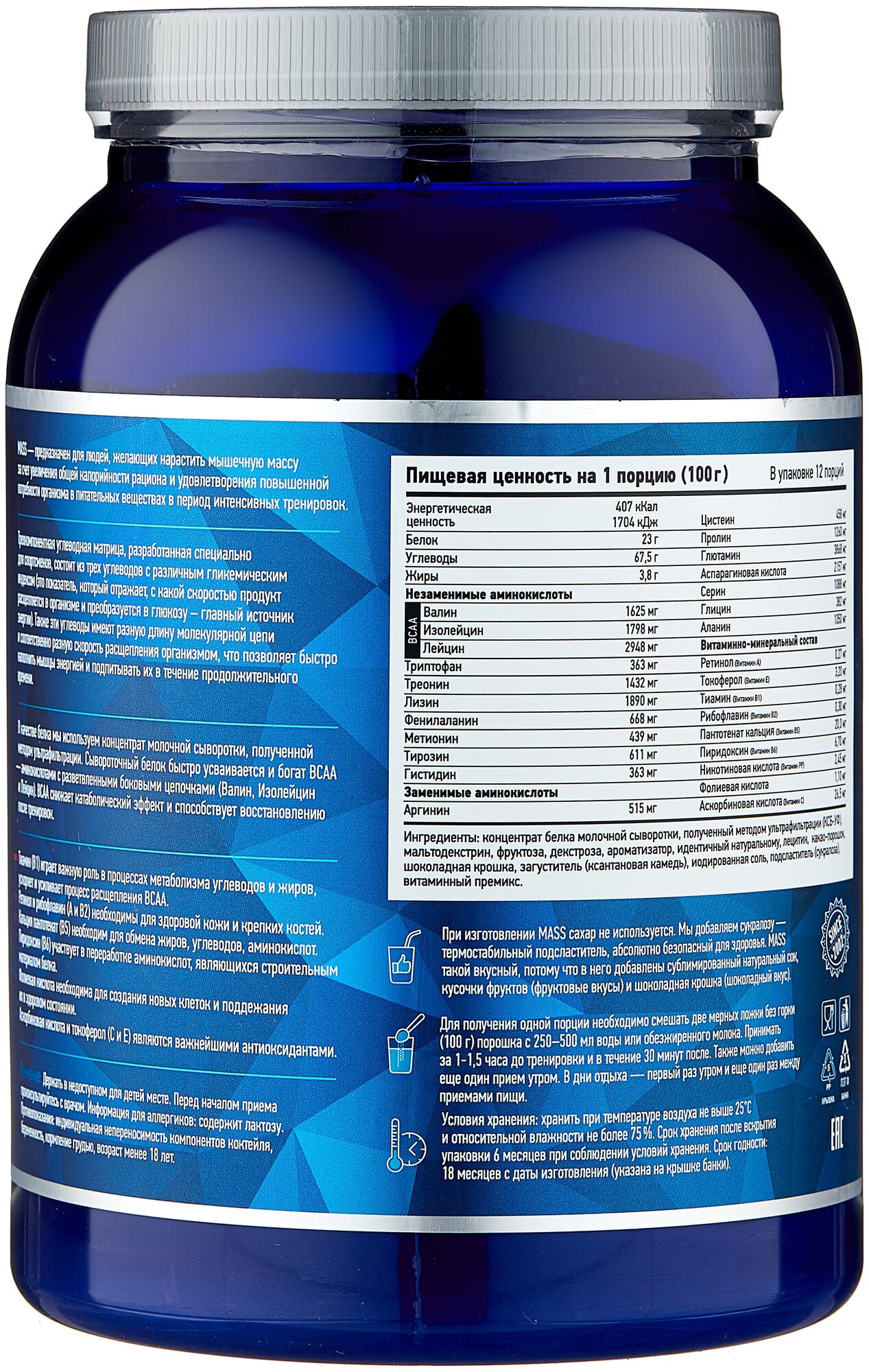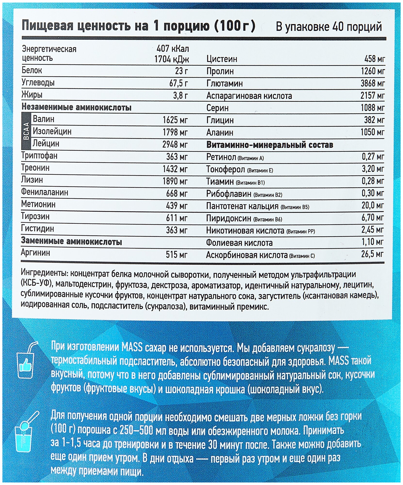 Description: Type: high-carbohydrate, type of protein: whey concentrate, calories per 100 g: 407 kcal, product form: powder, dietary features: non-GMO, no aspartame, vegetarian, contains maltodextrin, contains sucralose