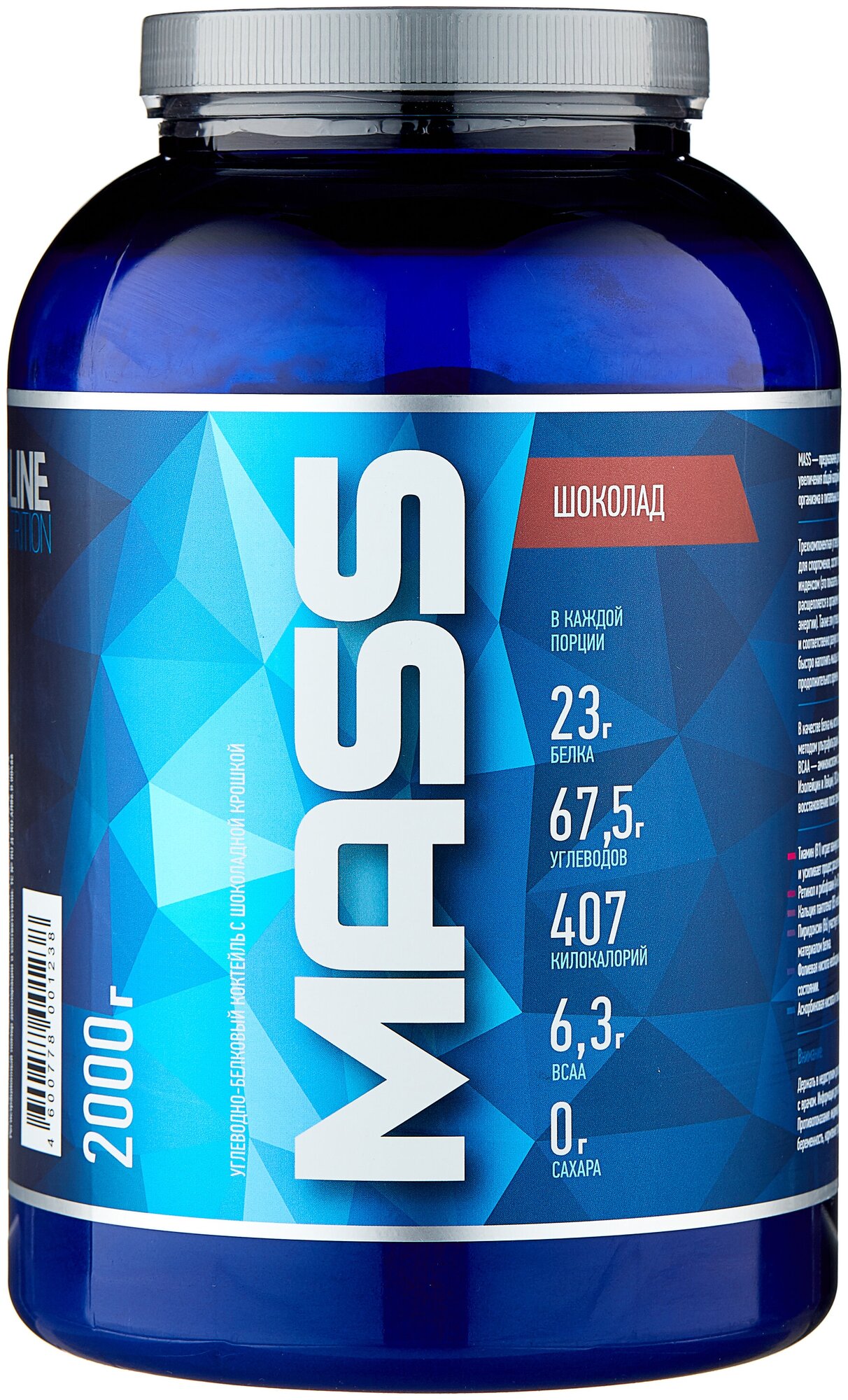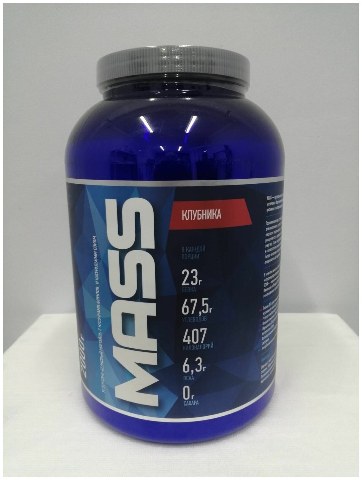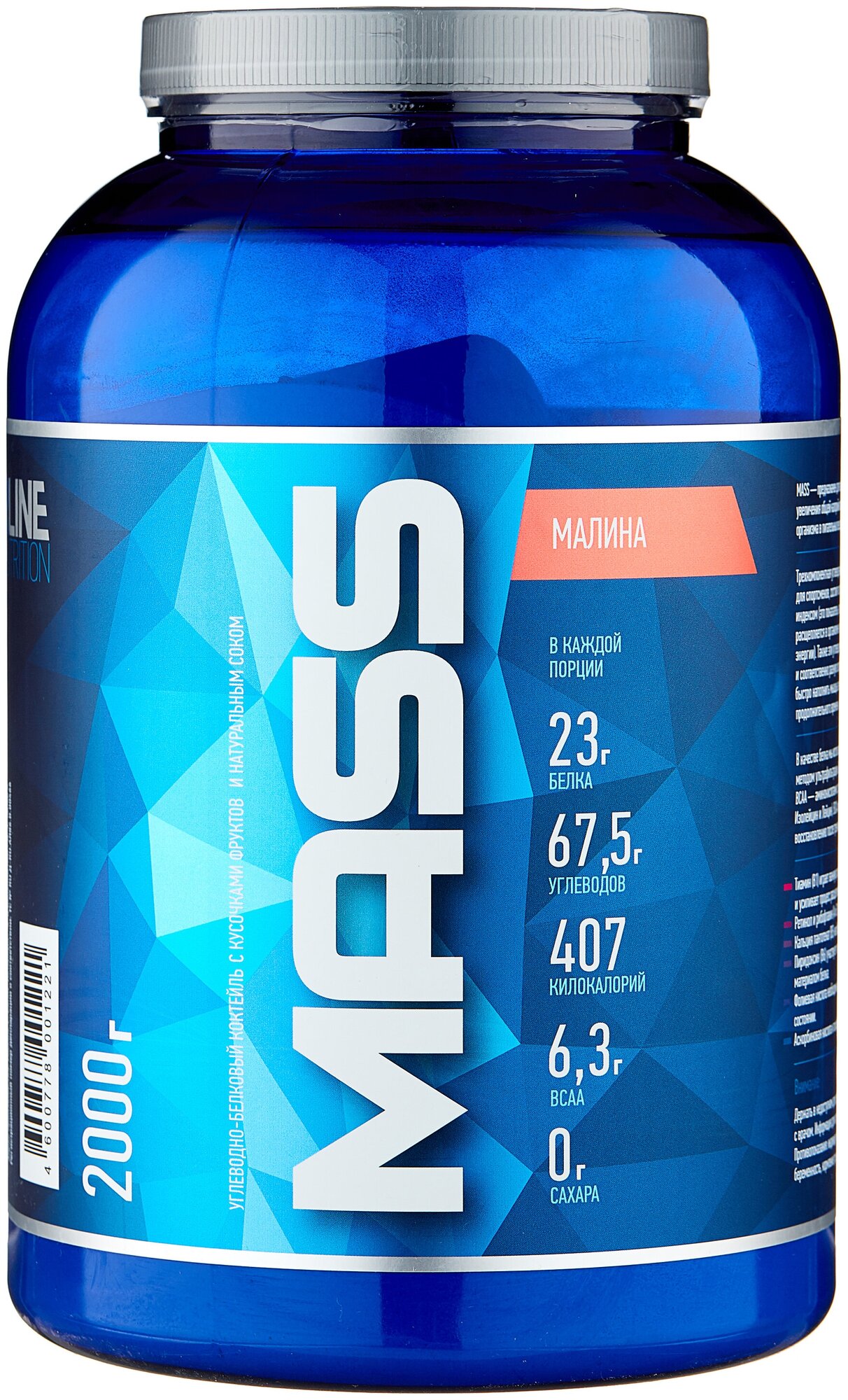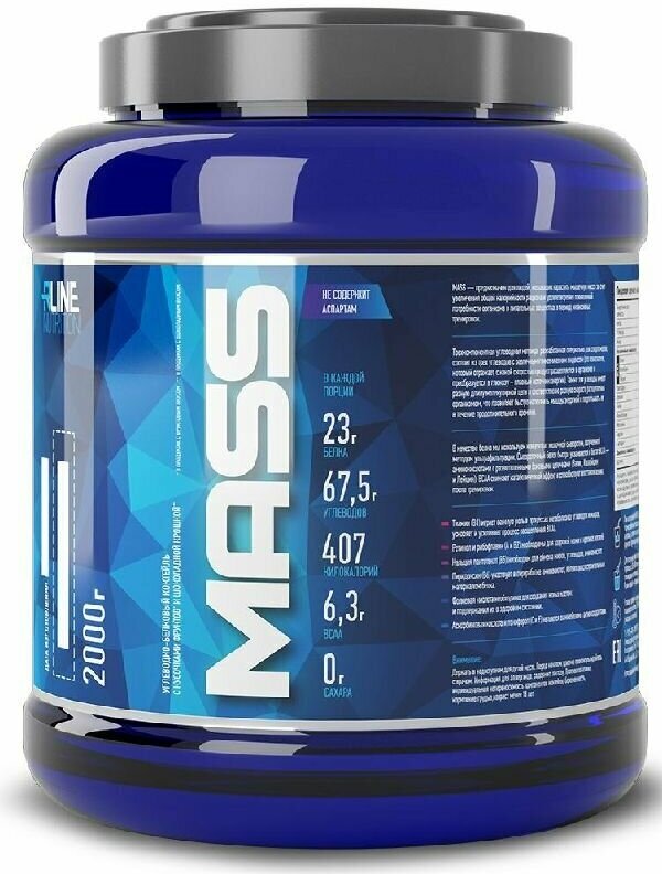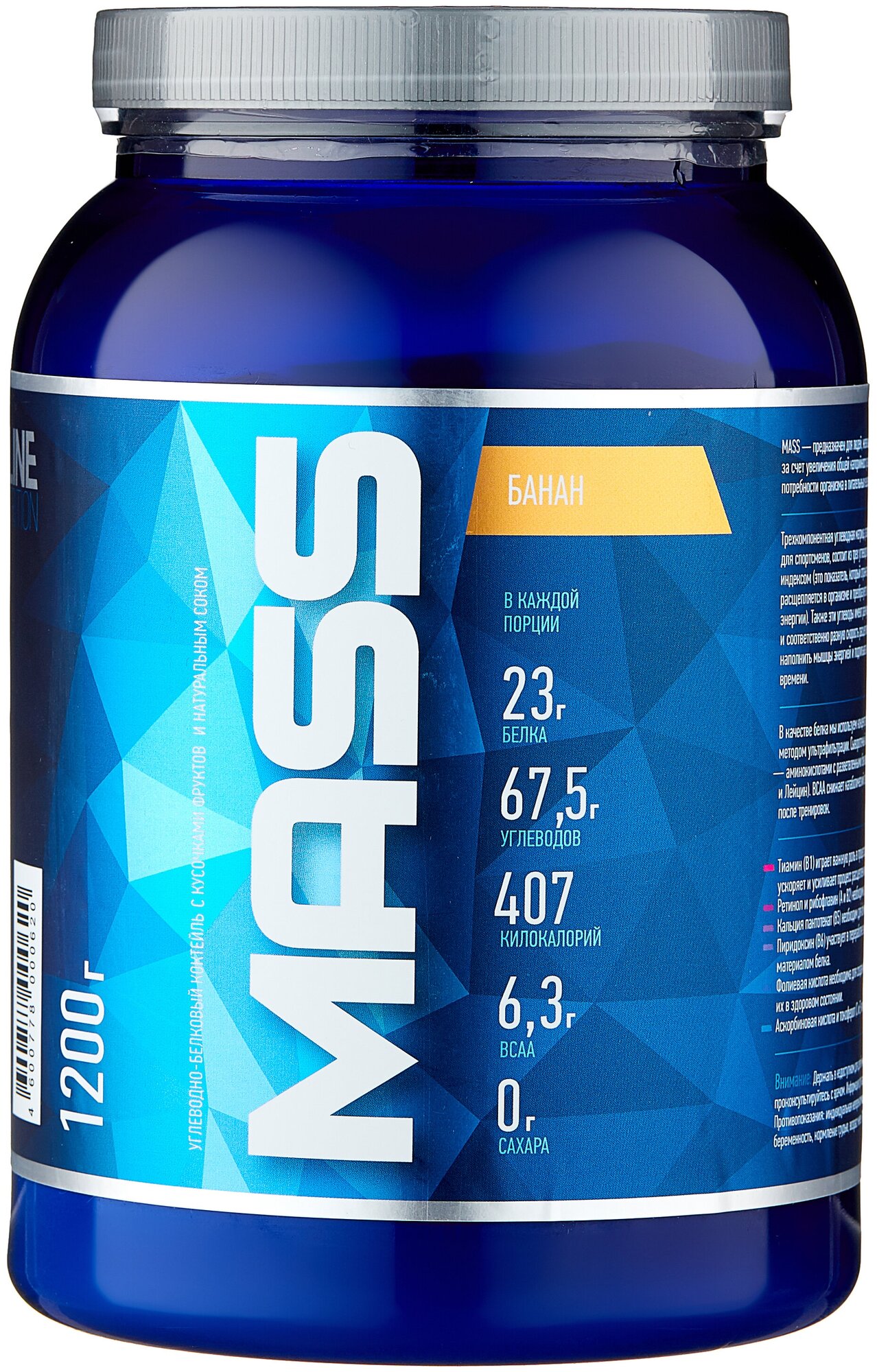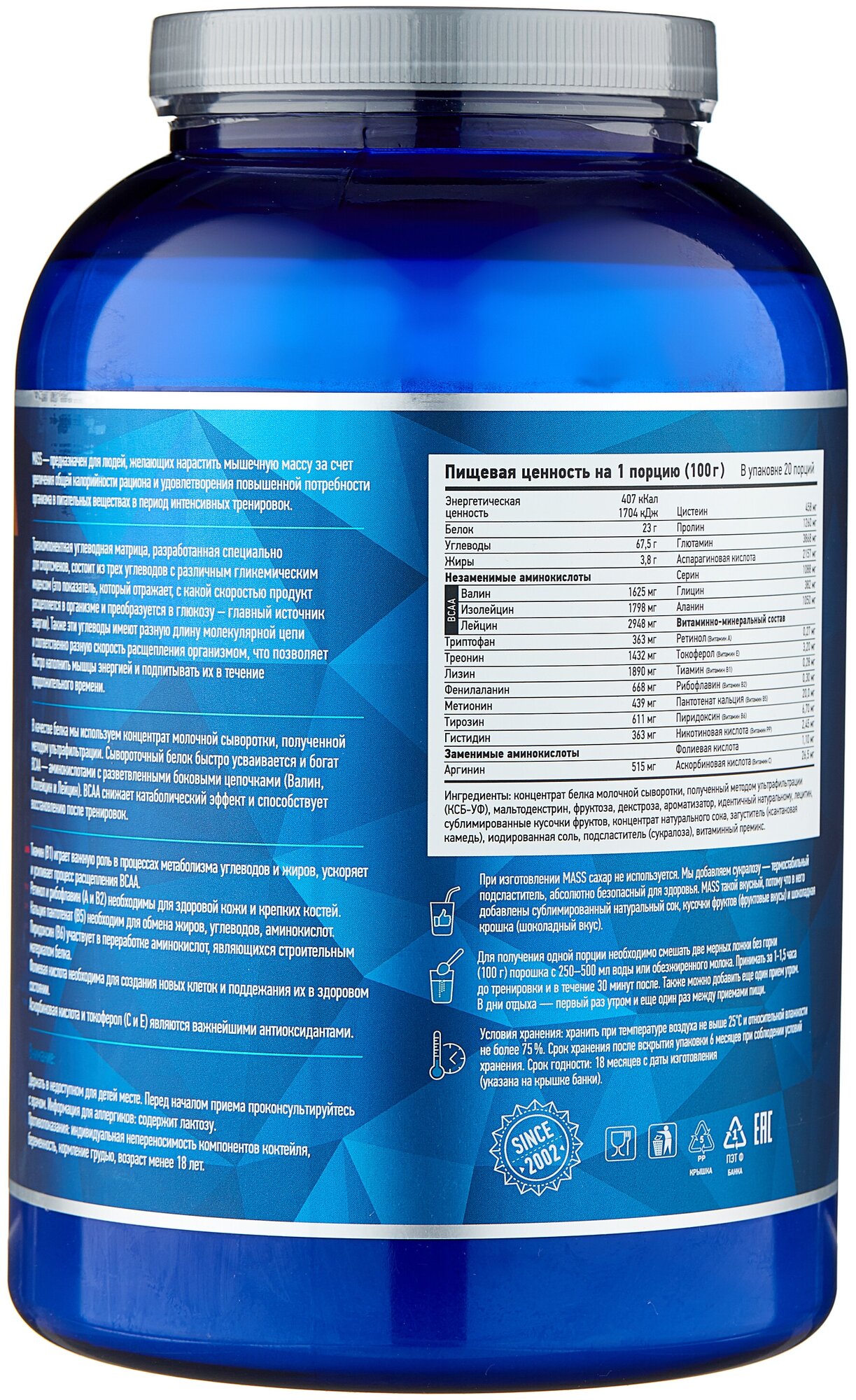 Description: Type: high-carbohydrate, type of protein: whey concentrate, calories per 100 g: 407 kcal, product form: powder, dietary features: non-GMO, no aspartame, vegetarian, contains maltodextrin, contains sucralose