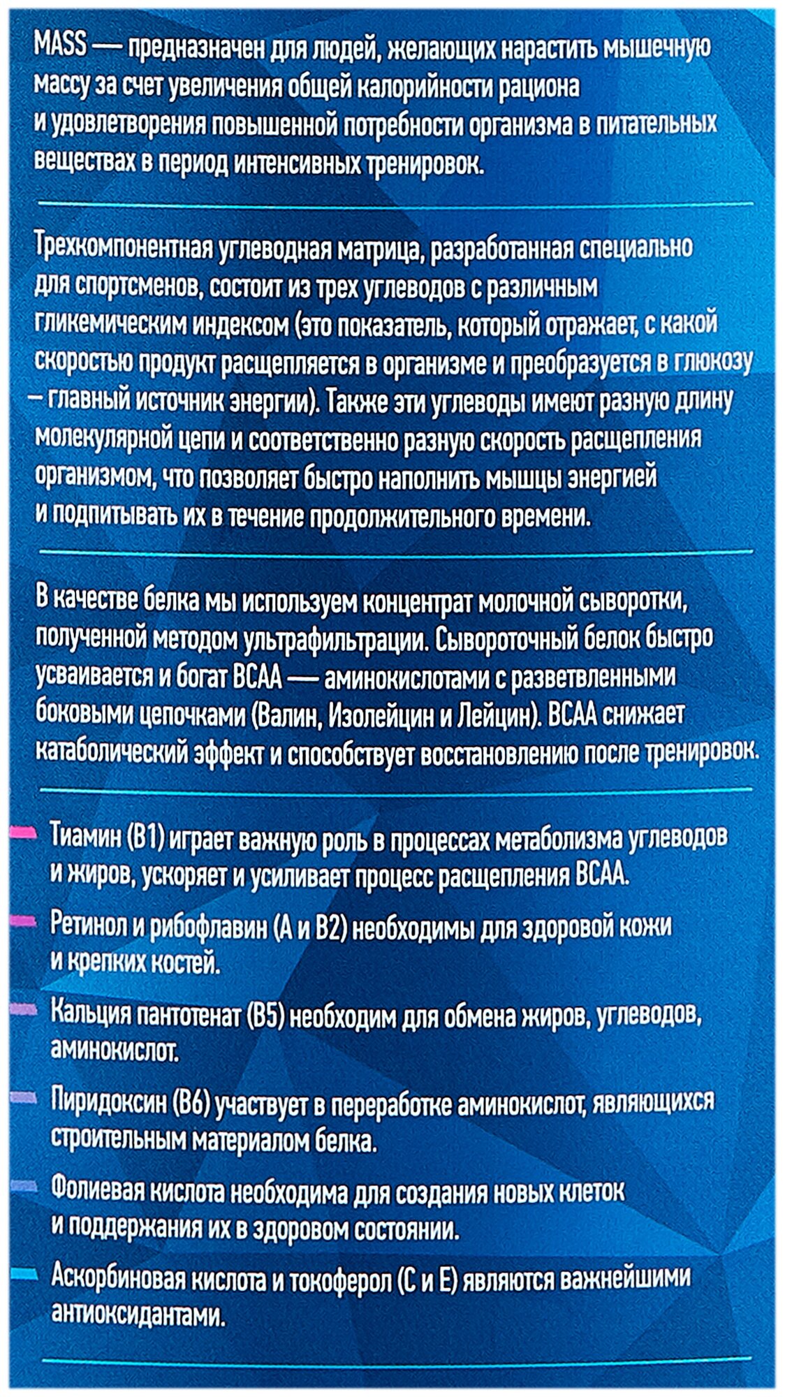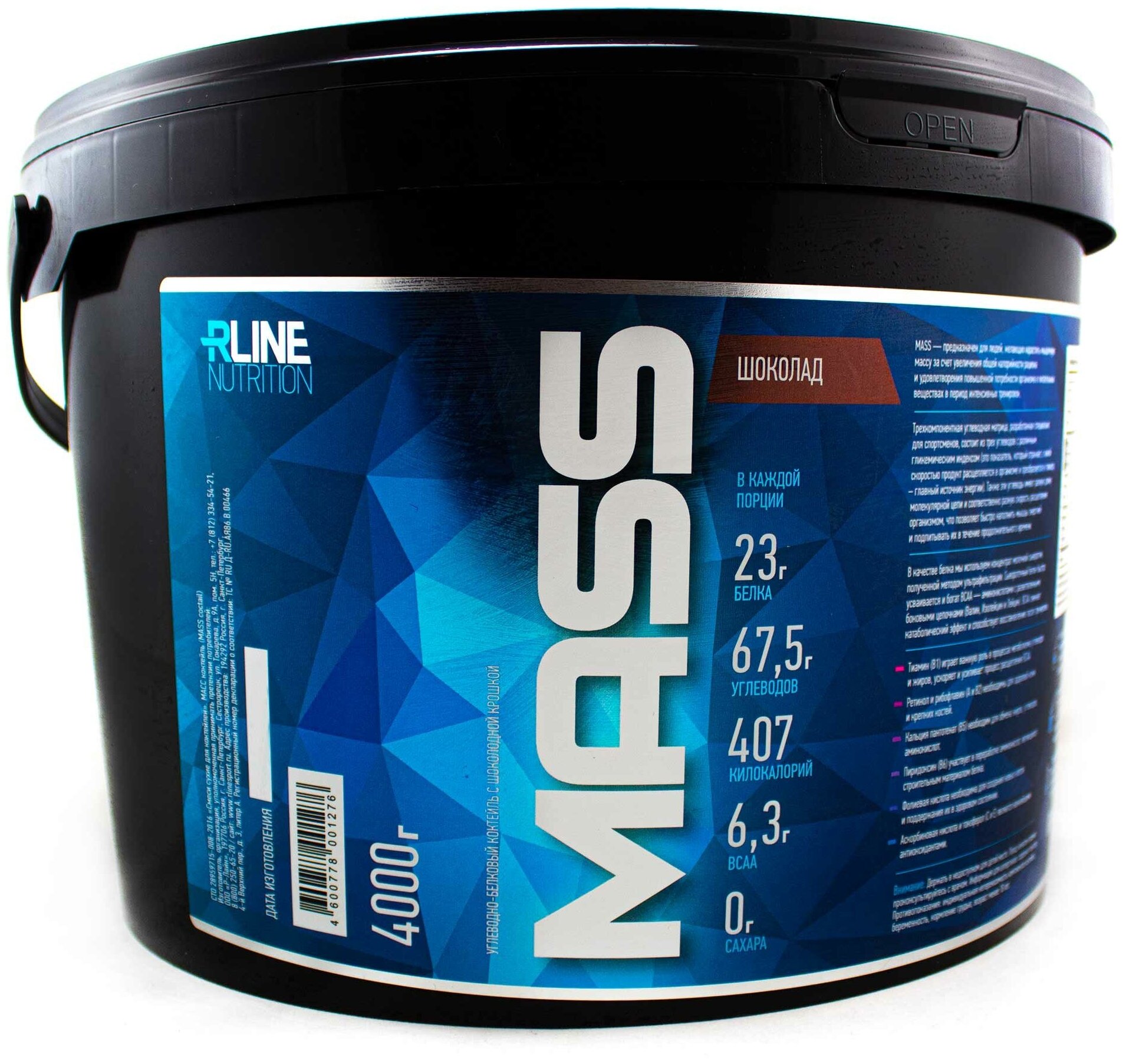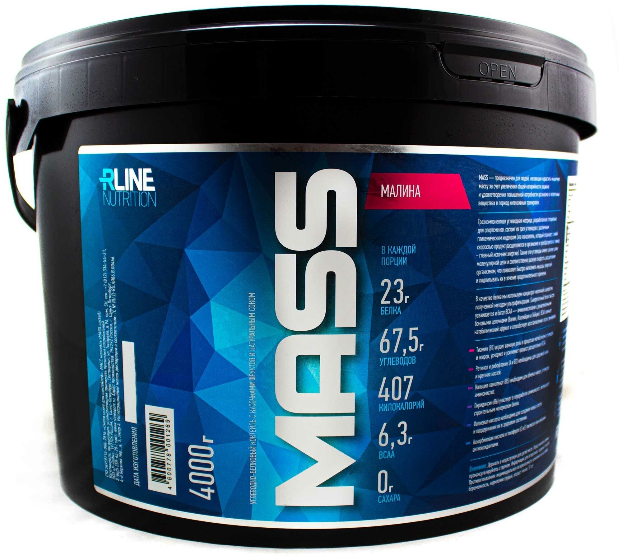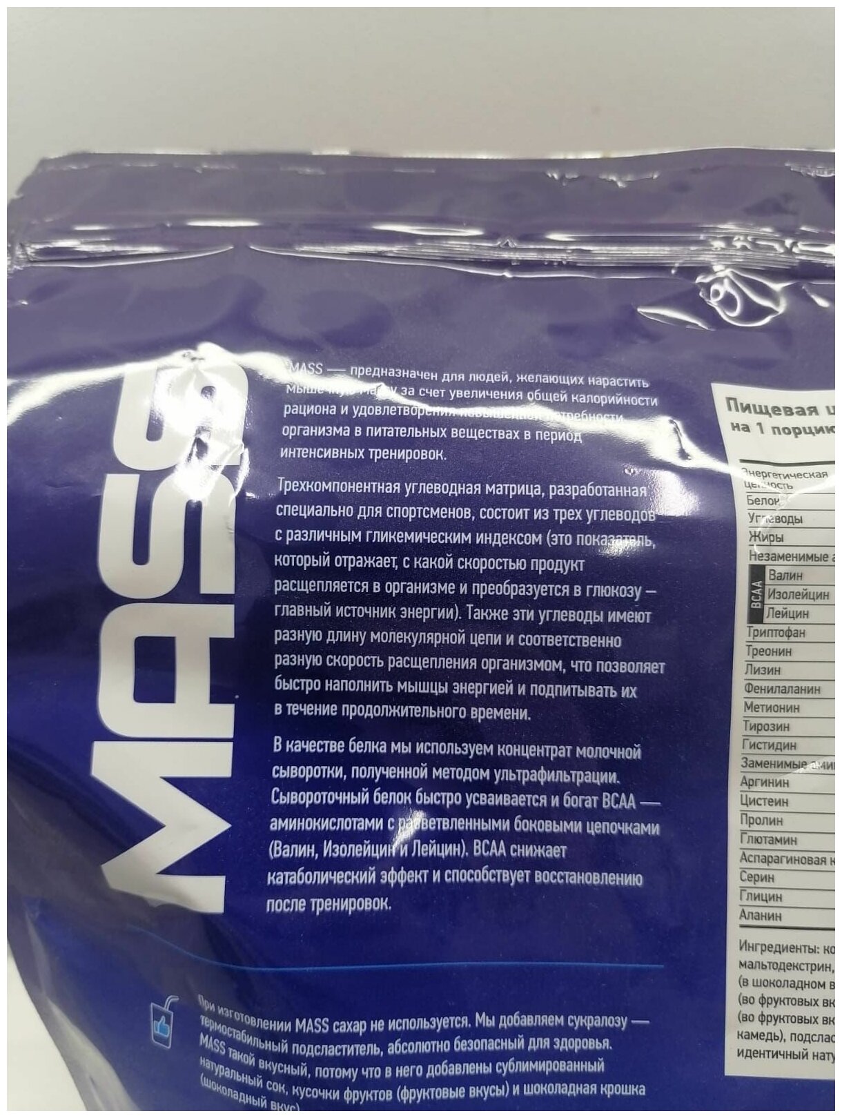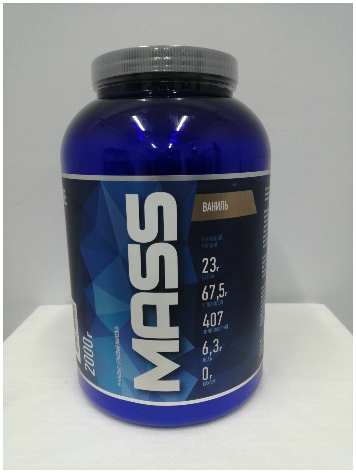 Description: Type: high-carbohydrate, type of protein: whey concentrate, calories per 100 g: 407 kcal, product form: powder, dietary features: non-GMO, no aspartame, vegetarian, contains maltodextrin, contains sucralose