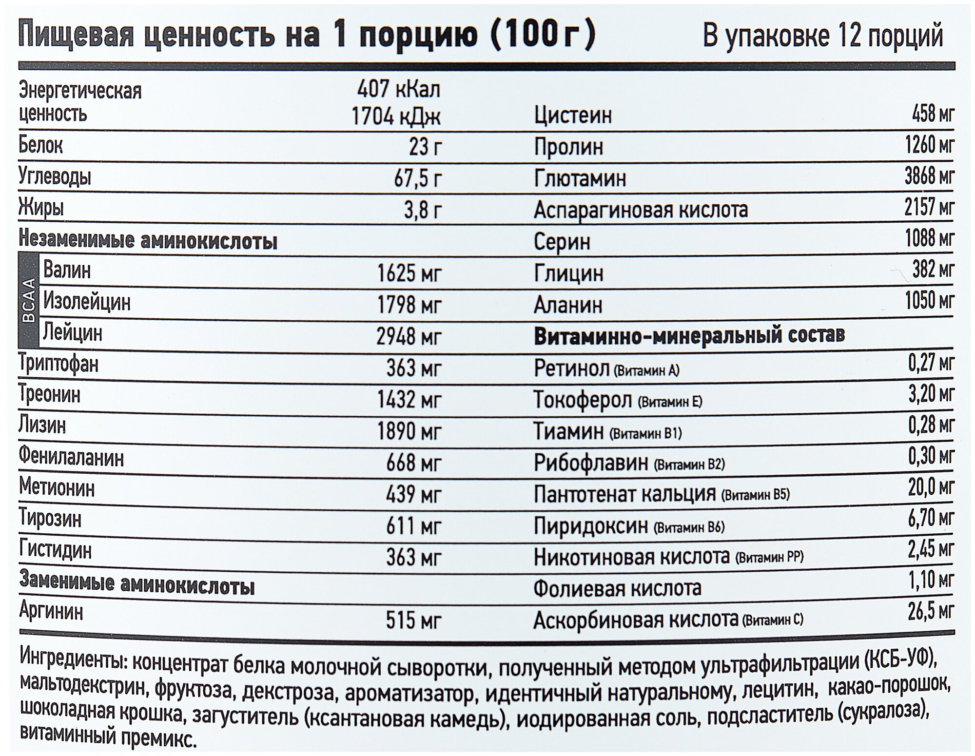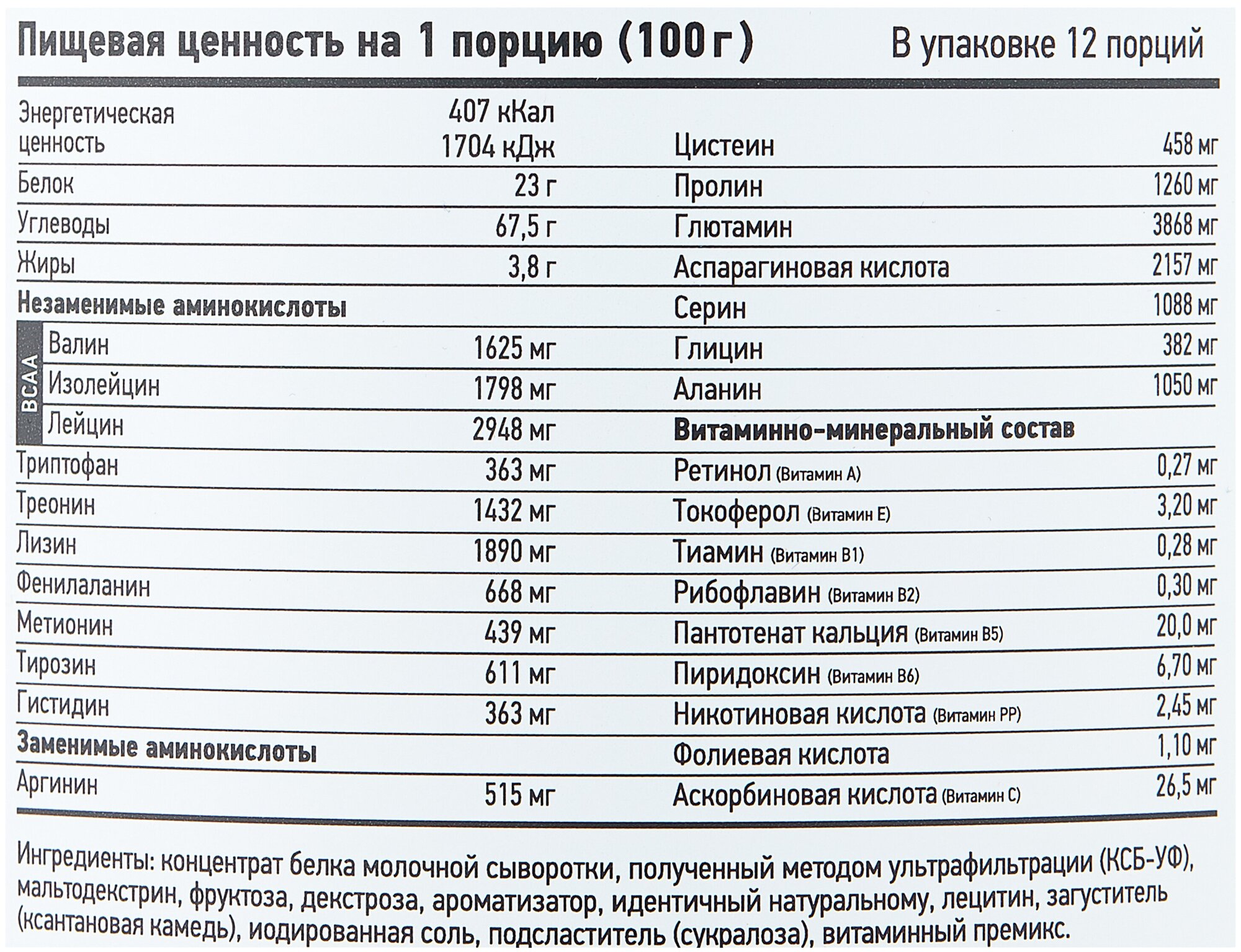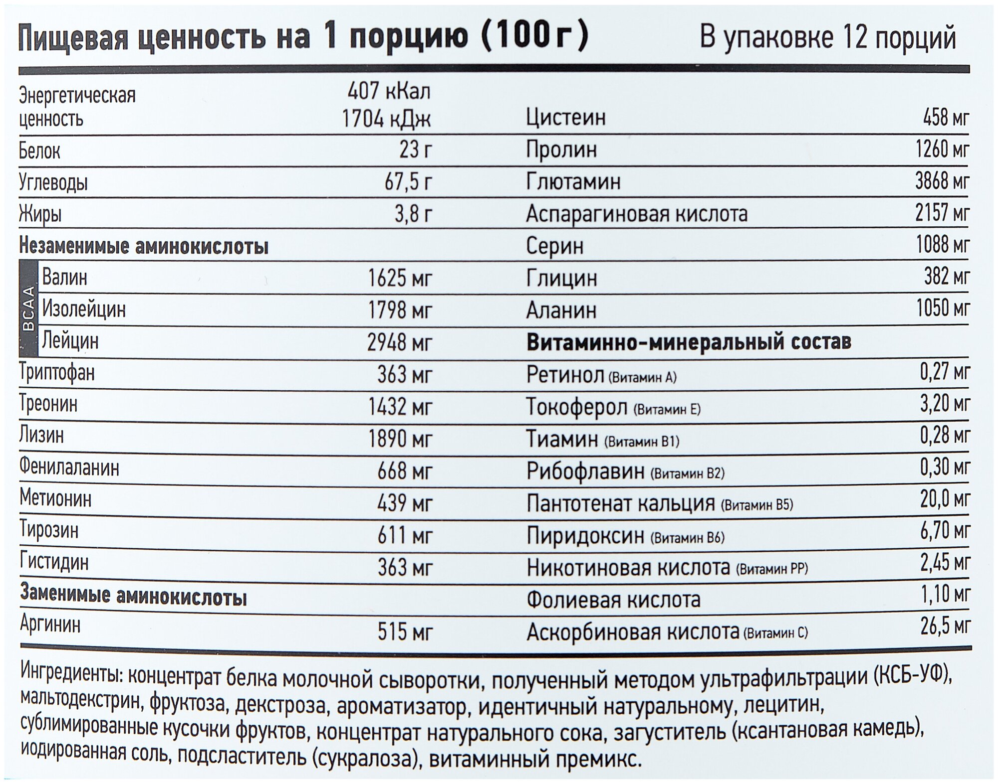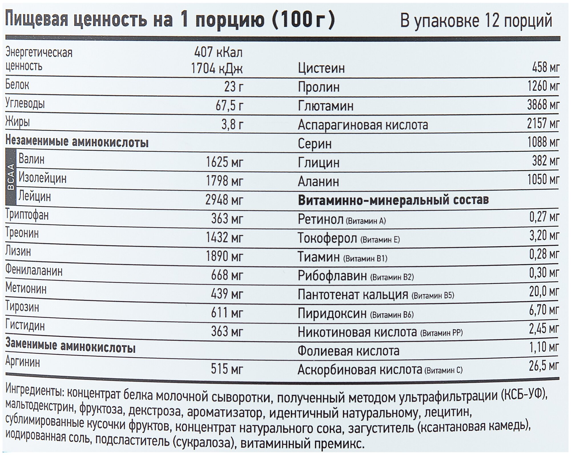 Additional Information: Serving Size: 100 g; serving calorie content: 407 kcal; Directions for use: For one serving, mix two scoops of 100 g of powder with 250-500 ml of water or skim milk; take 1-1.5 hours before