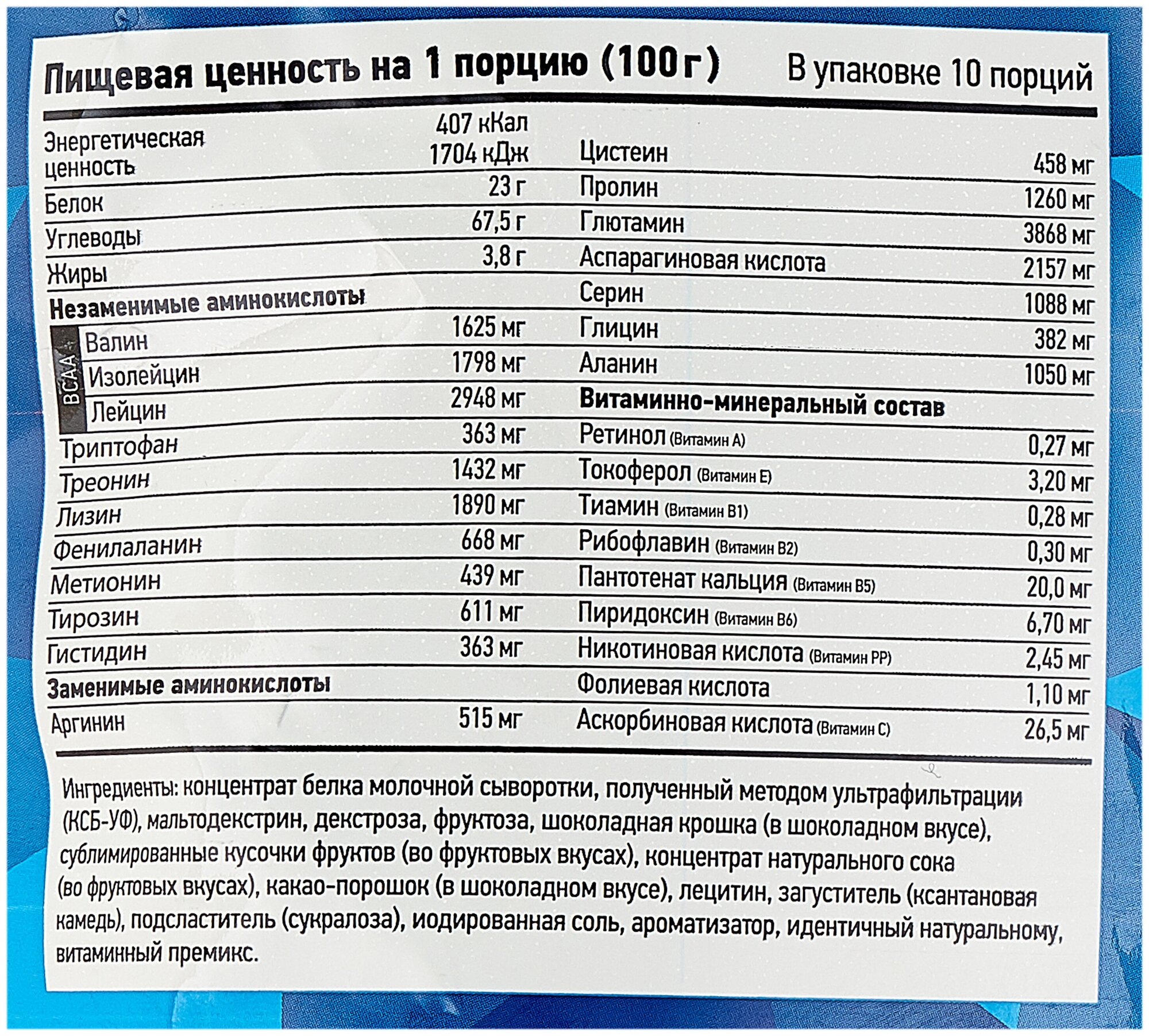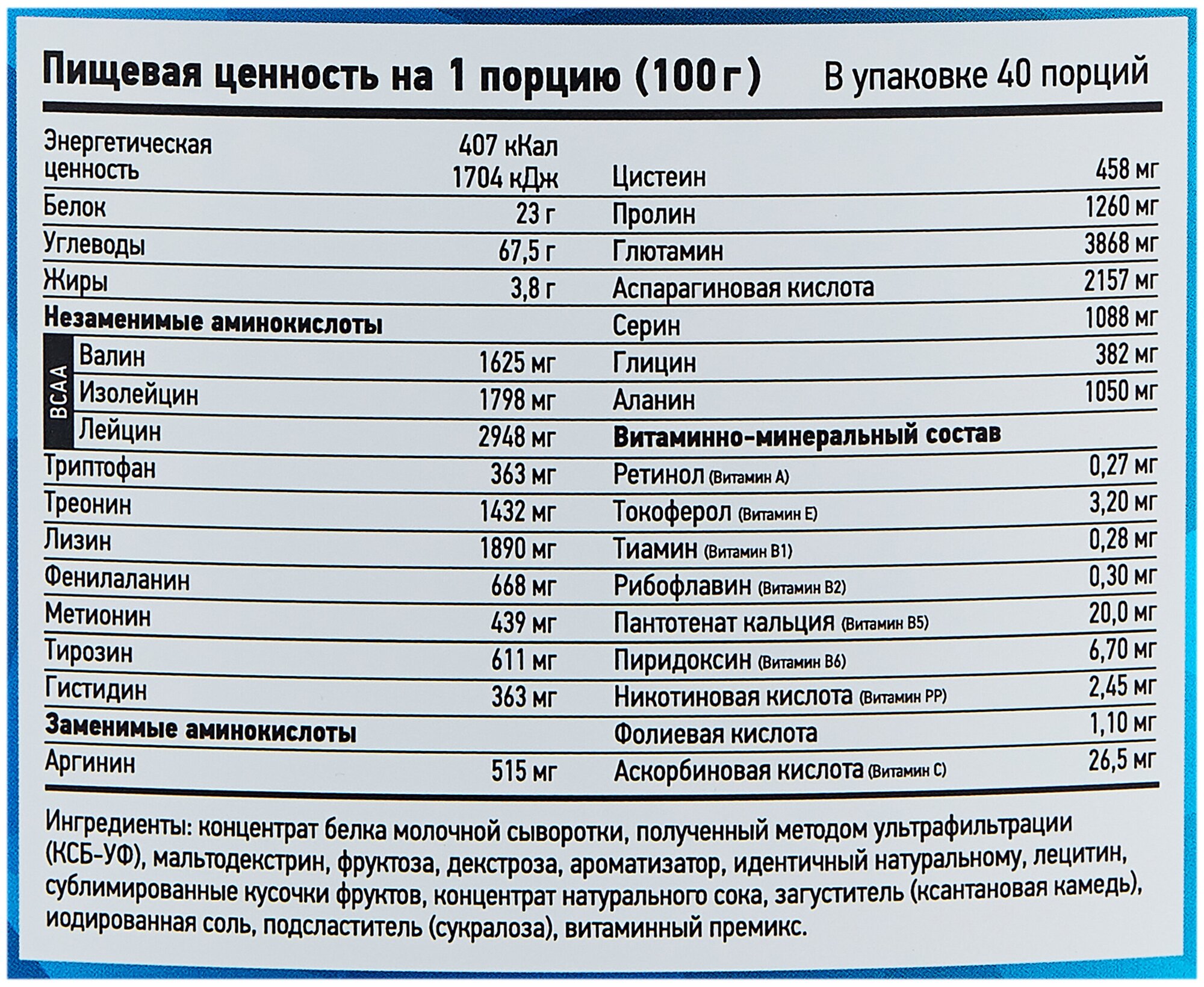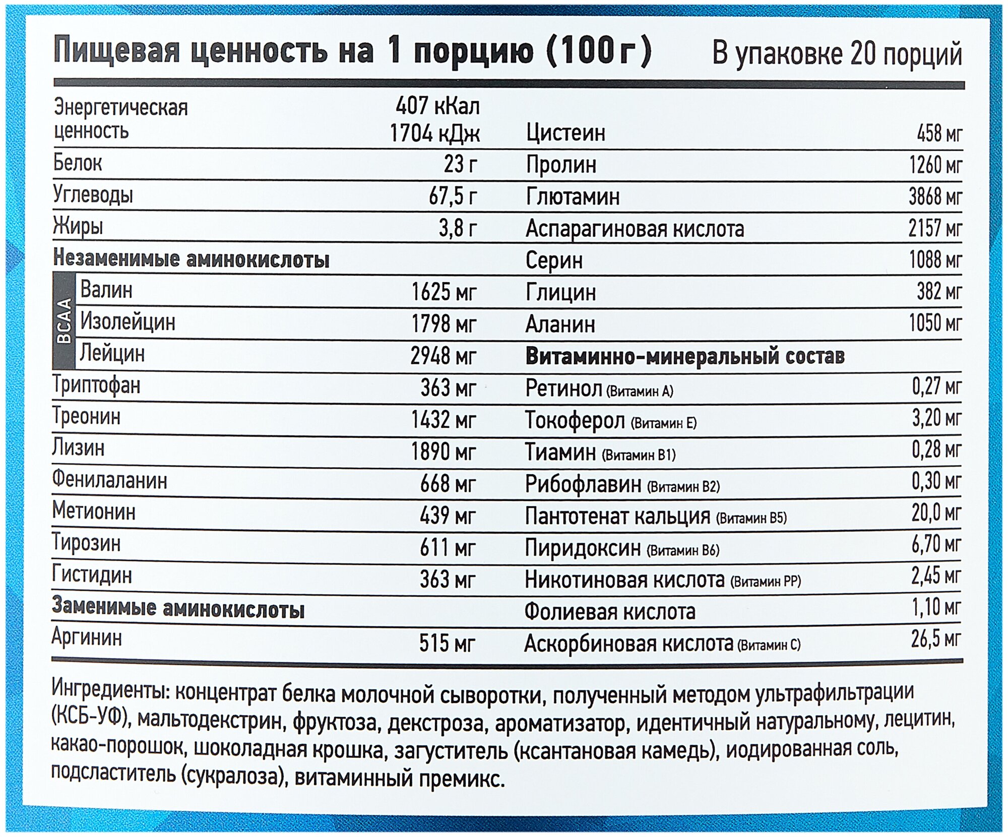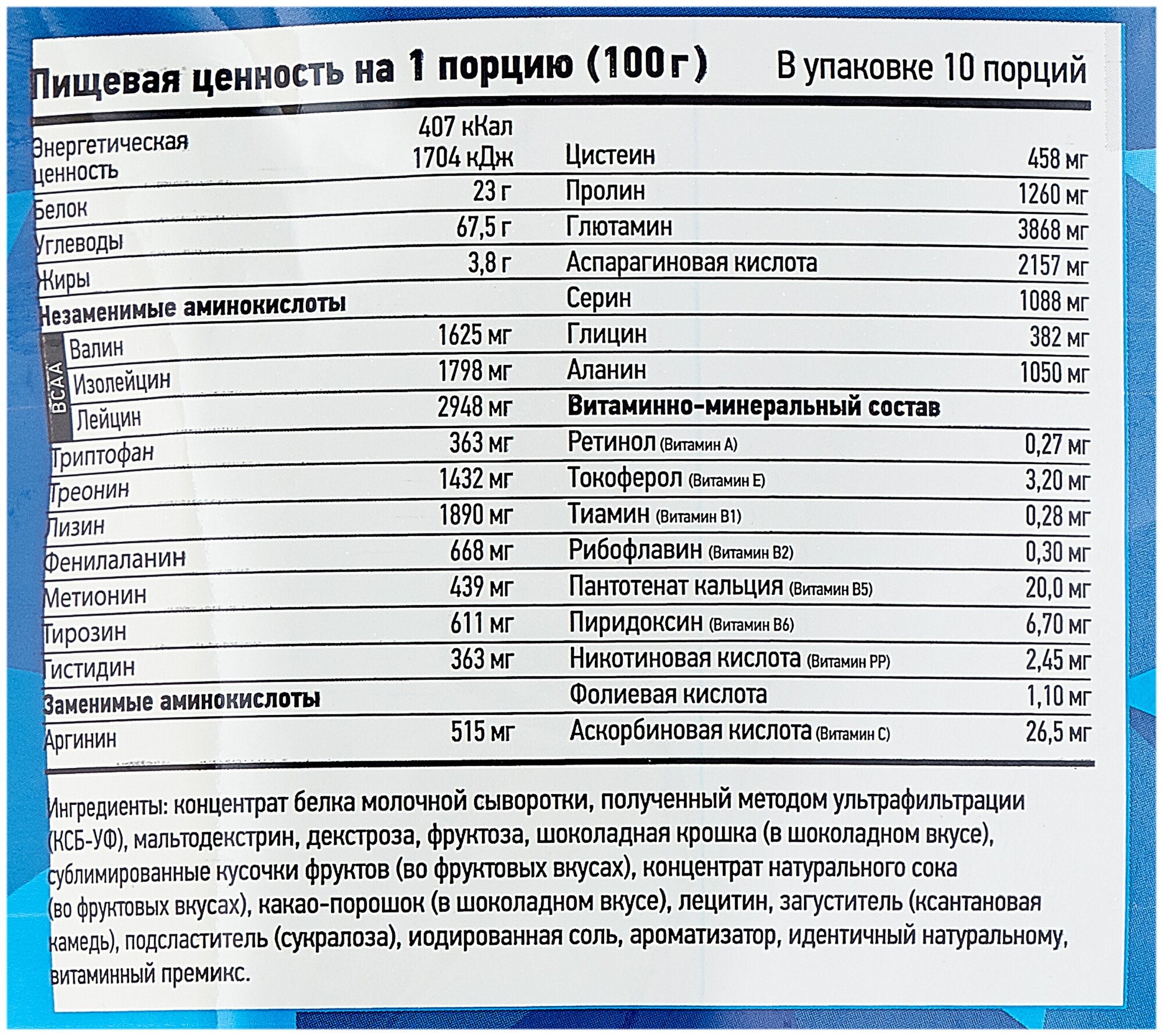 Additional Information: Serving Size: 100 g; serving calorie content: 407 kcal; Directions for use: For one serving, mix two scoops of 100 g of powder with 250-500 ml of water or skim milk; take 1-1.5 hours before