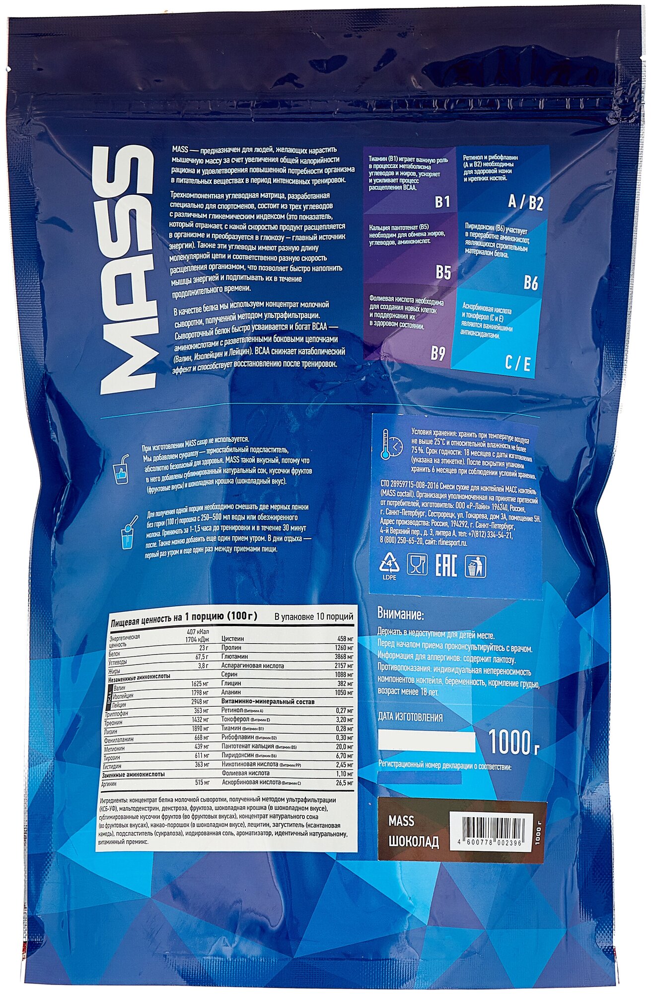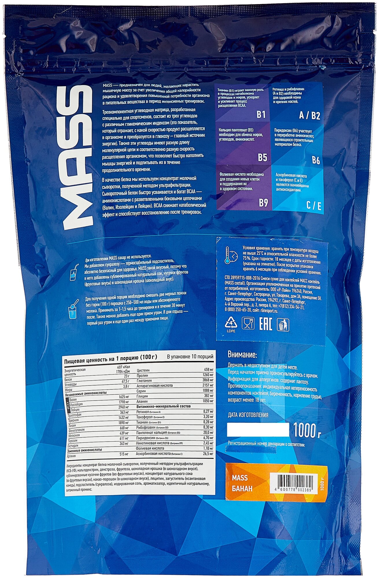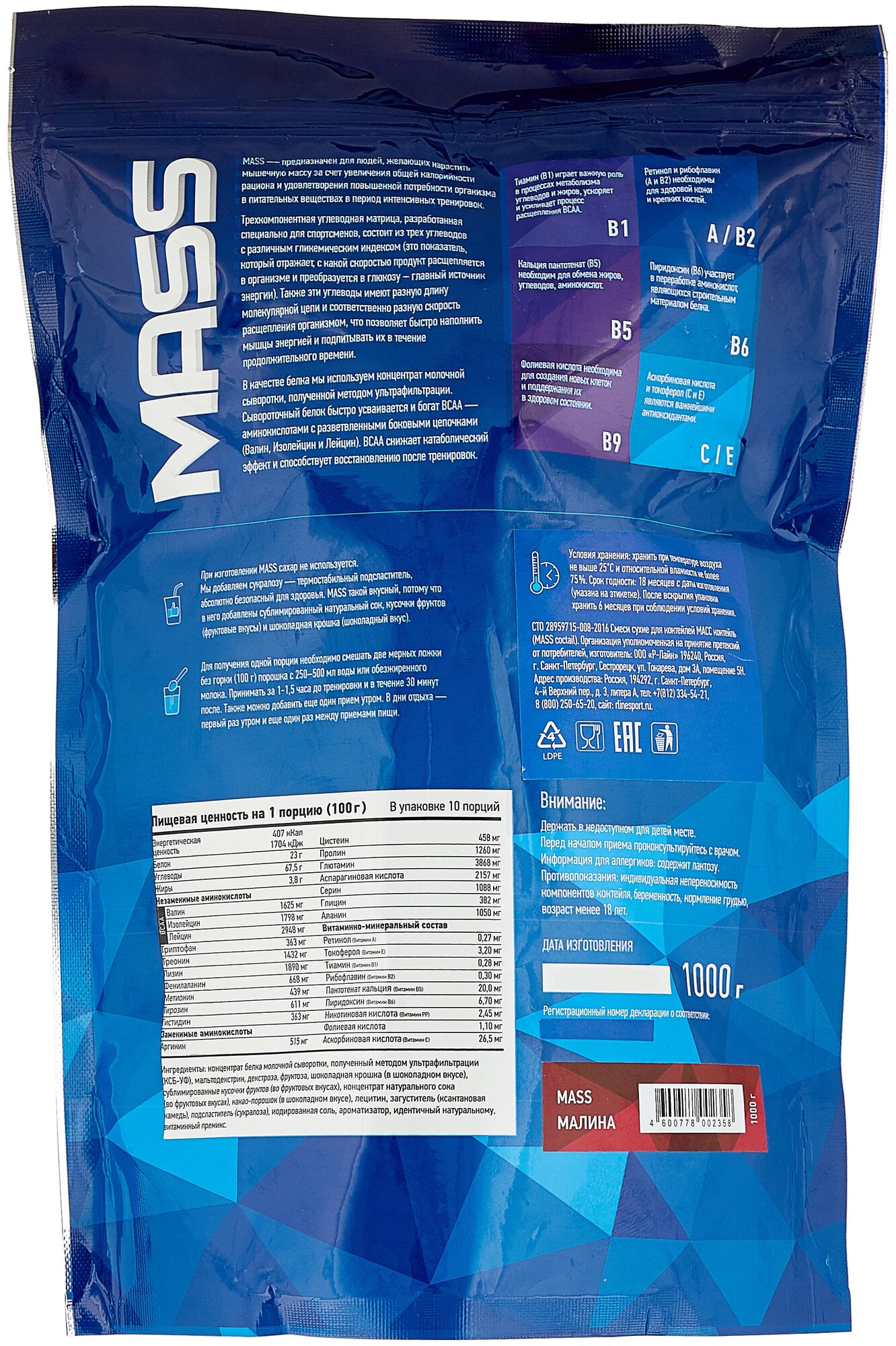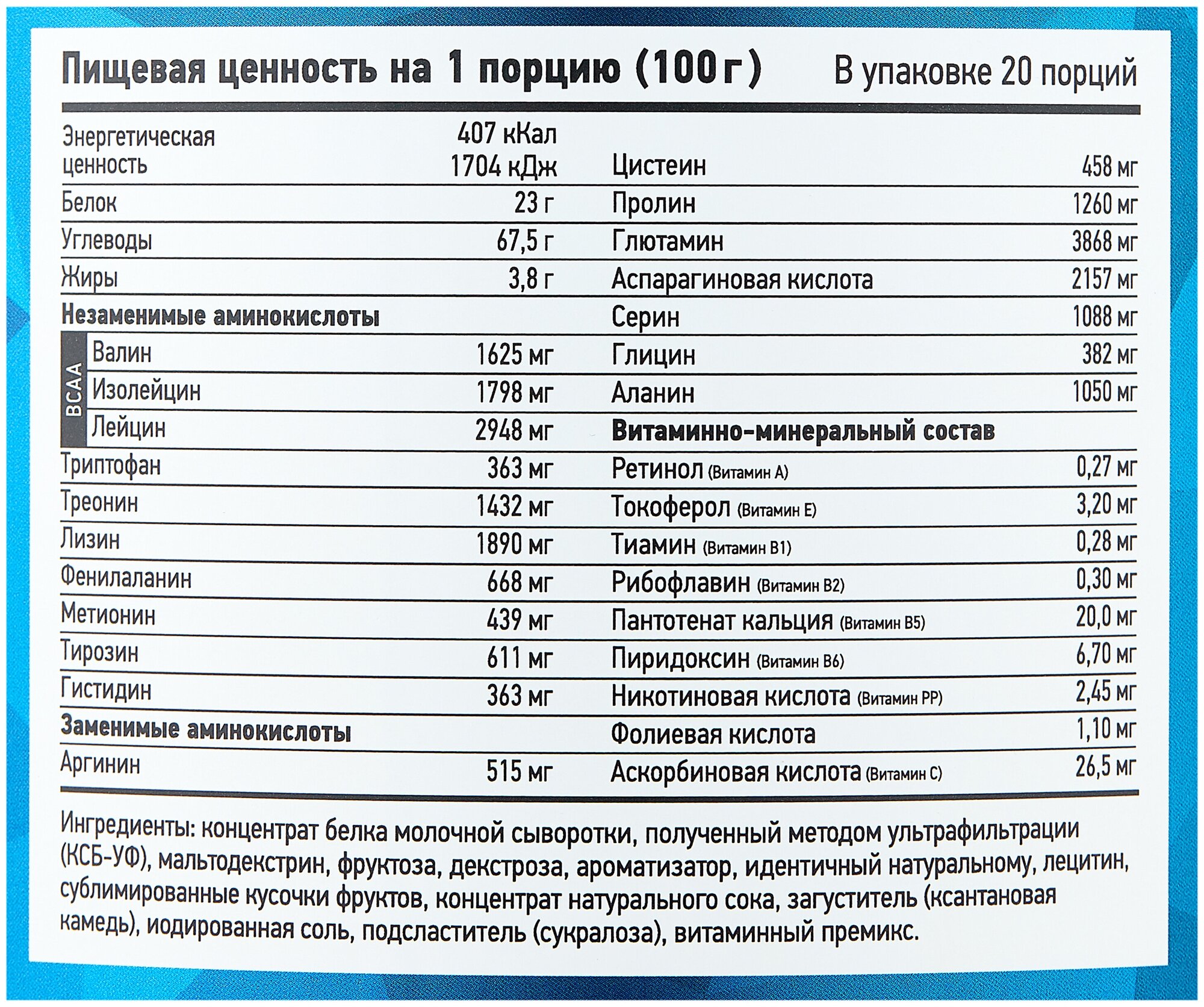 Additional Information: Serving Size: 100 g; serving calorie content: 407 kcal; Directions for use: For one serving, mix two scoops of 100 g of powder with 250-500 ml of water or skim milk; take 1-1.5 hours before