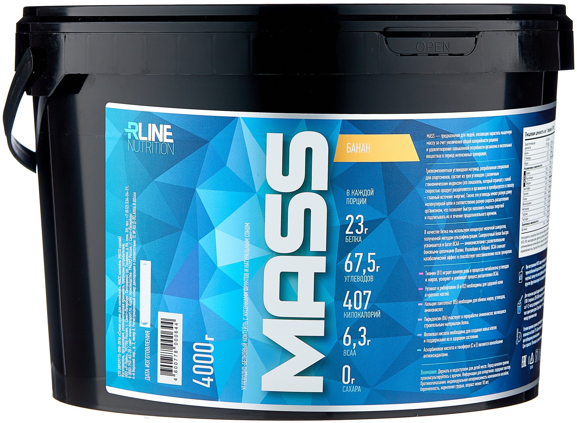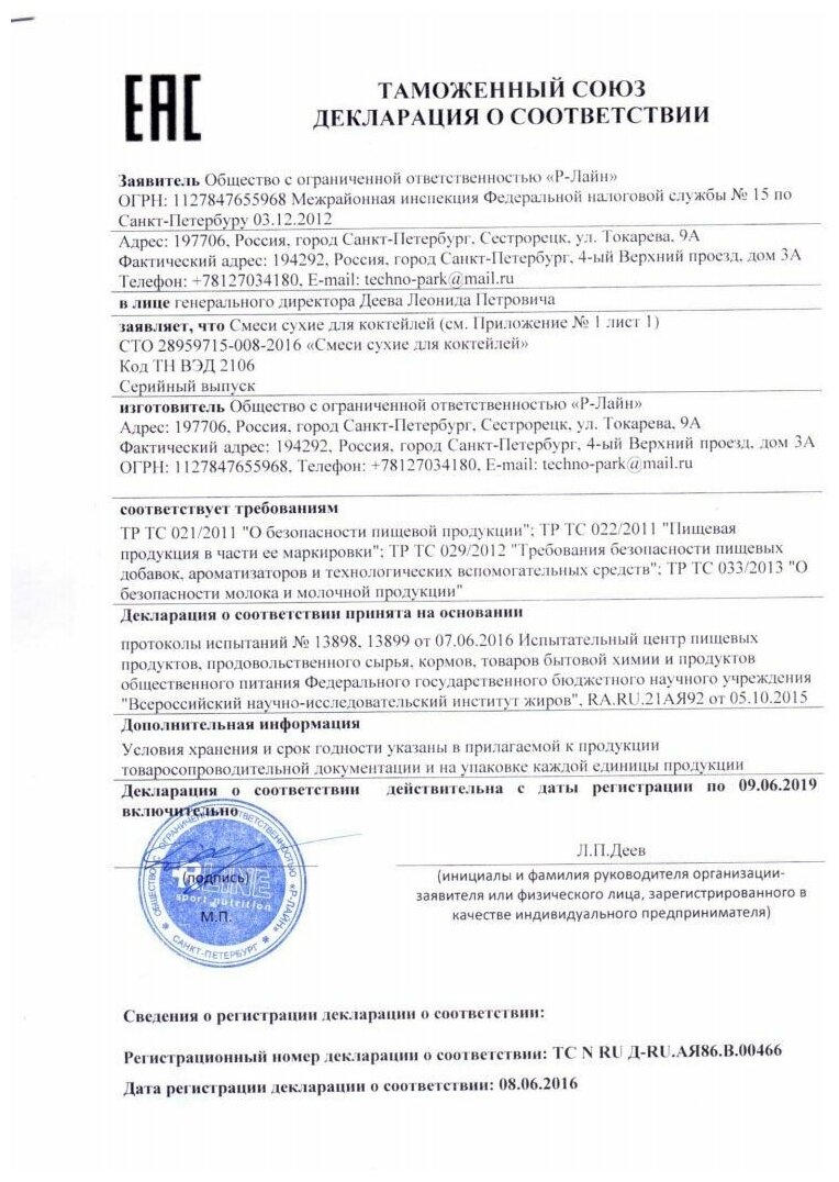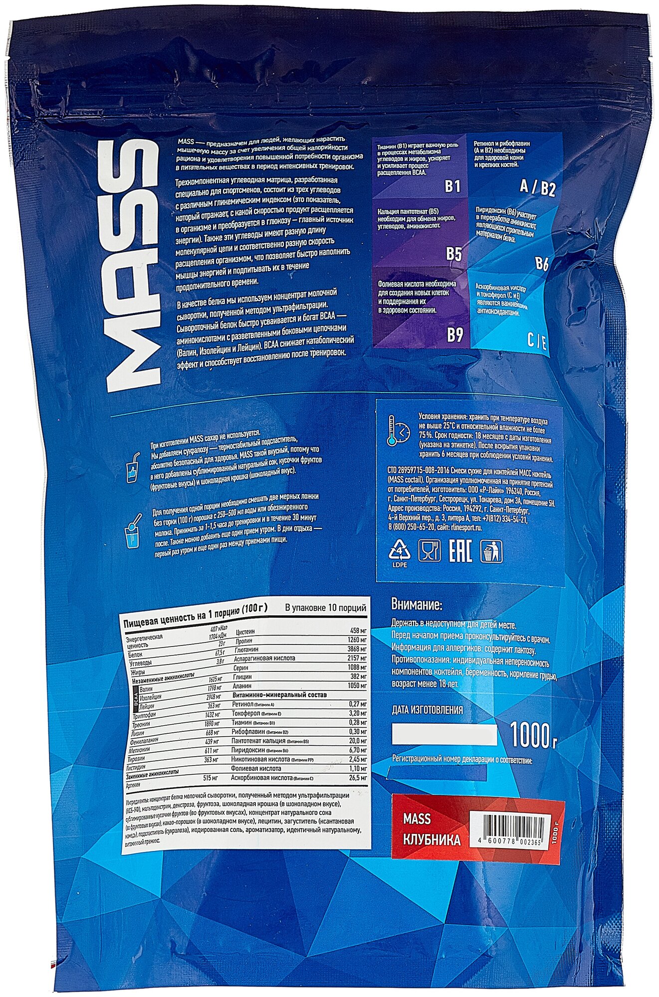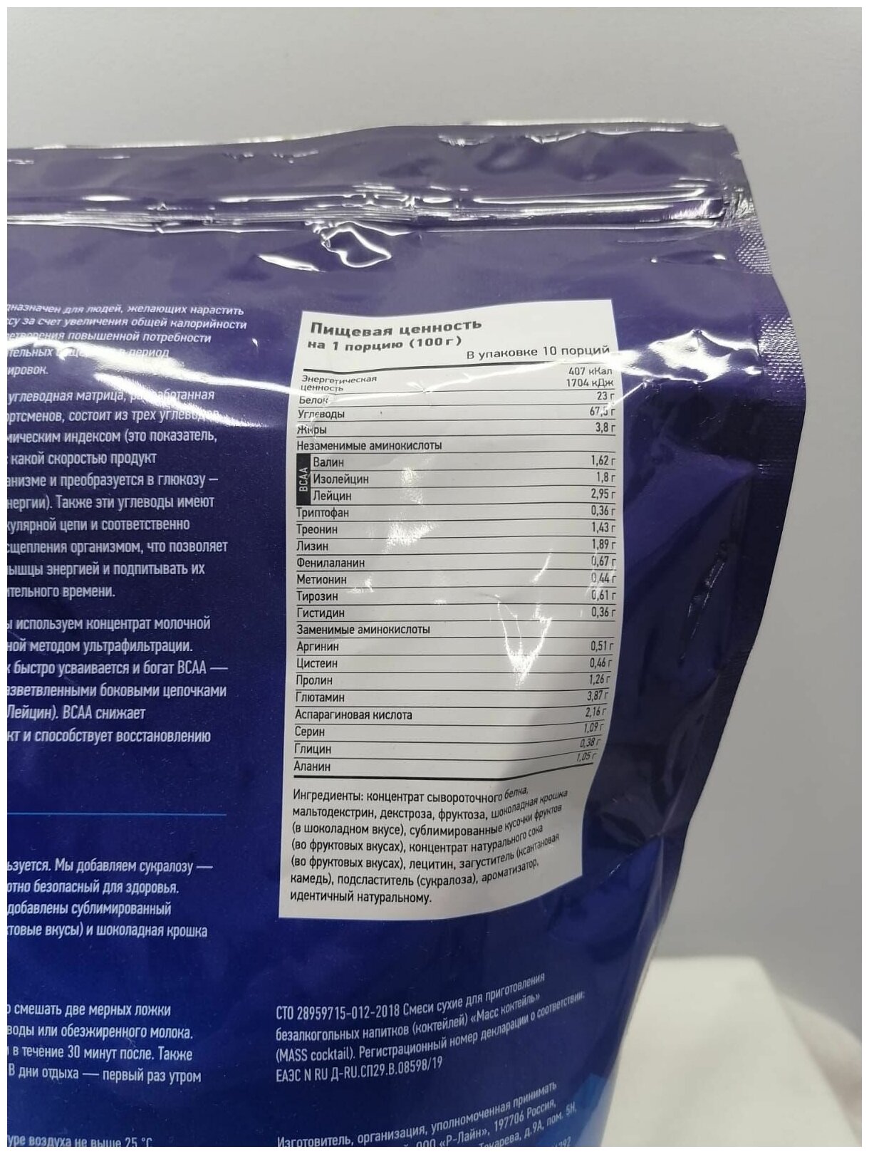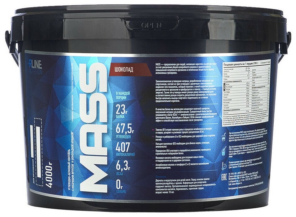 Additional Information: Serving Size: 100 g; serving calorie content: 407 kcal; Directions for use: For one serving, mix two scoops of 100 g of powder with 250-500 ml of water or skim milk; take 1-1.5 hours before