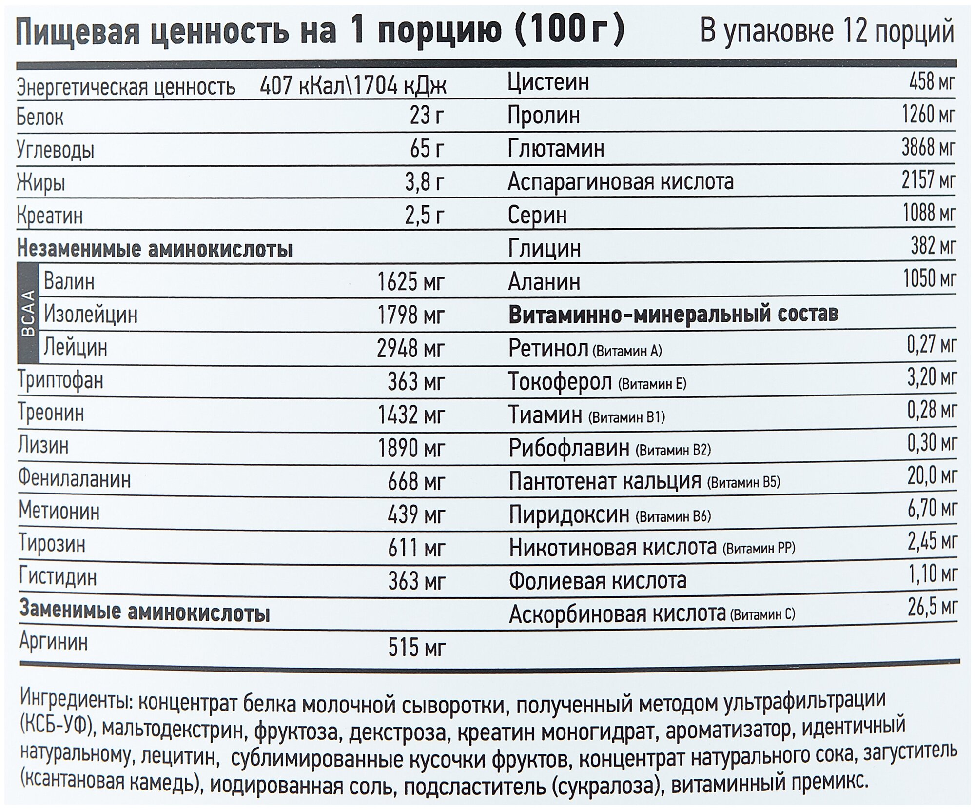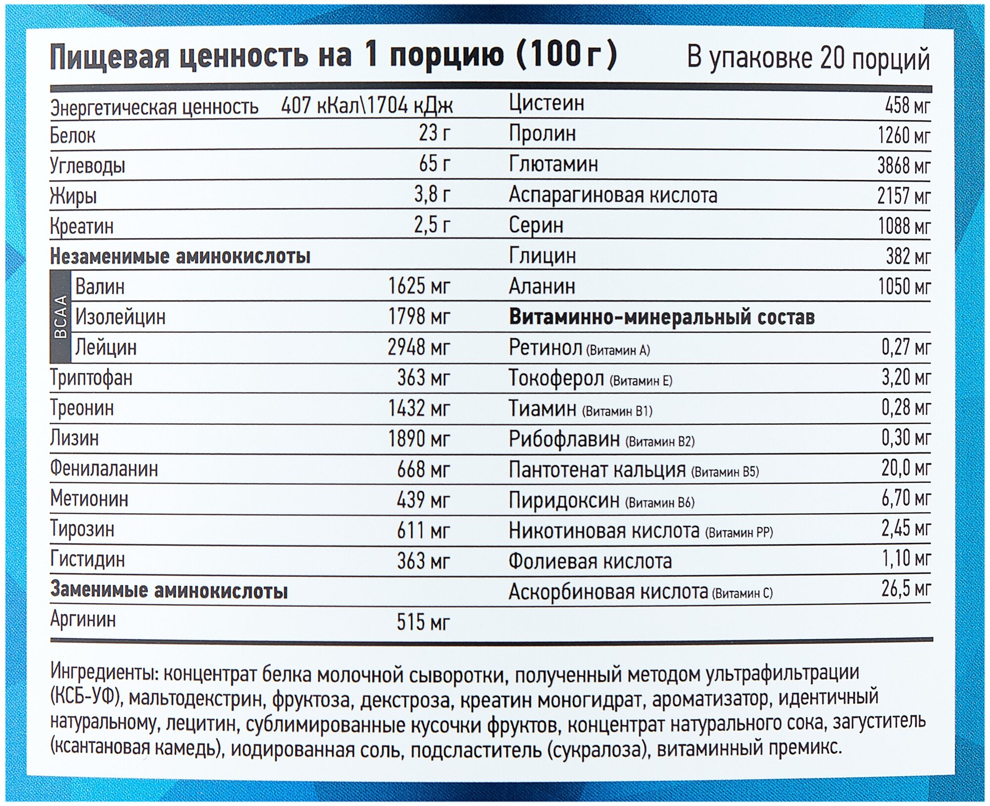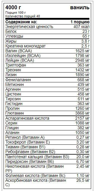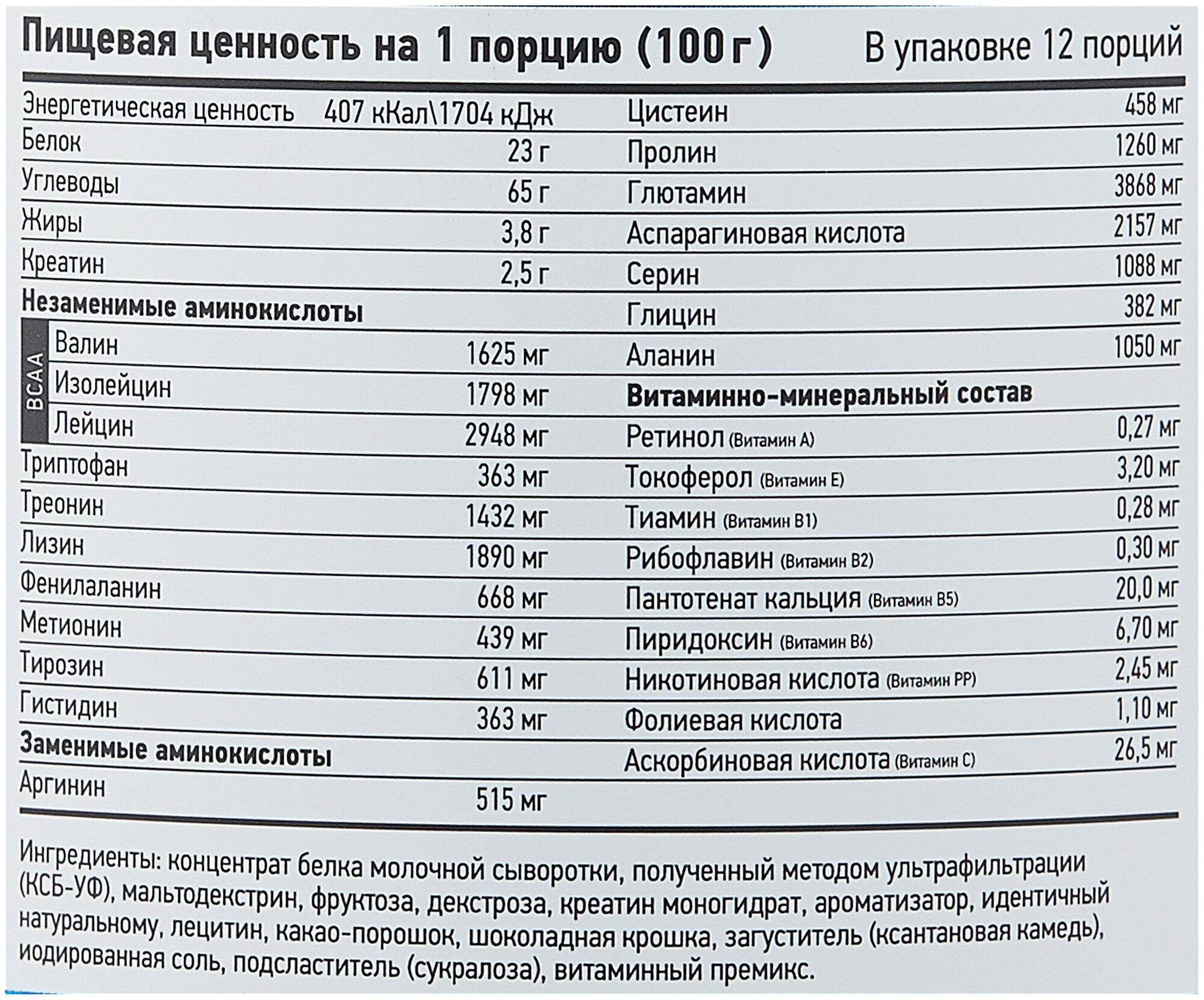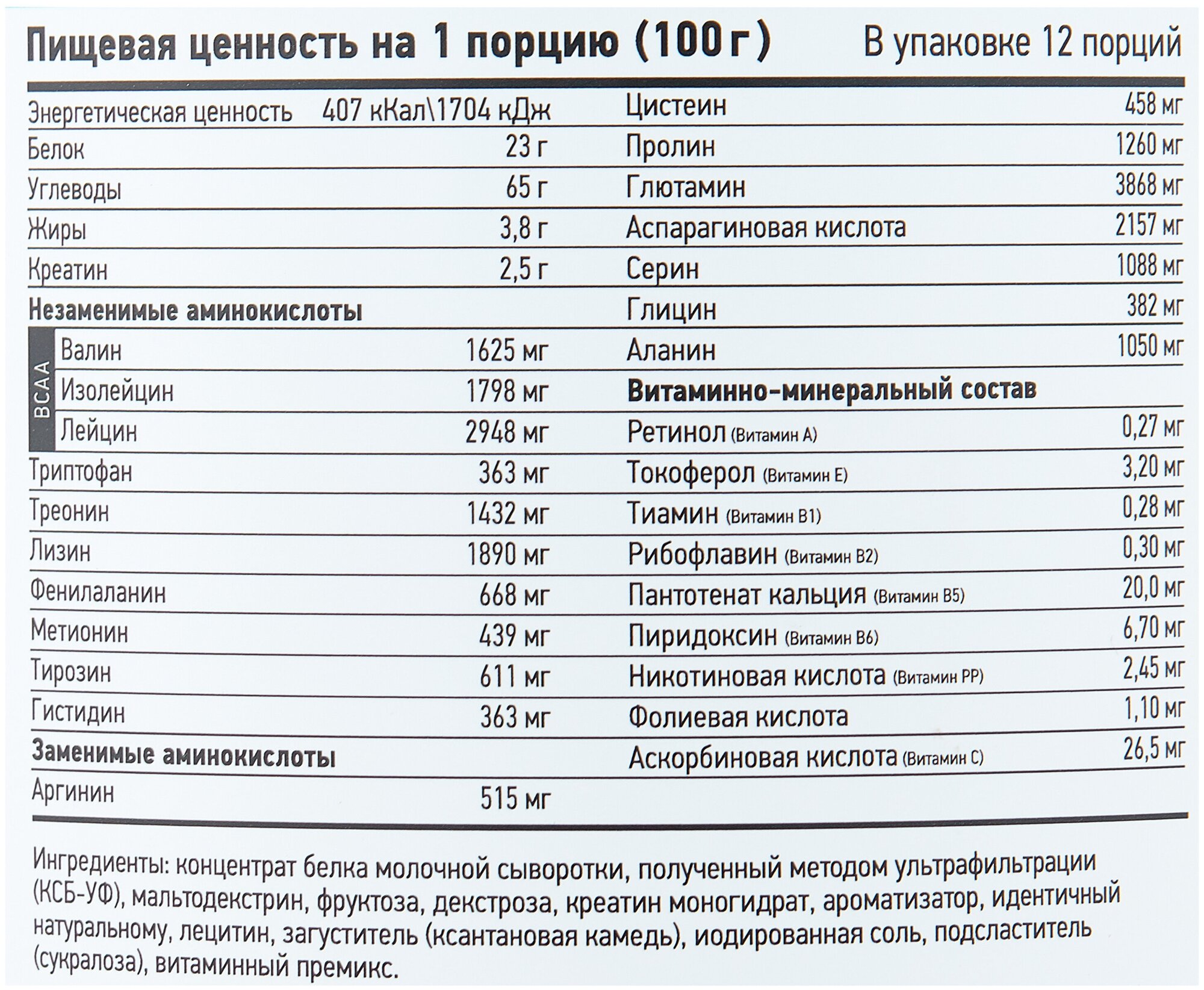 Serving Size: 100 g; serving calorie content: 407 kcal; Directions for use: For one serving, mix one and a half measuring cups of 100 g of powder with 250-500 ml of water or skim milk. Take 1-1.5 hours
