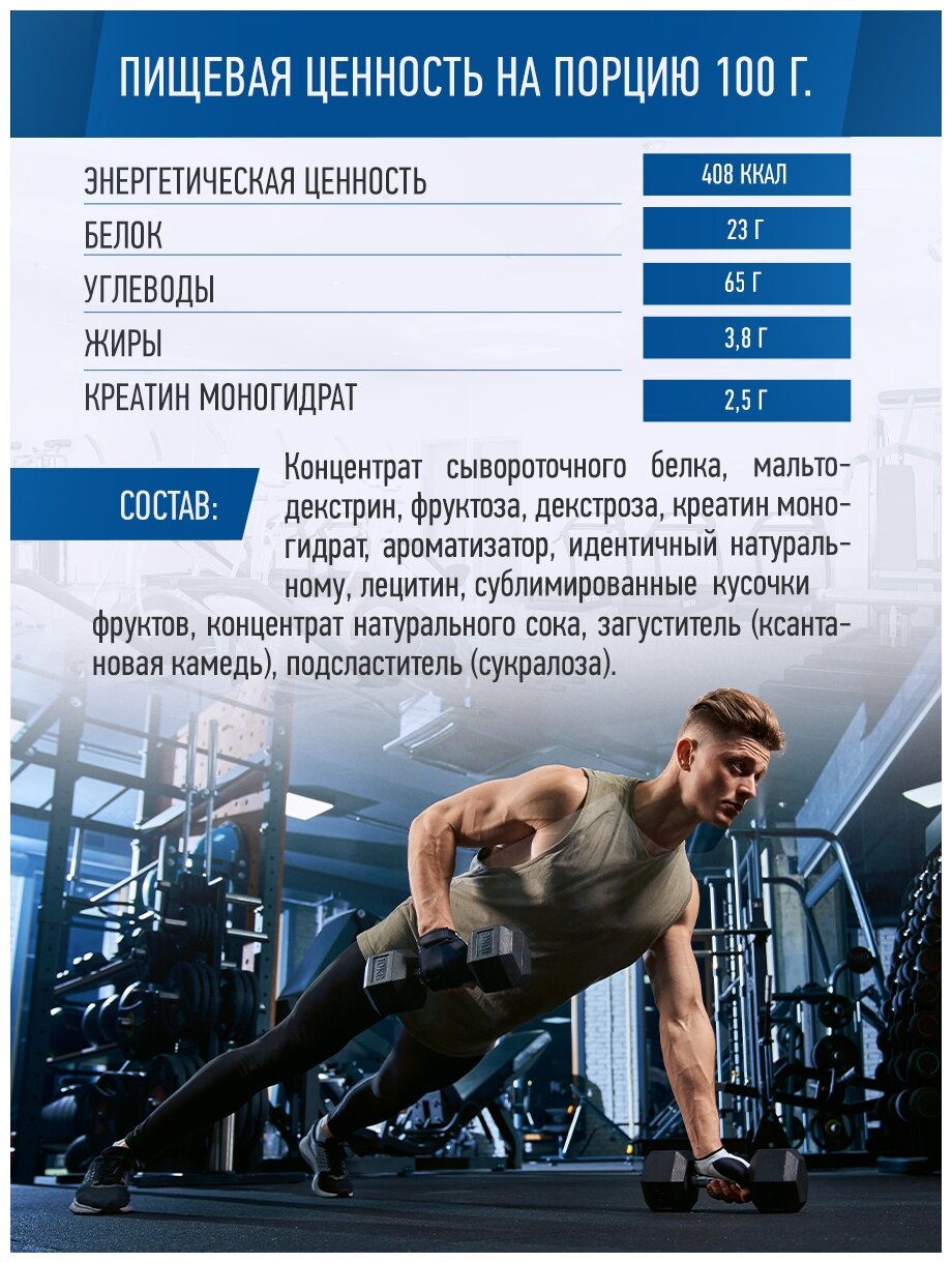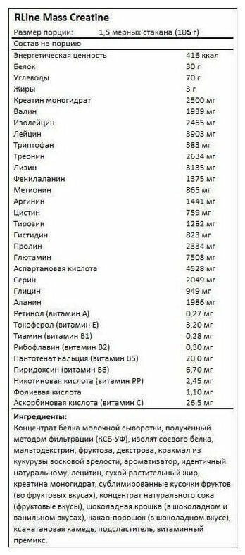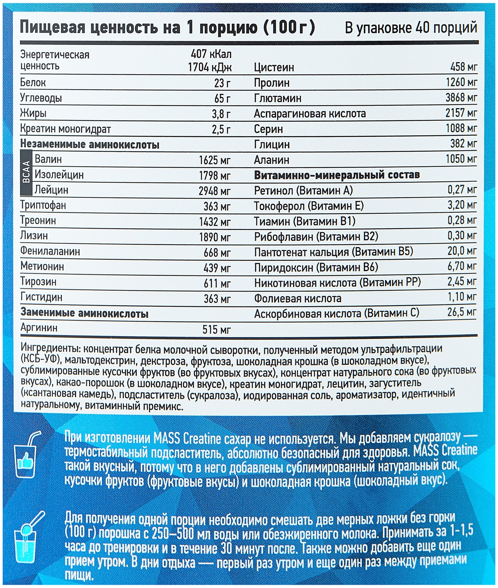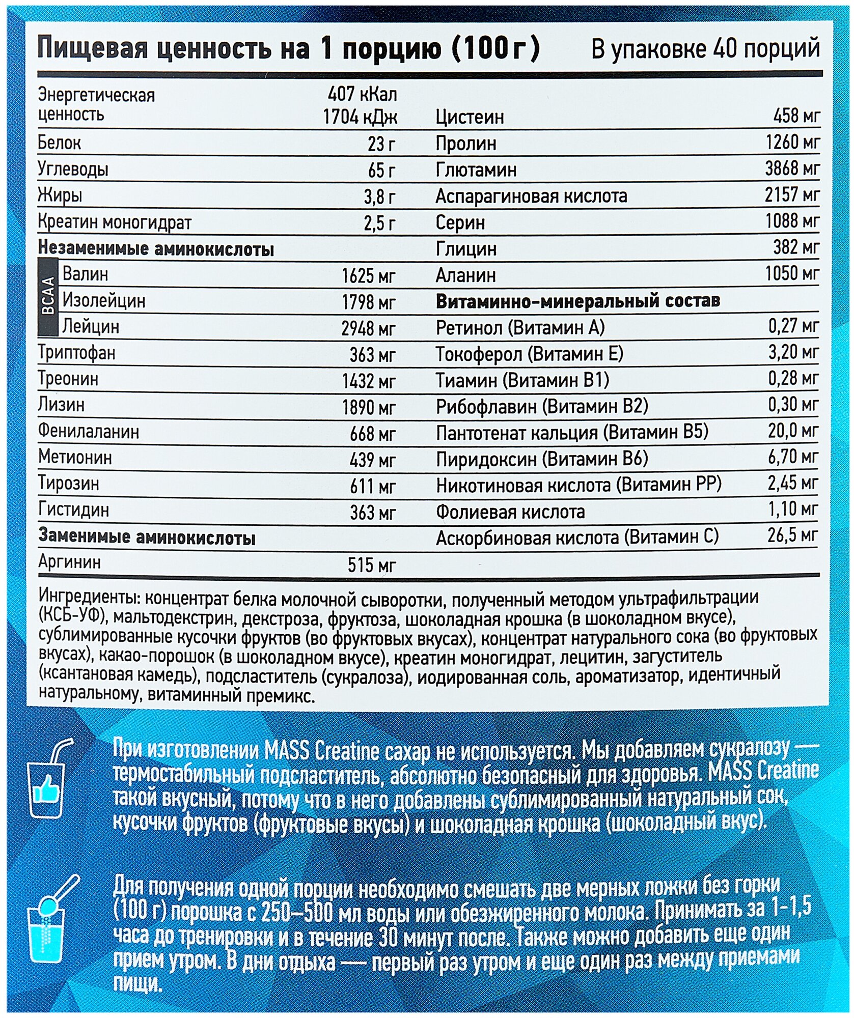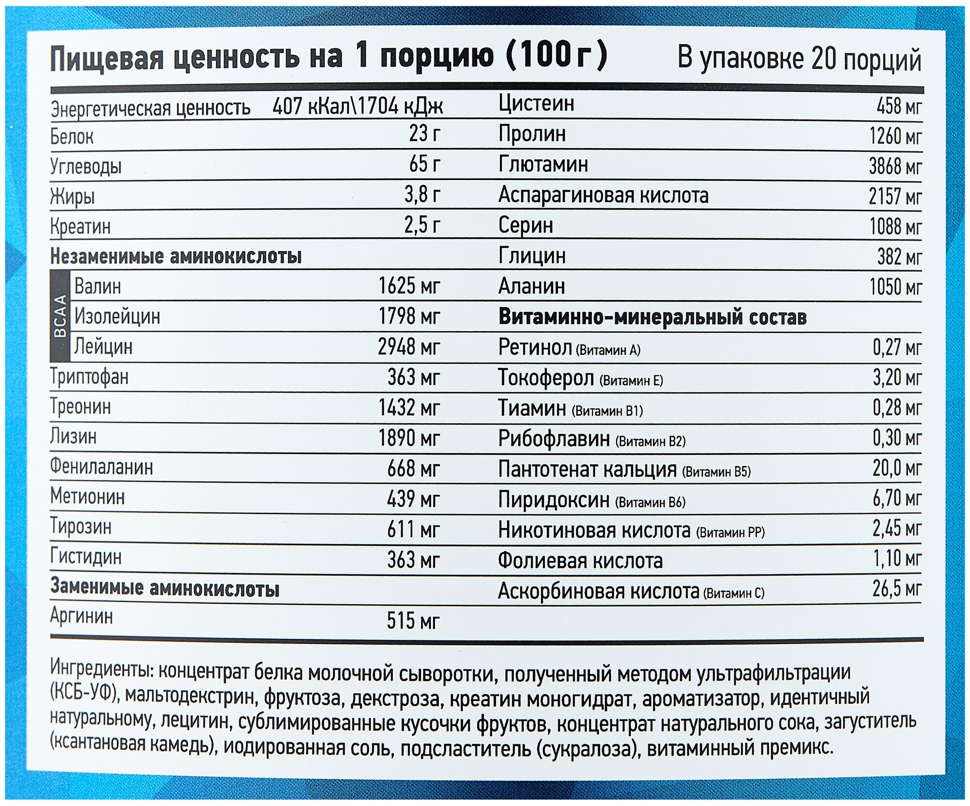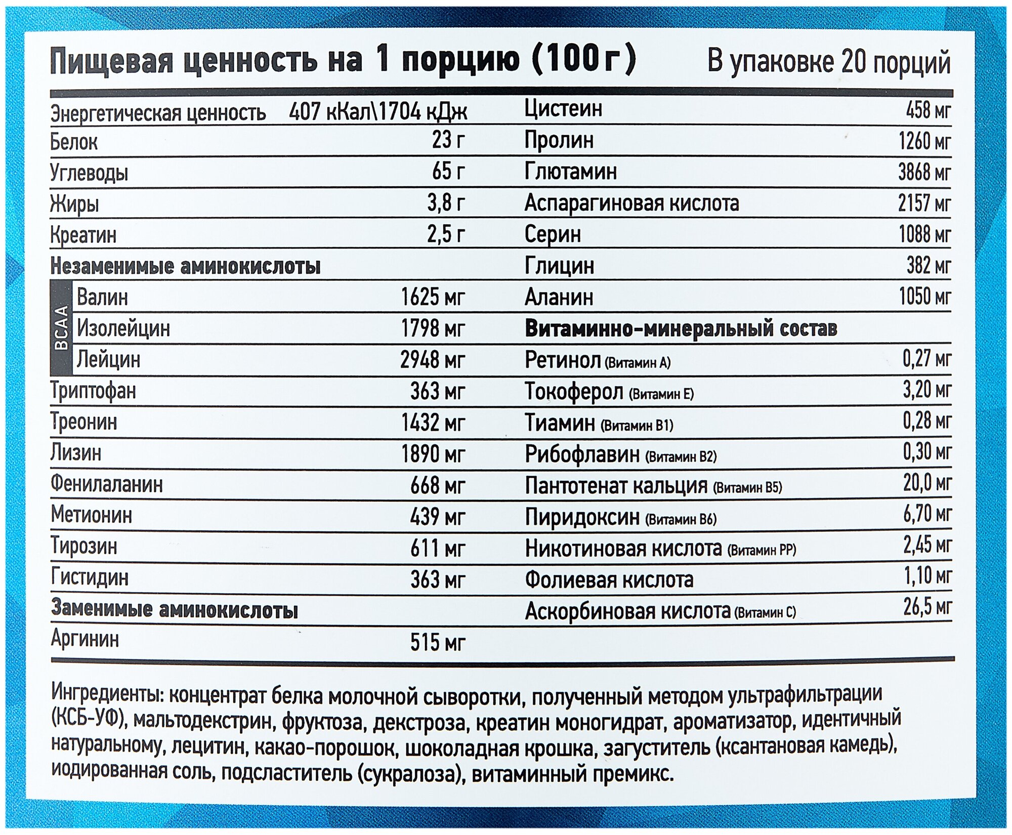 Serving Size: 100 g; serving calorie content: 407 kcal; Directions for use: For one serving, mix one and a half measuring cups of 100 g of powder with 250-500 ml of water or skim milk. Take 1-1.5 hours