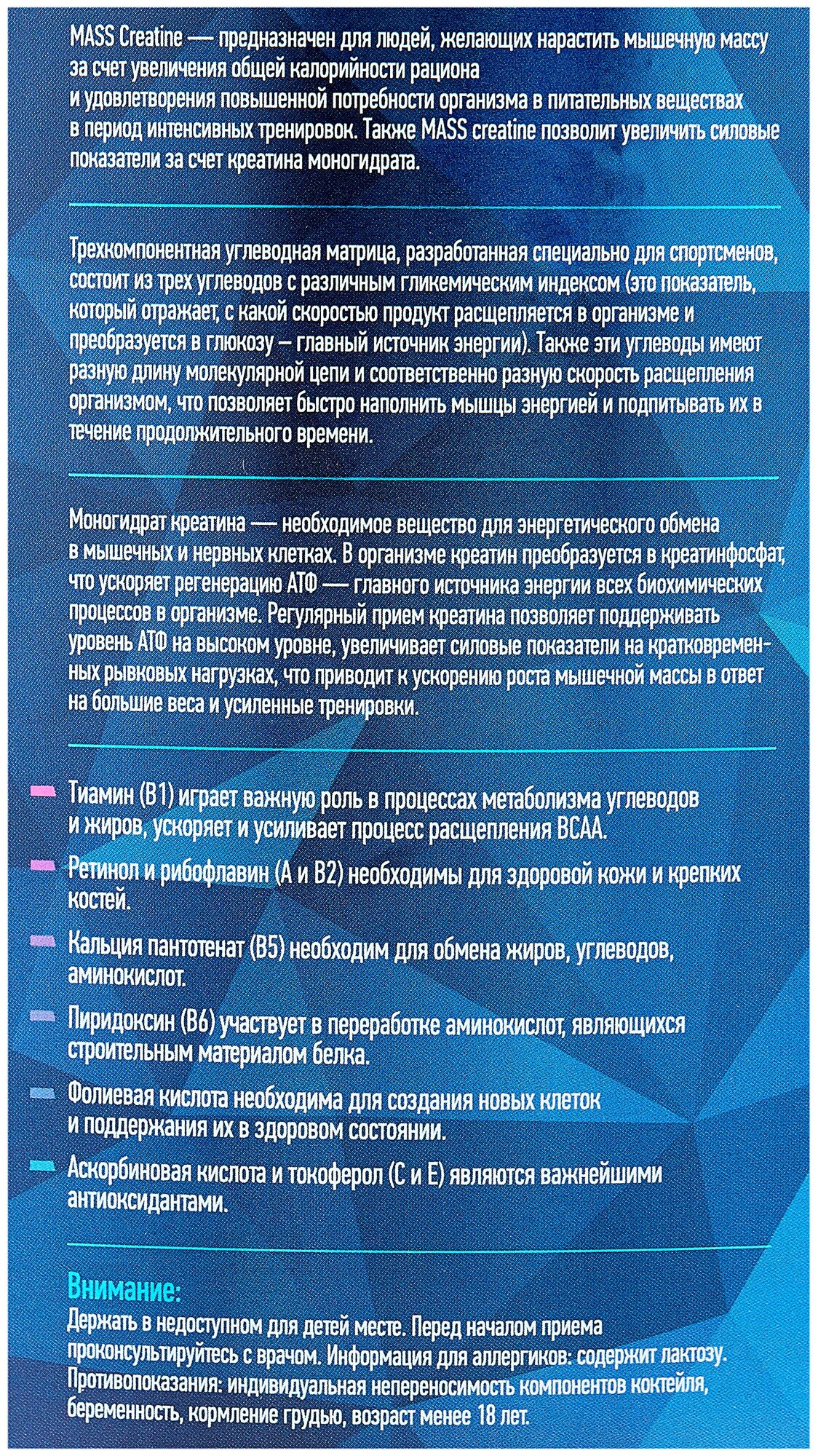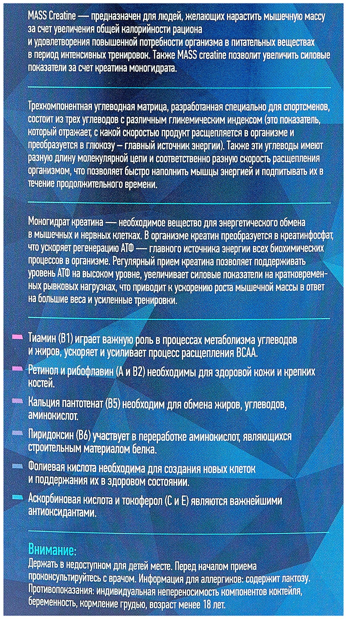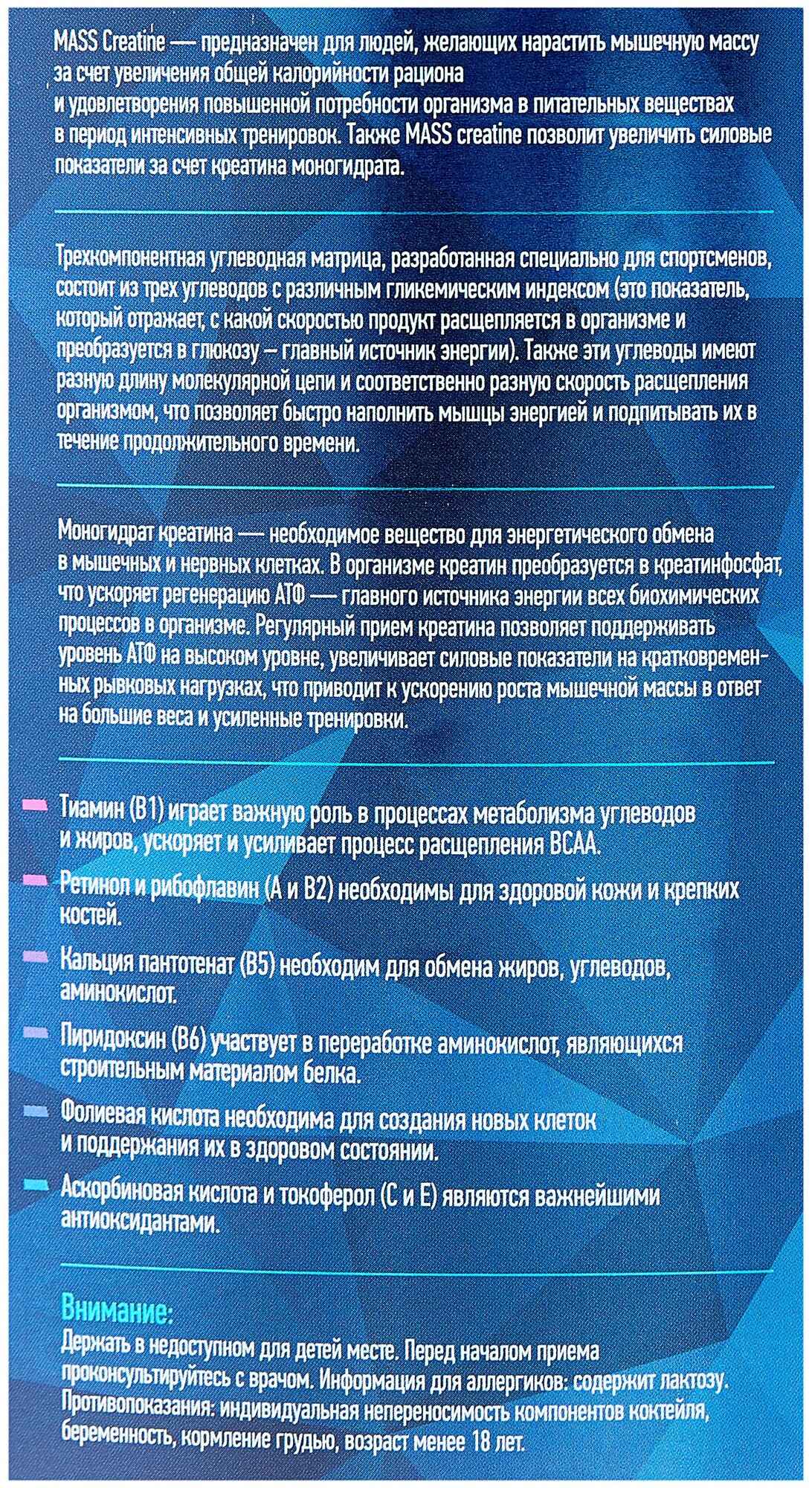Type: high protein, type of protein: whey concentrate, calories per 100 g: 407 kcal, dietary features: no aspartame, no lactose, no saccharin, no sucralose, vegetarian, contains maltodextrin