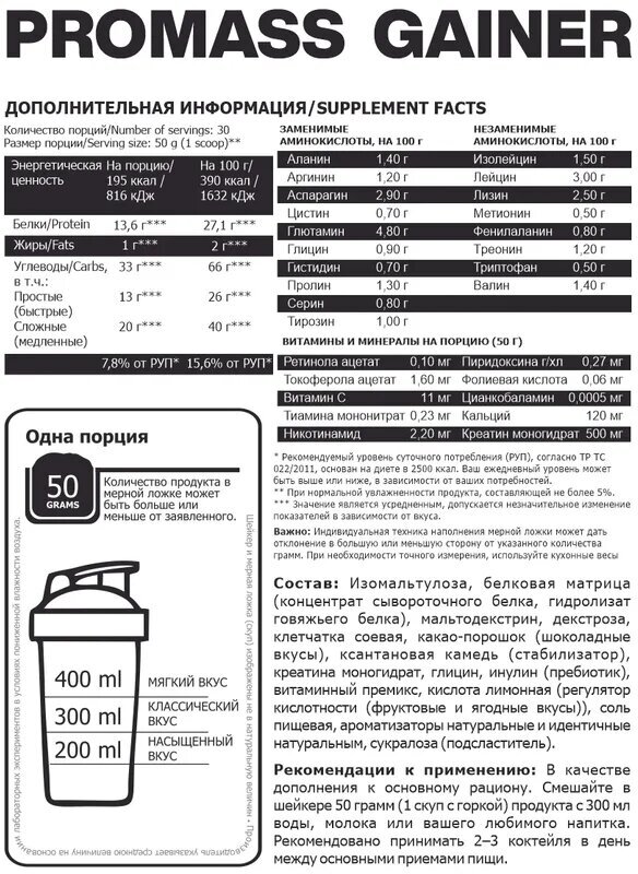 Type: high protein, type of protein: whey concentrate, calories per 100 g: 386 kcal, dietary features: no aspartame, no gluten, contains maltodextrin, contains sucralose