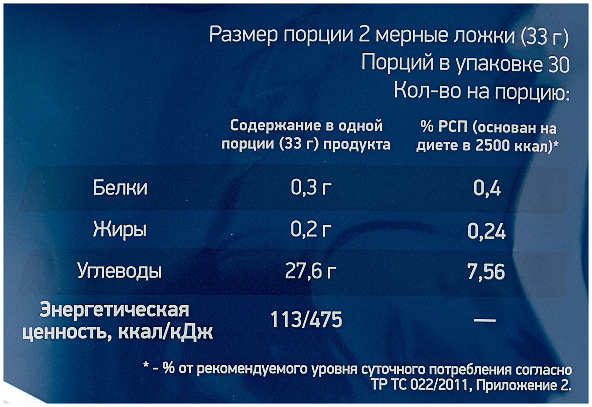 Type: full carbohydrate, calories per 100g: 342.39 kcal, dietary features: no aspartame, no maltodextrin, no saccharin, no sucralose, vegan