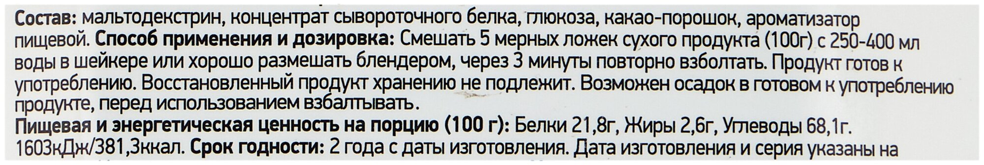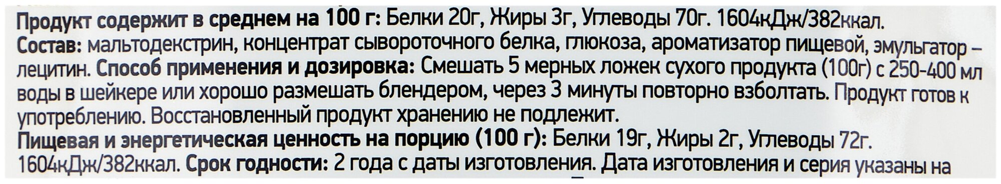 Additional Information: Serving Size: 100 g; Serving Calorie: 391 kcal; recommendations for use: Mix 100 g 5 measuring spoons with 250-400 ml of water in a shaker or mix well with a blender, shake again after 3 minutes.; composition: maltodextrin,