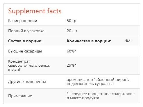 Serving Size: 50 g; composition: instantized whey protein concentrate, hydrolytic agglomerated amylocectin, apple pie flavor, sweetener sucralose