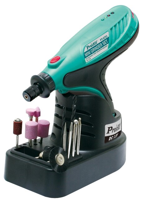 Collet chuck with a diameter of 3.2 mm; stand; charger 9PT-5721-CF; collet clamp Ø2.4 1 pc., Ø3.2 1 pc.; high speed drills 3/32” Ø2.4 2 pcs, 1/8” Ø3.2 1 pc; engraving nozzle Ø2.4 2 pcs.; diamond nozzle Ø3.2 2 pcs.; n